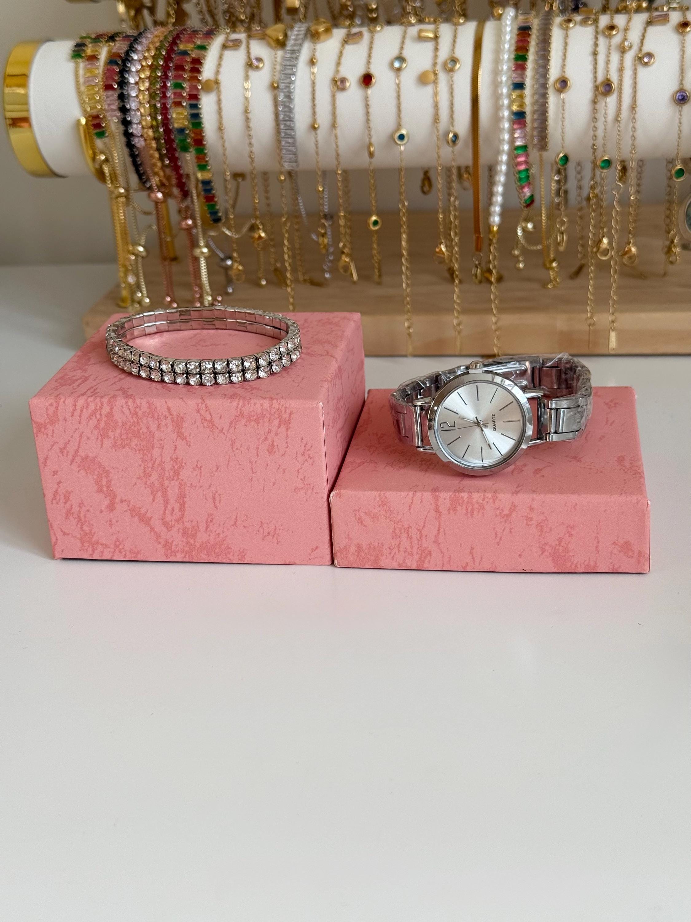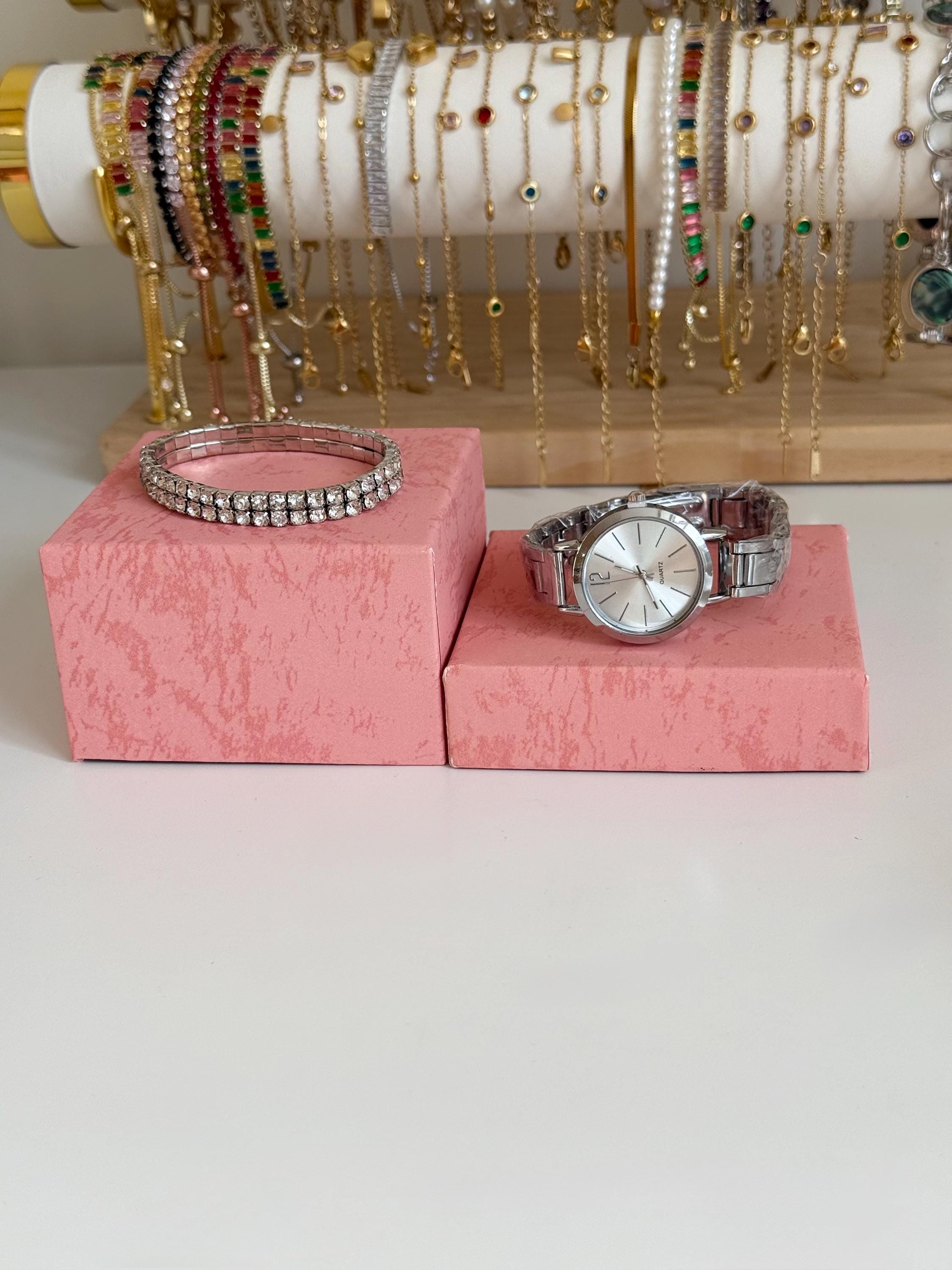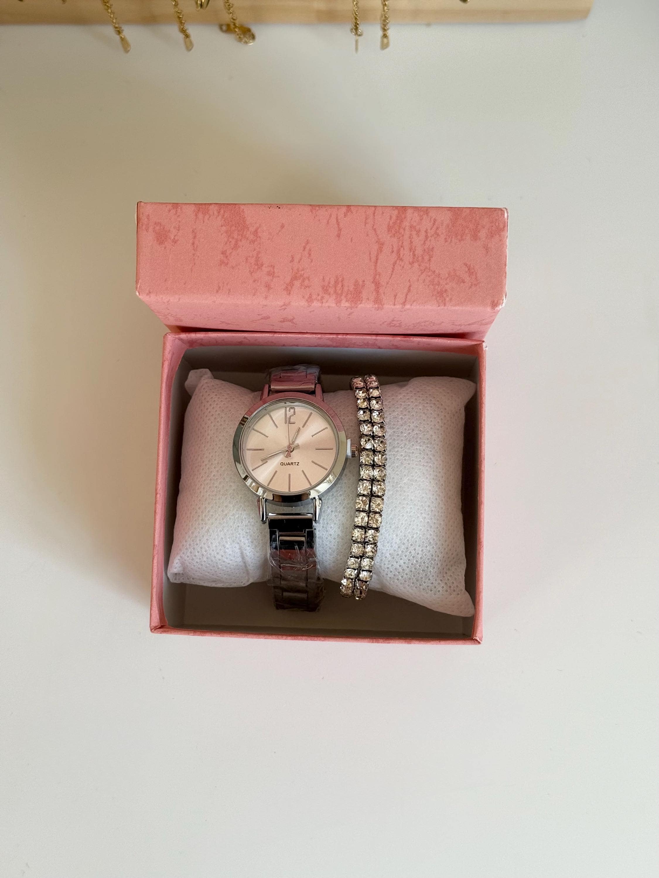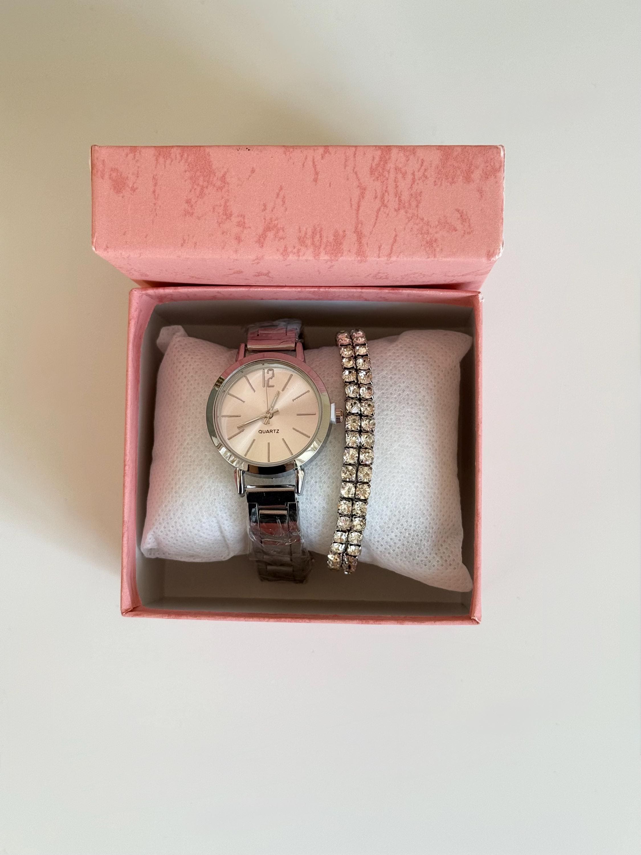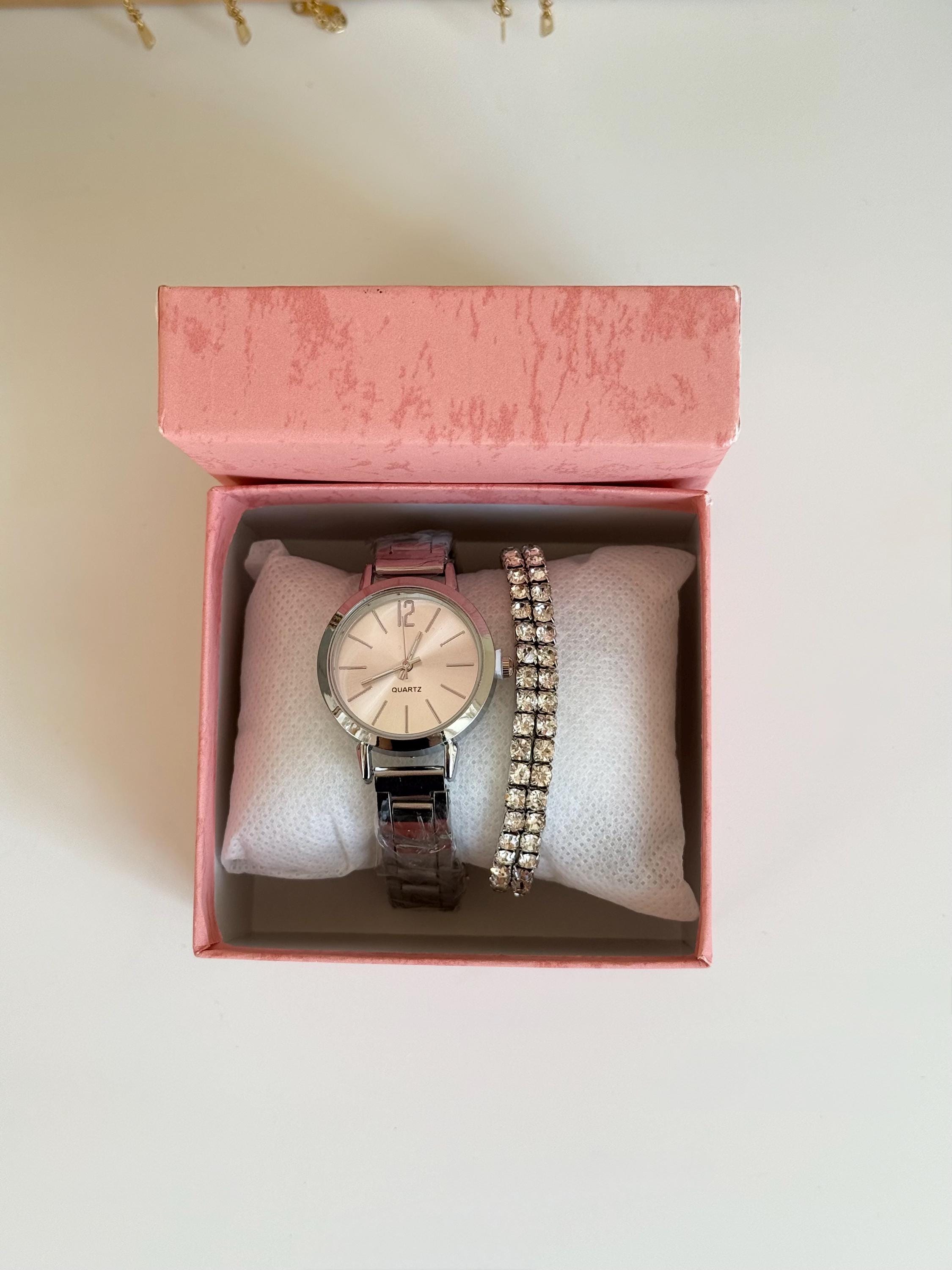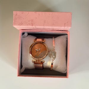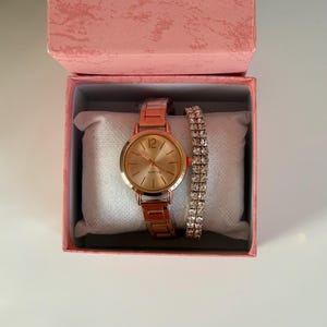 Rose Gold Watch and Crystal Bracelet Set for Her Elegant Gift Set Birthday Anniversary Women’s Gift Box✨ A beautiful rose gold watch and matching crystal bracelet set presented in a luxury pink gift box.