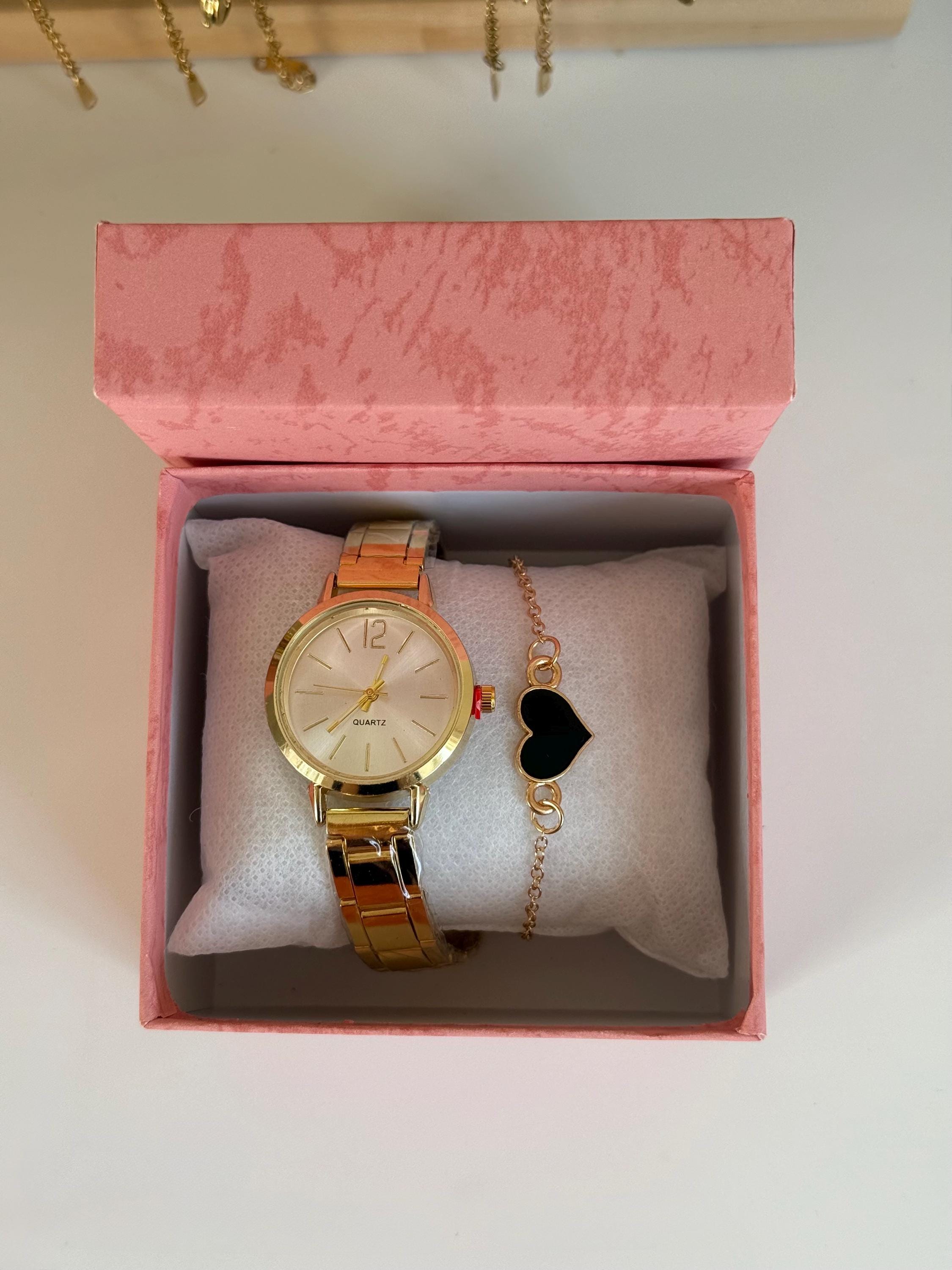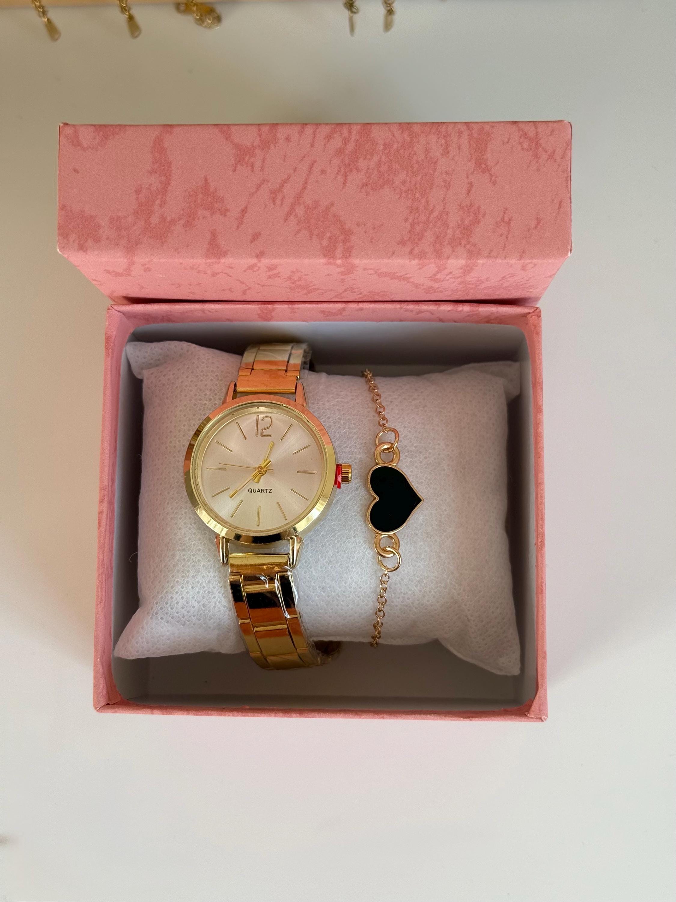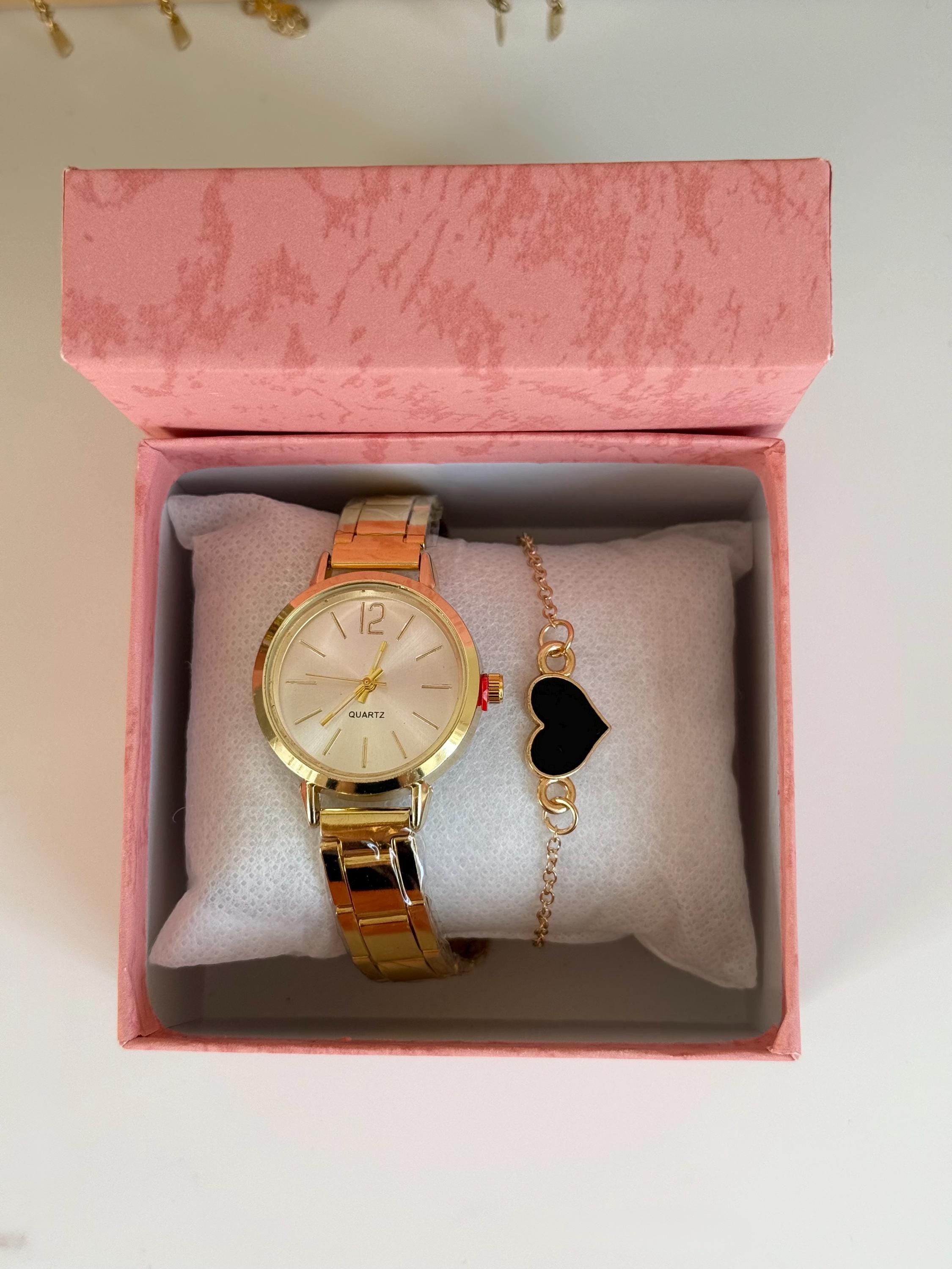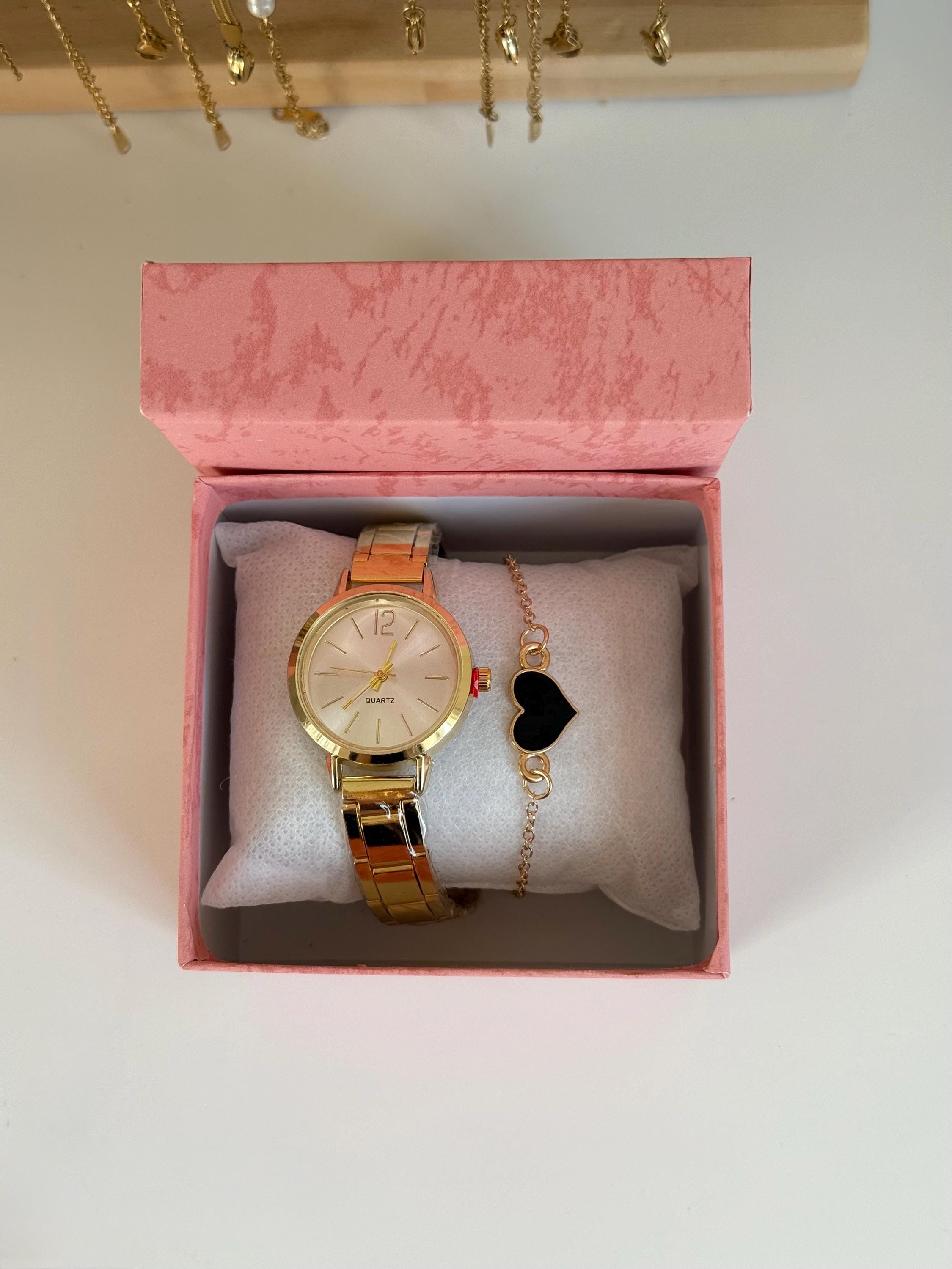 Gold Watch and Black Heart Bracelet Set for Her Elegant Women’s Gift Set Birthday Anniversary Jewellery Gift Box✨