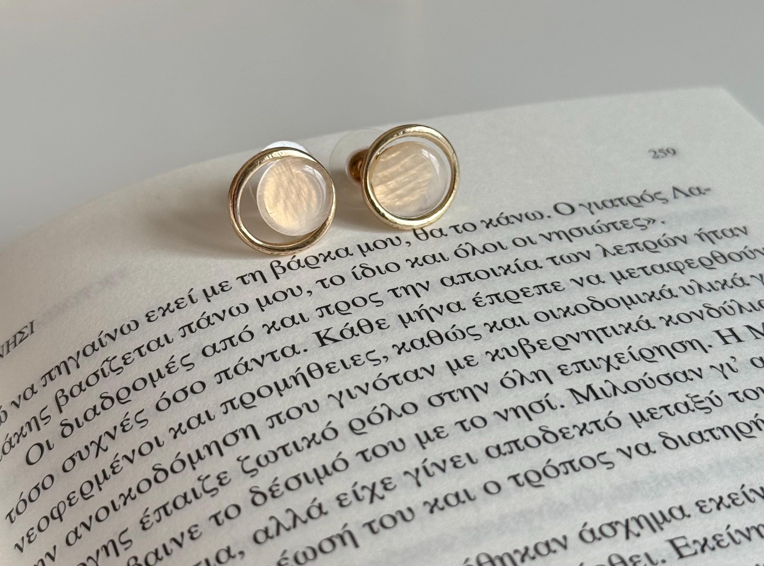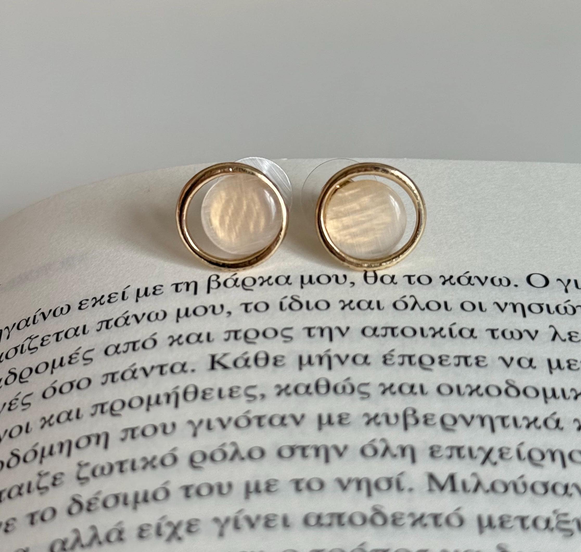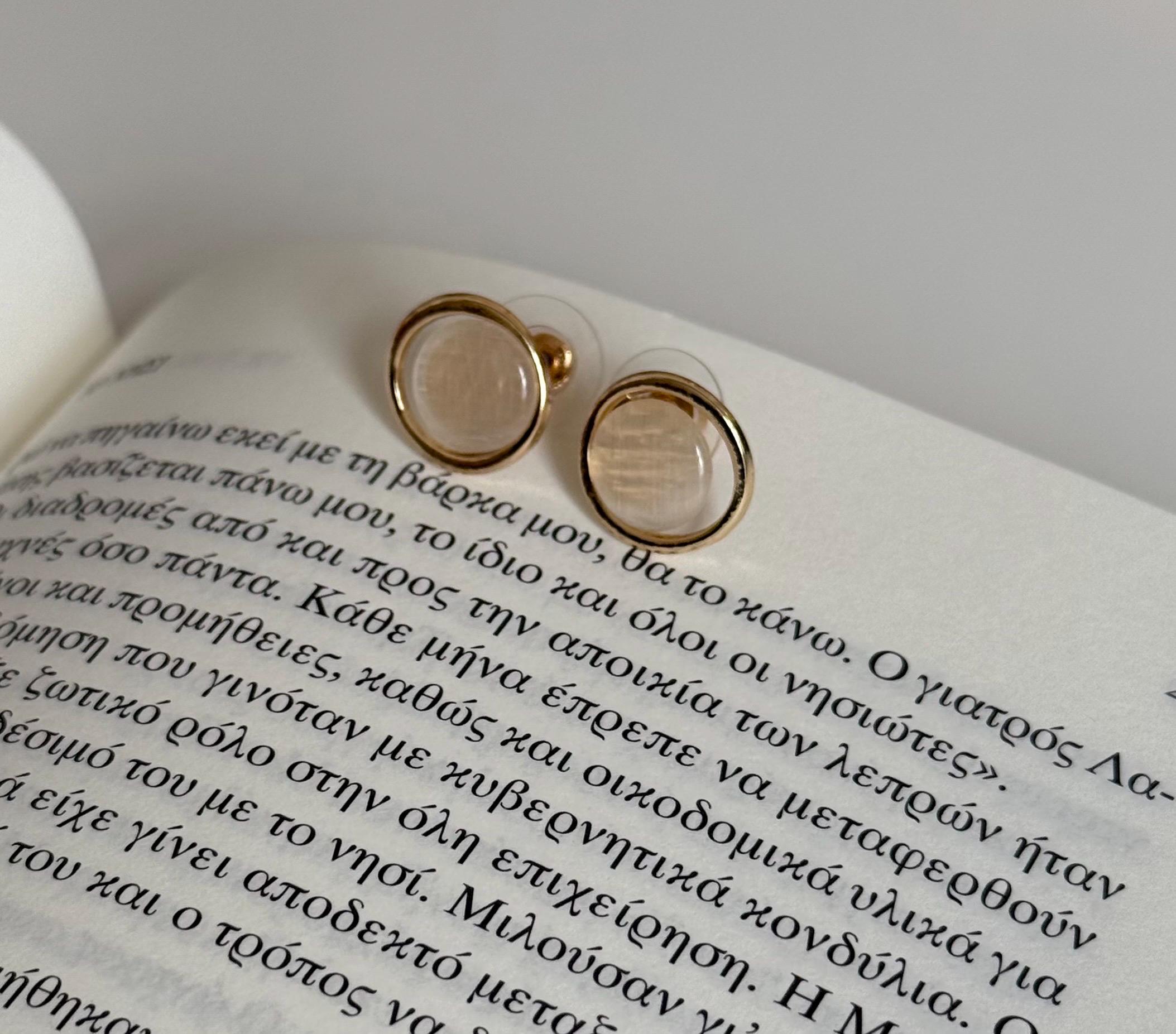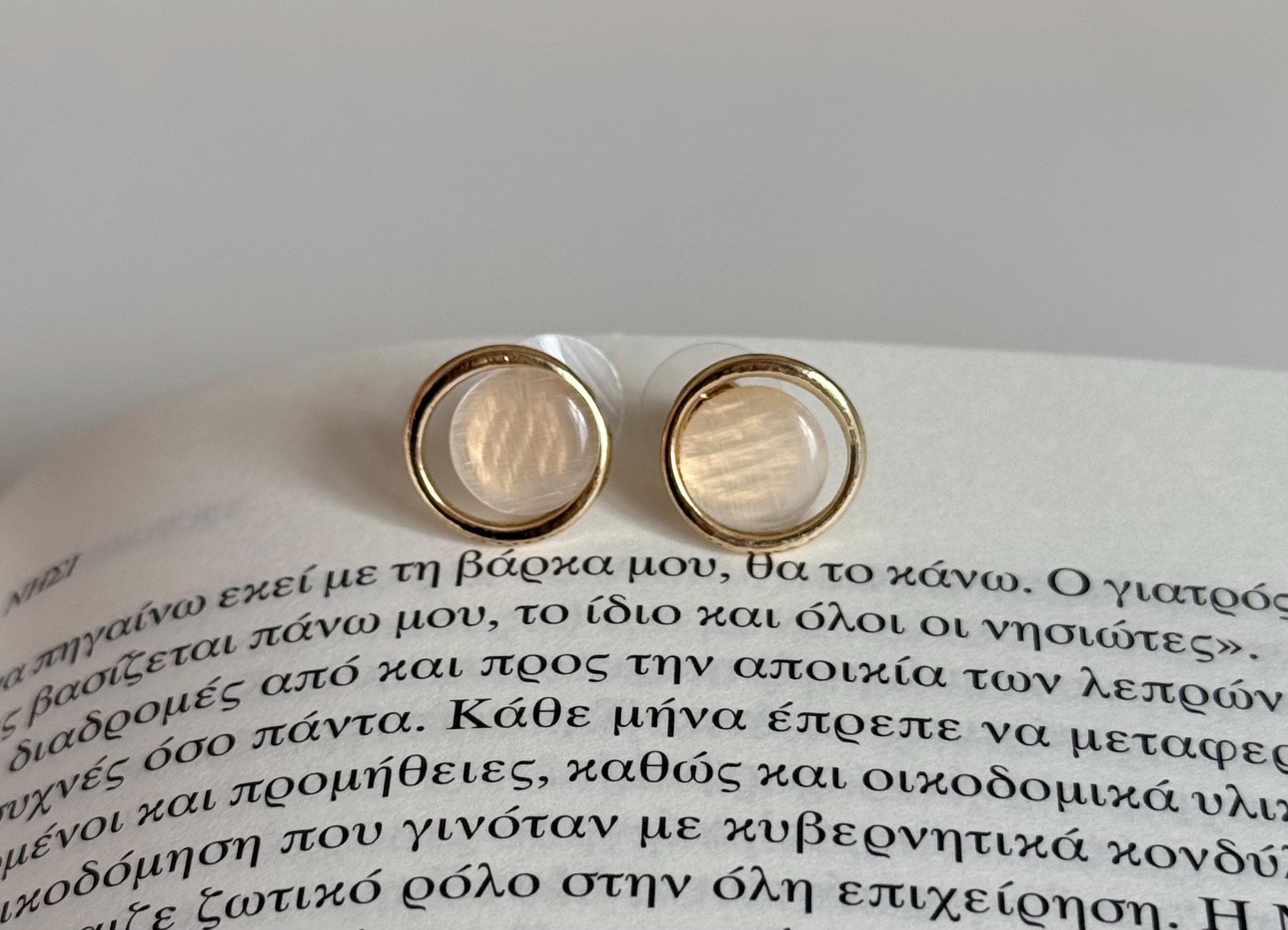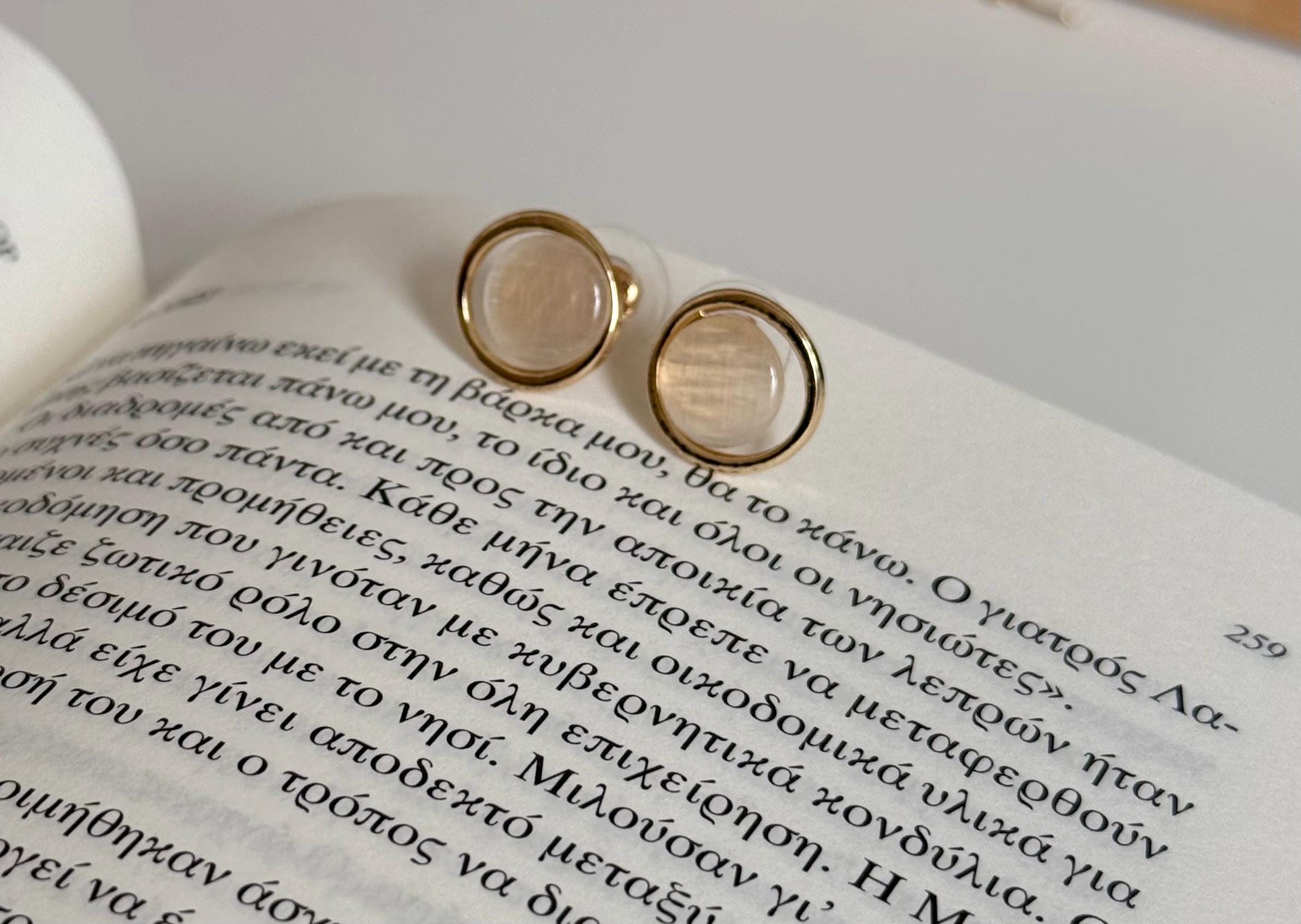 Elegant minimalist stud earrings featuring a soft moonstone-style round stone framed in a delicate gold tone setting.