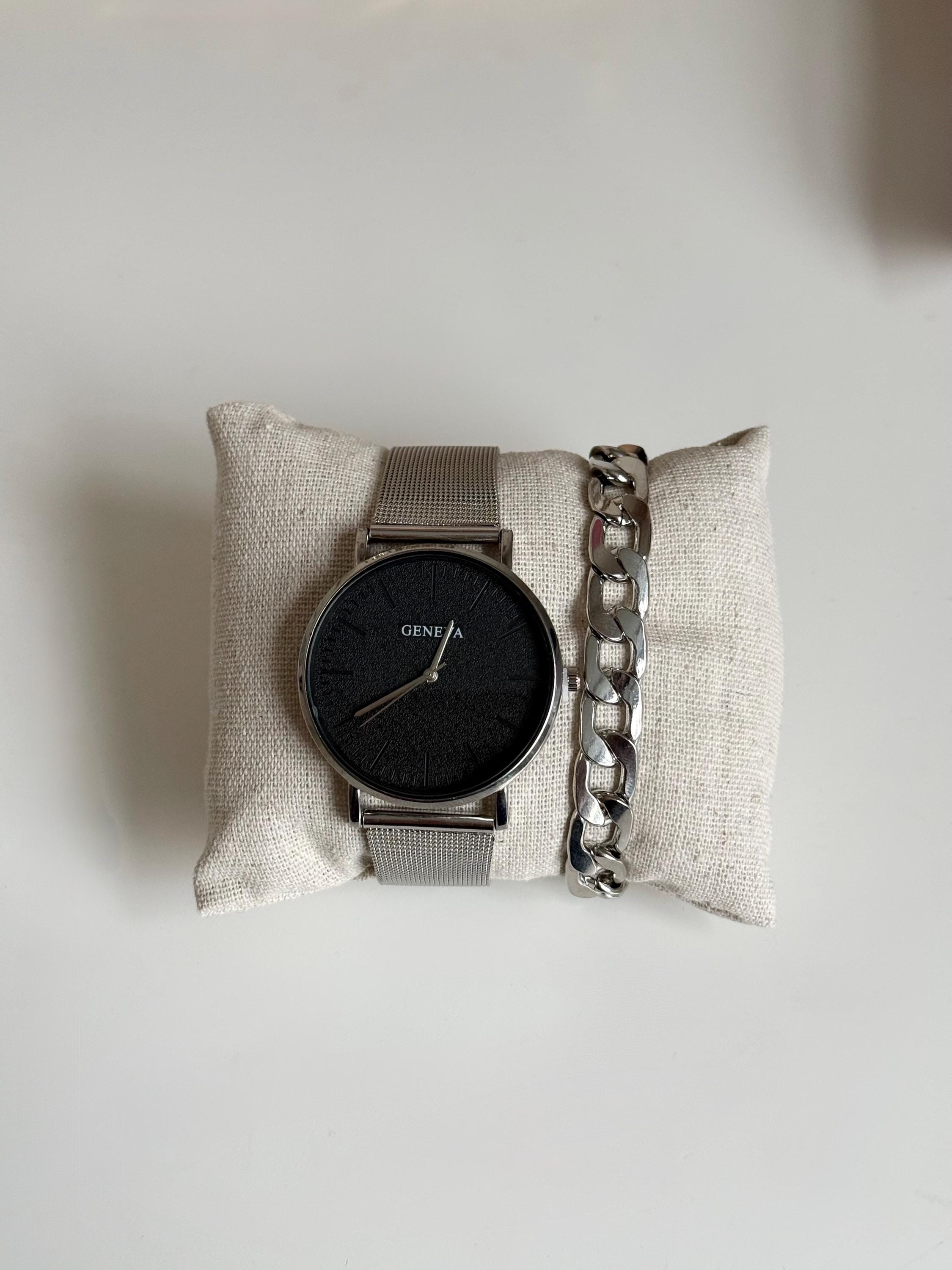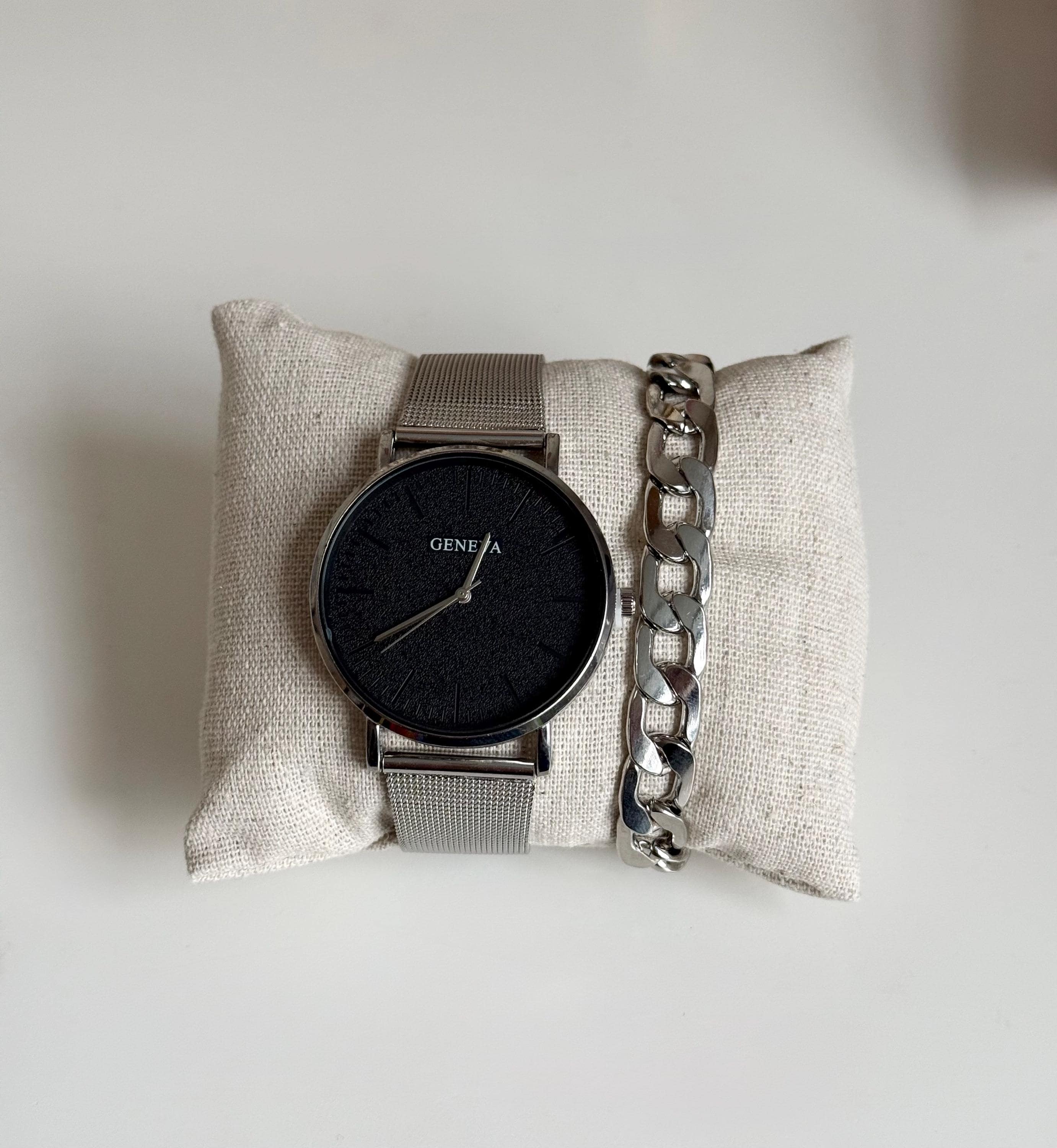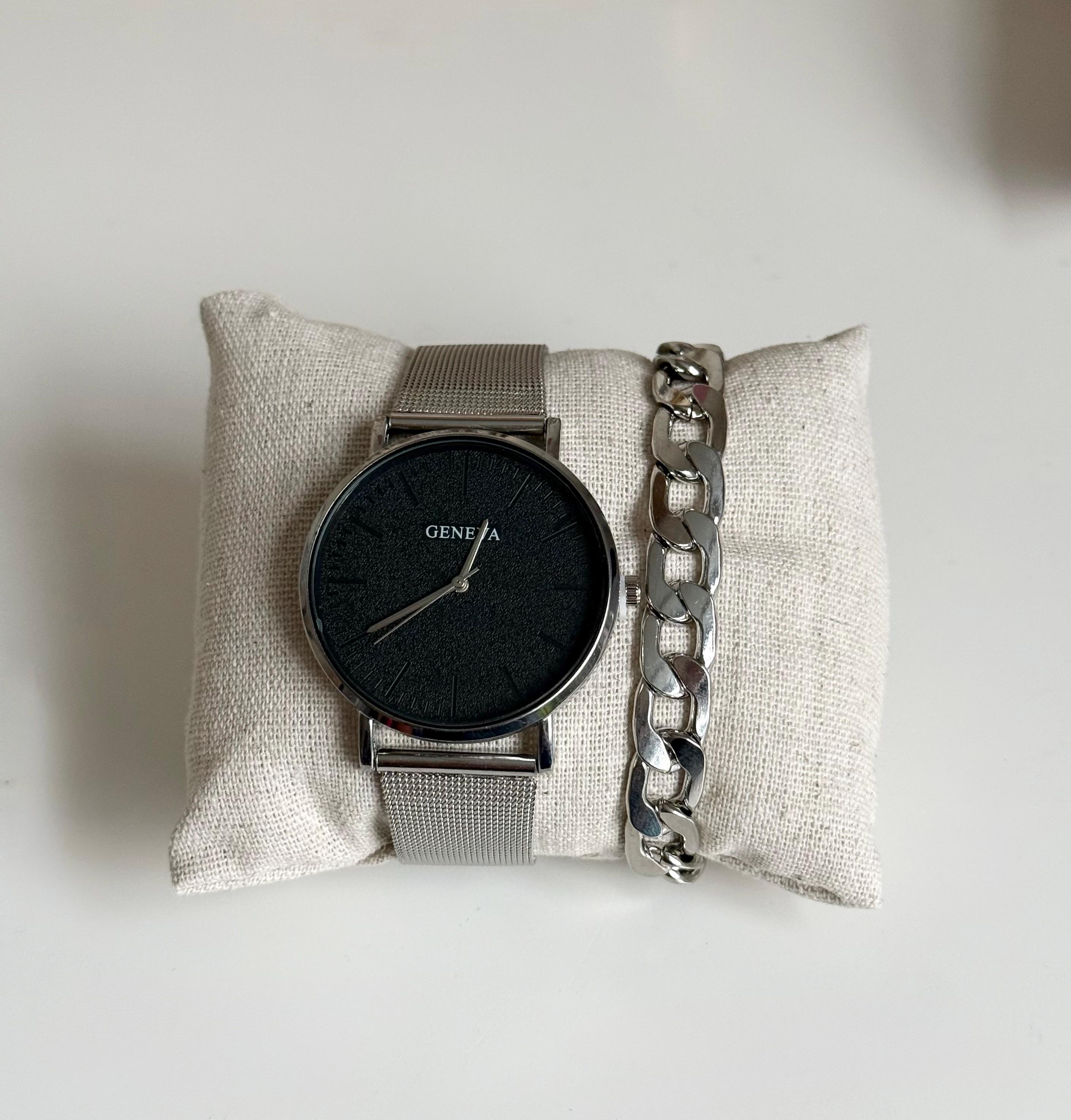Key features include: - Minimalist Geneva watch with a black dial and mesh strap - Durable silver chain bracelet with a bold design - Elegant 2-piece gift set suitable for any occasion - Versatile style that pairs well with casual and formal outfits - Ideal gift for birthdays, anniversaries, or special milestones