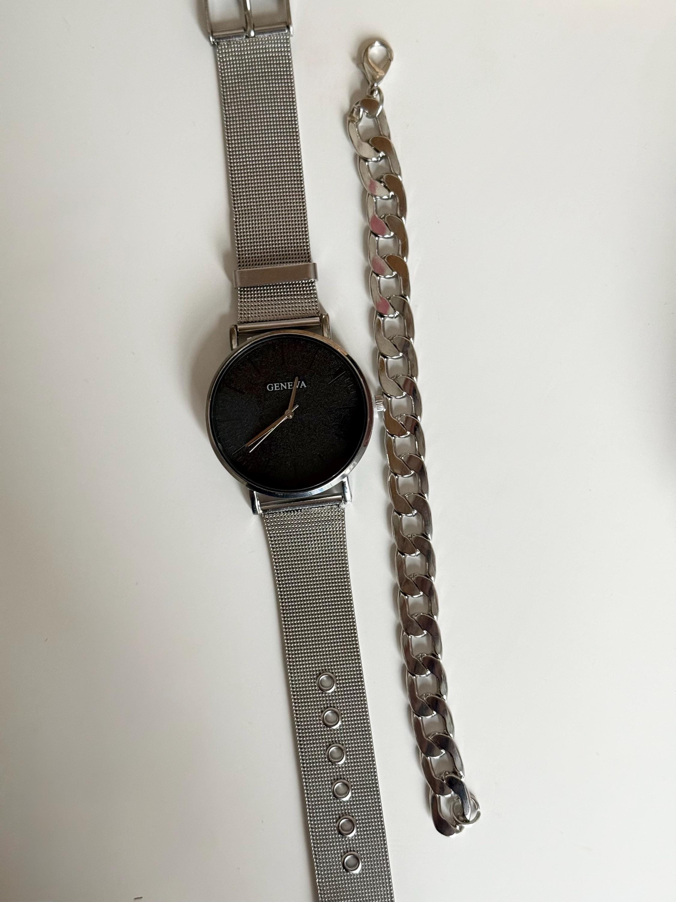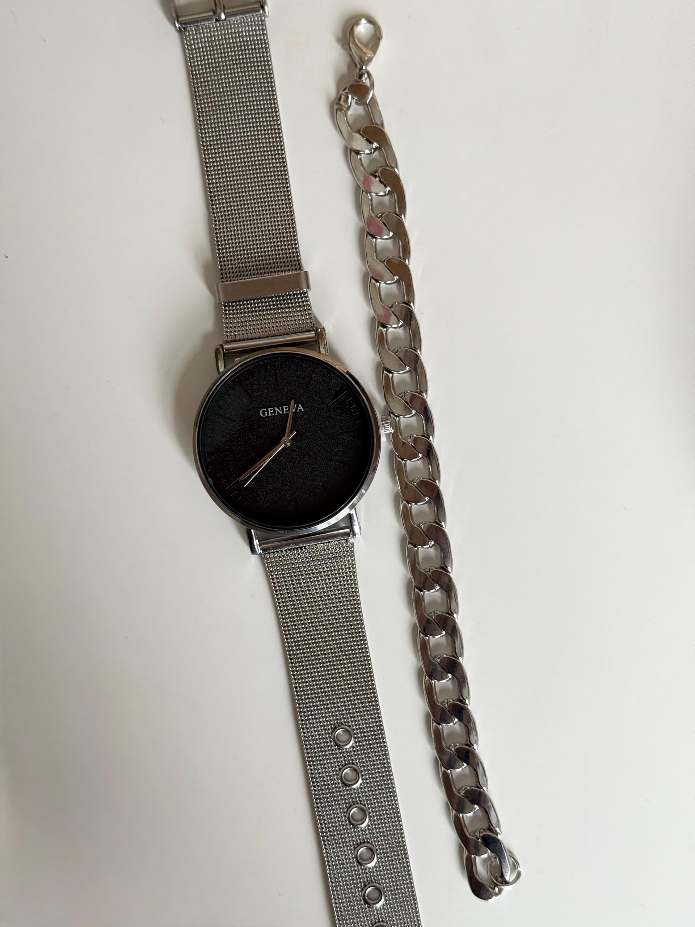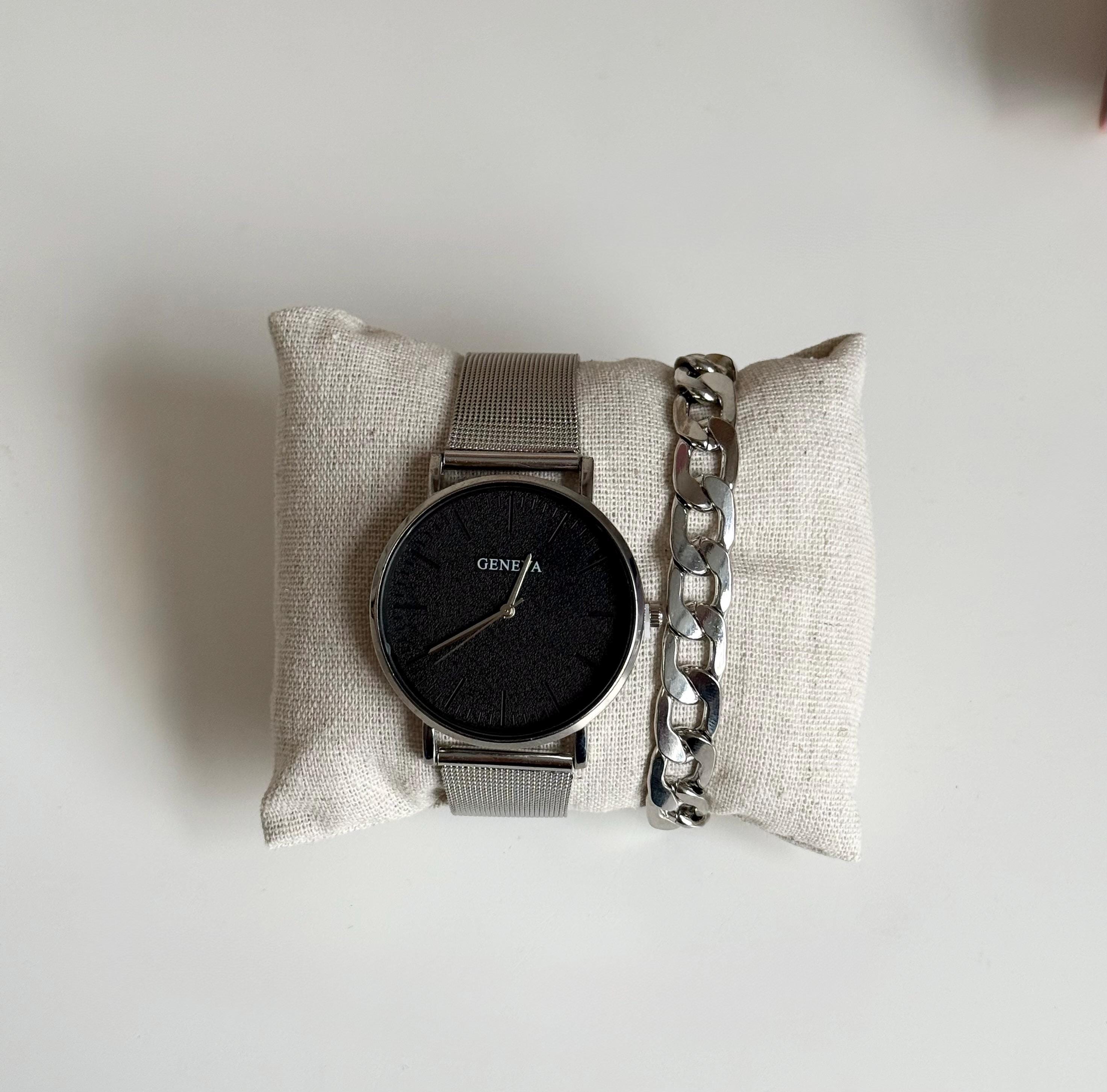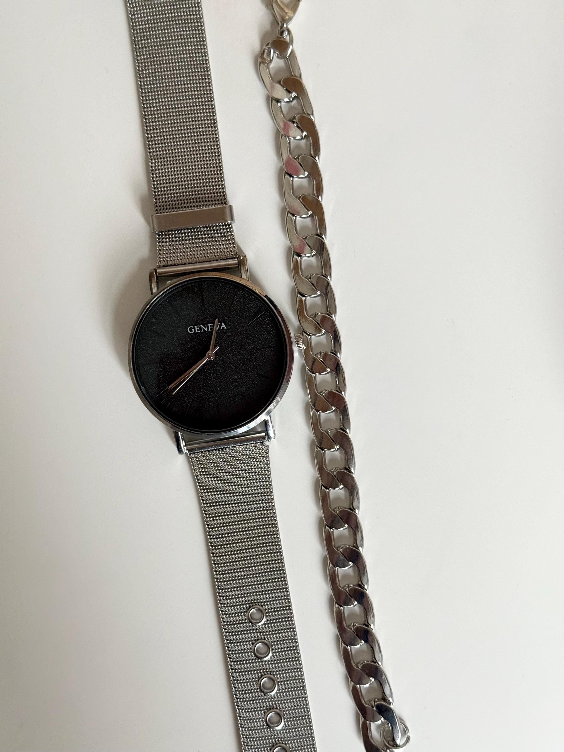 The minimalist Geneva watch showcases a sleek black dial paired with a modern mesh strap, creating a clean and versatile look that complements any outfit. The watch’s simple yet refined design makes it ideal for casual, business, or formal attire. Alongside, the bold chain bracelet adds a touch of masculinity and style, making this set a standout accessory.