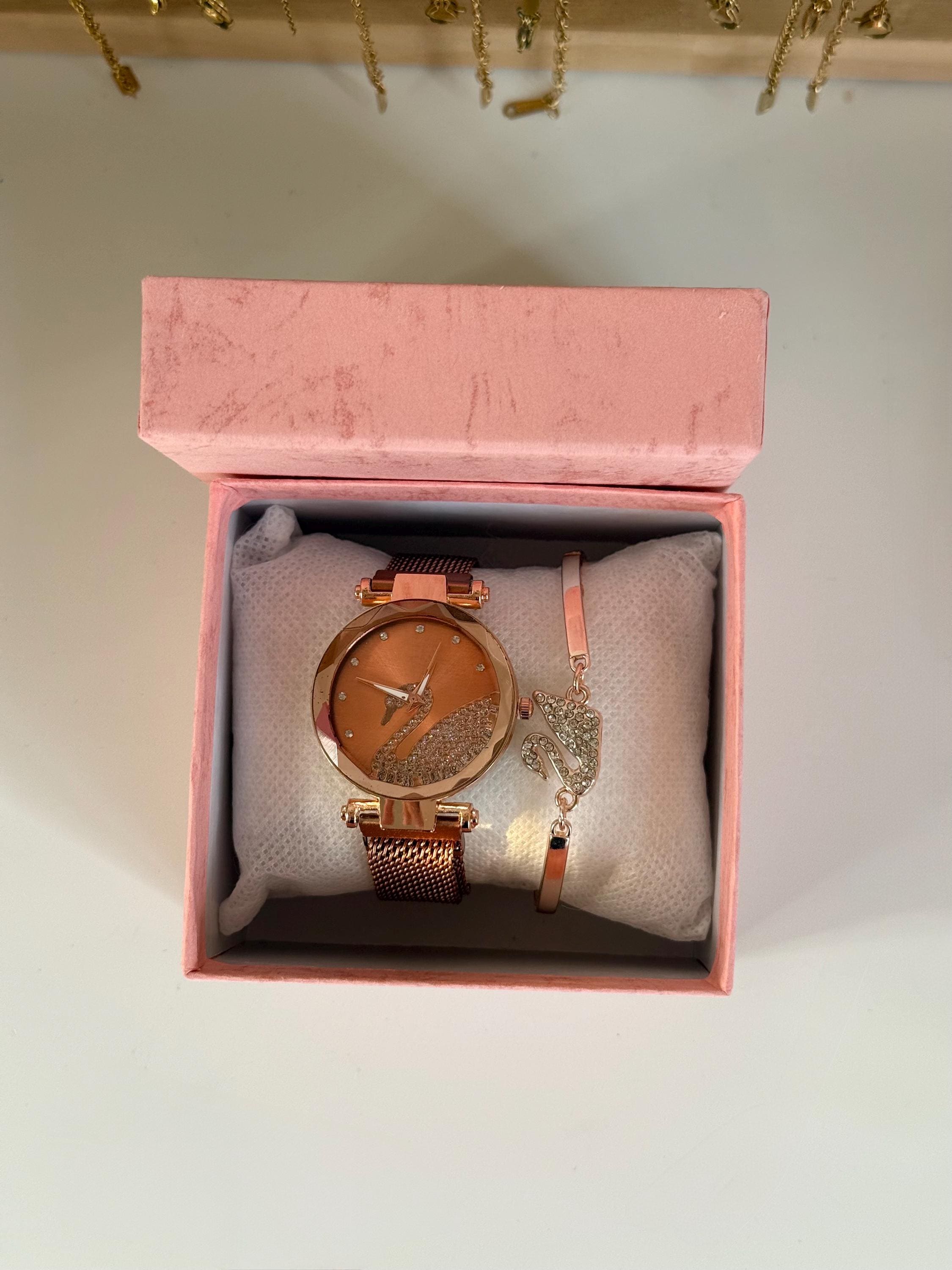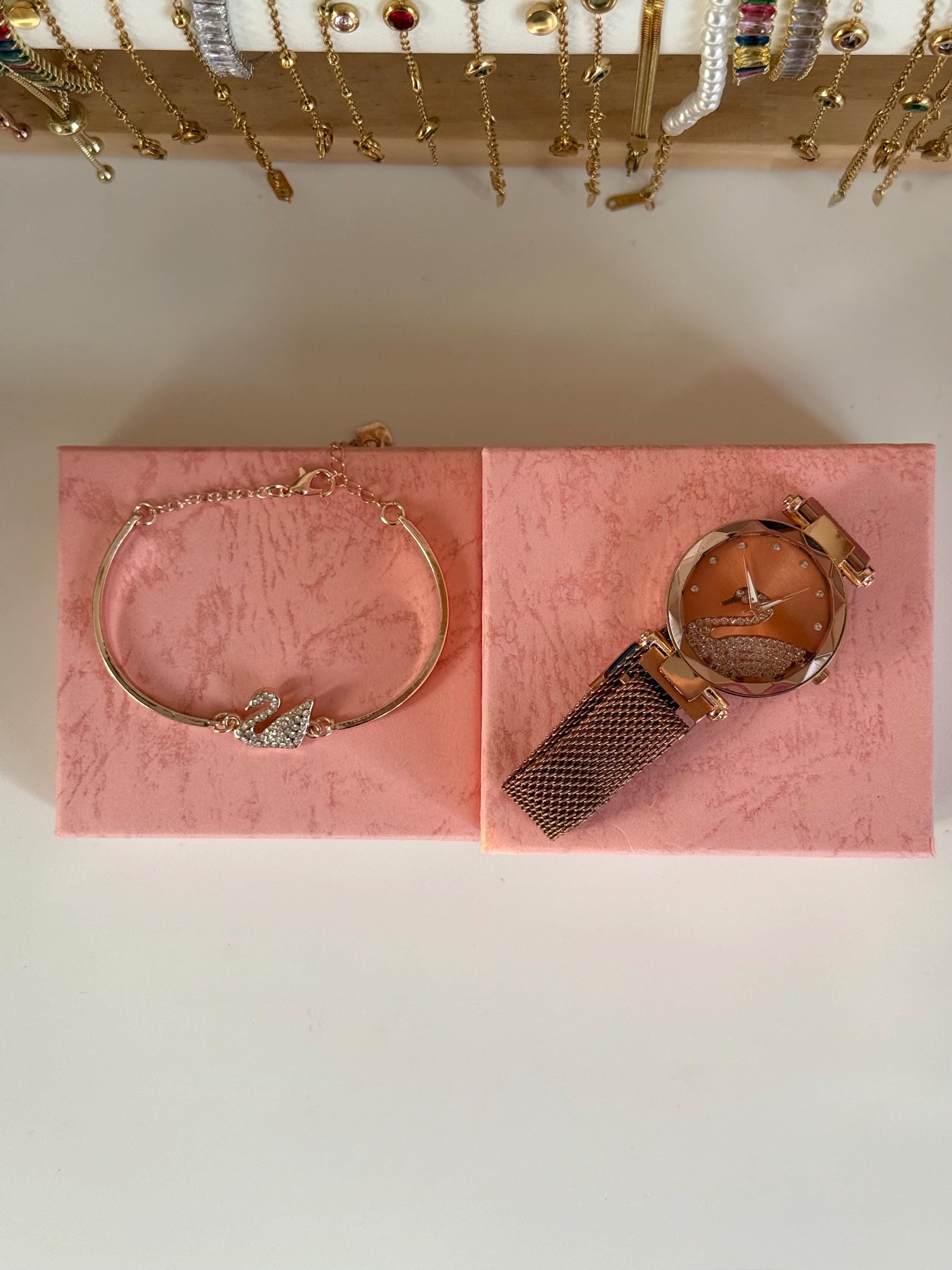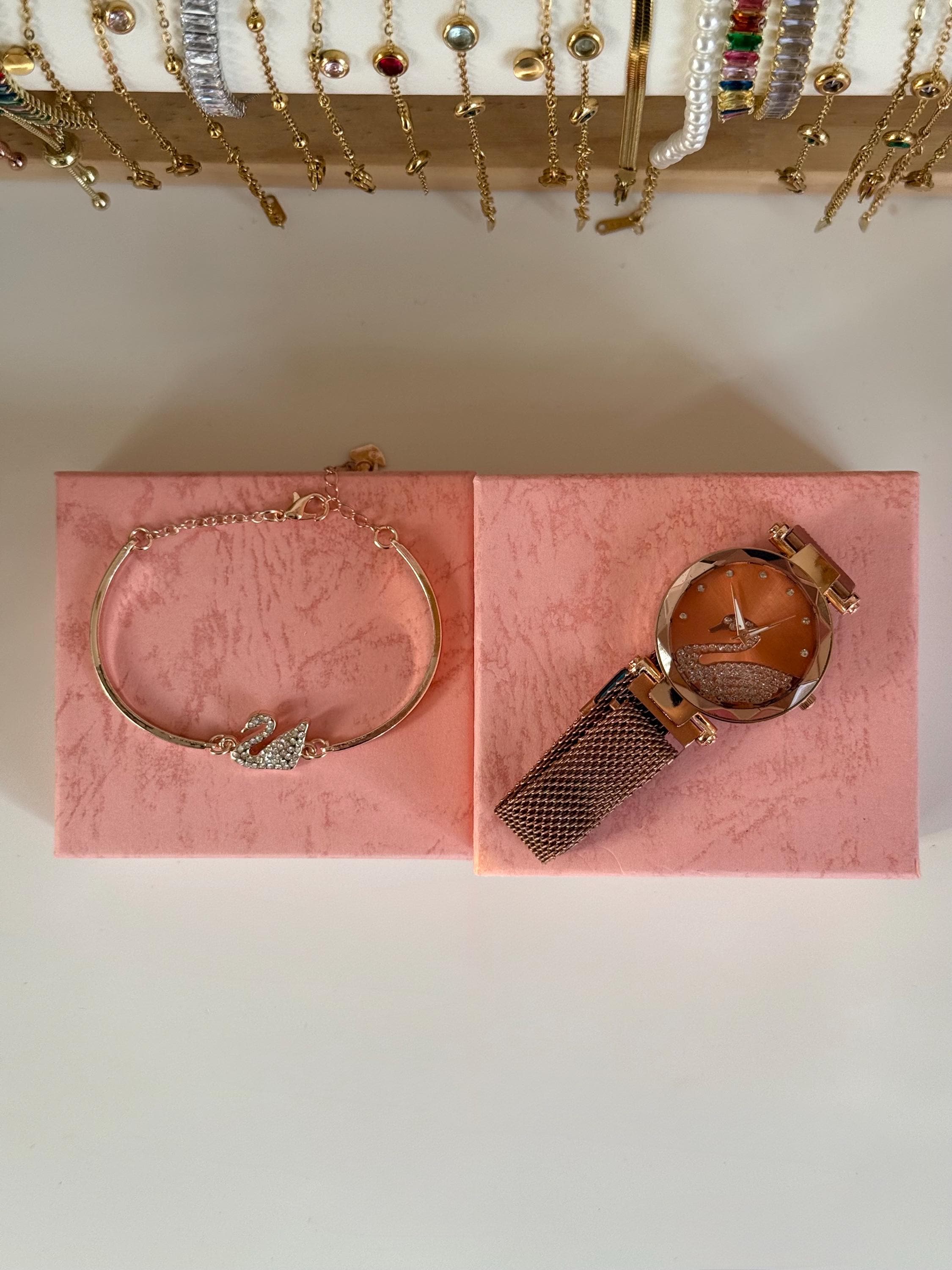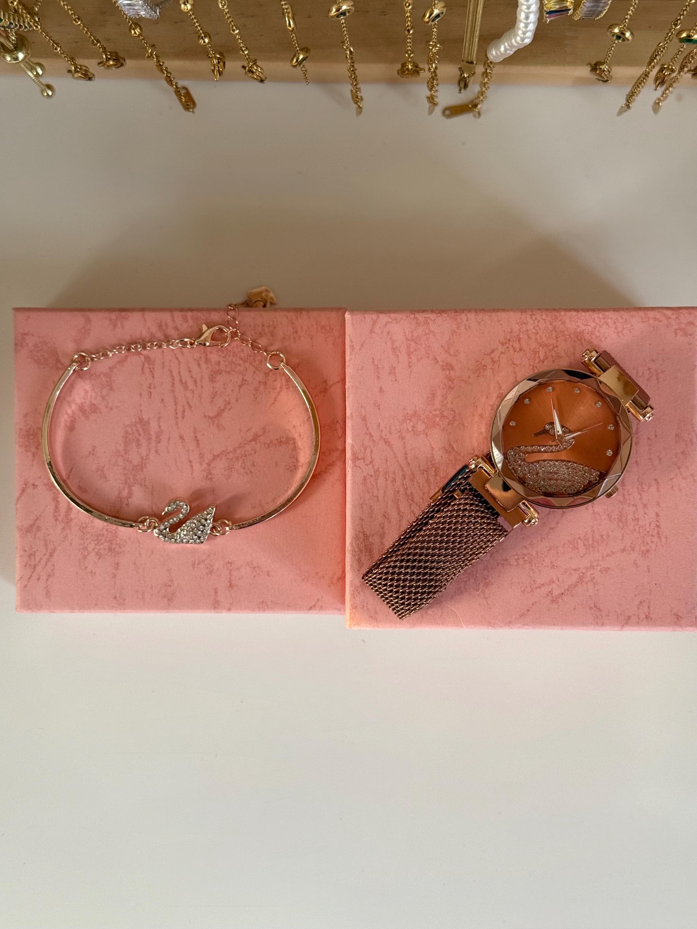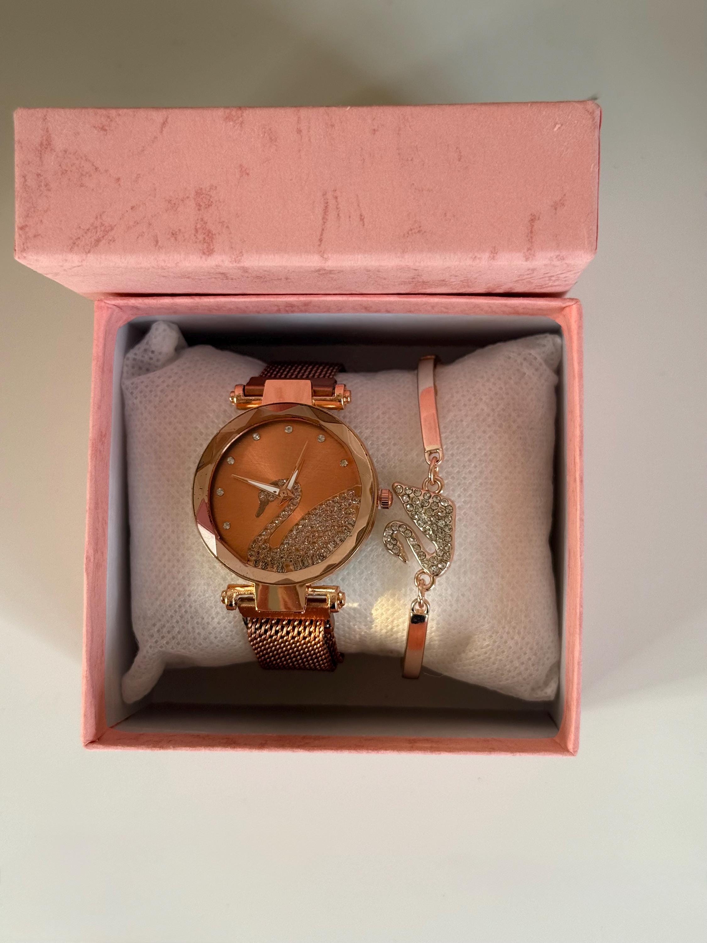 Rose Gold Swan Watch Set Women Bracelet Jewellery Set - Gift For Her ✨ Elegant women’s watch set featuring a stunning rose gold watch with a swan design dial, paired with a matching crystal swan bracelet.