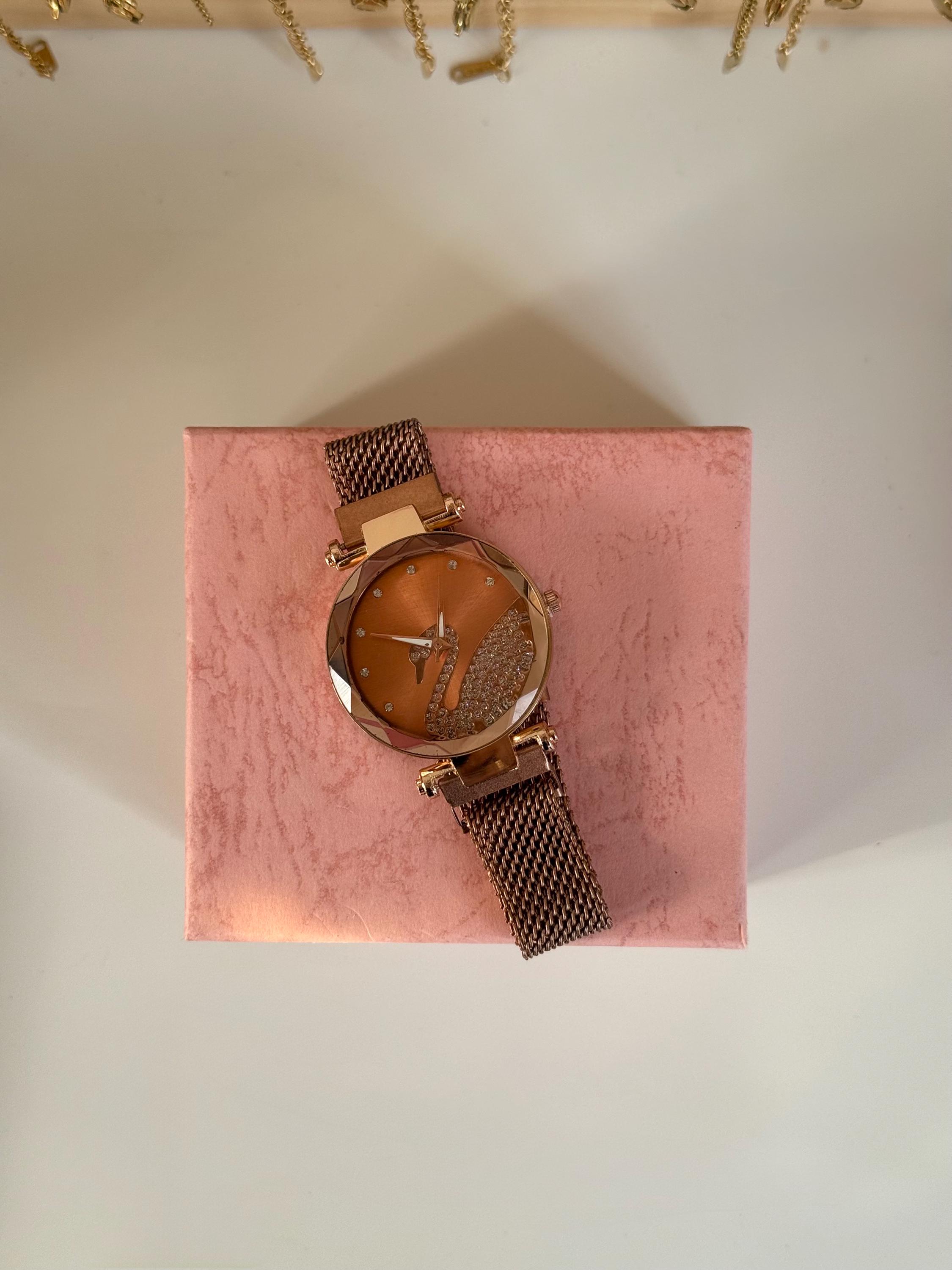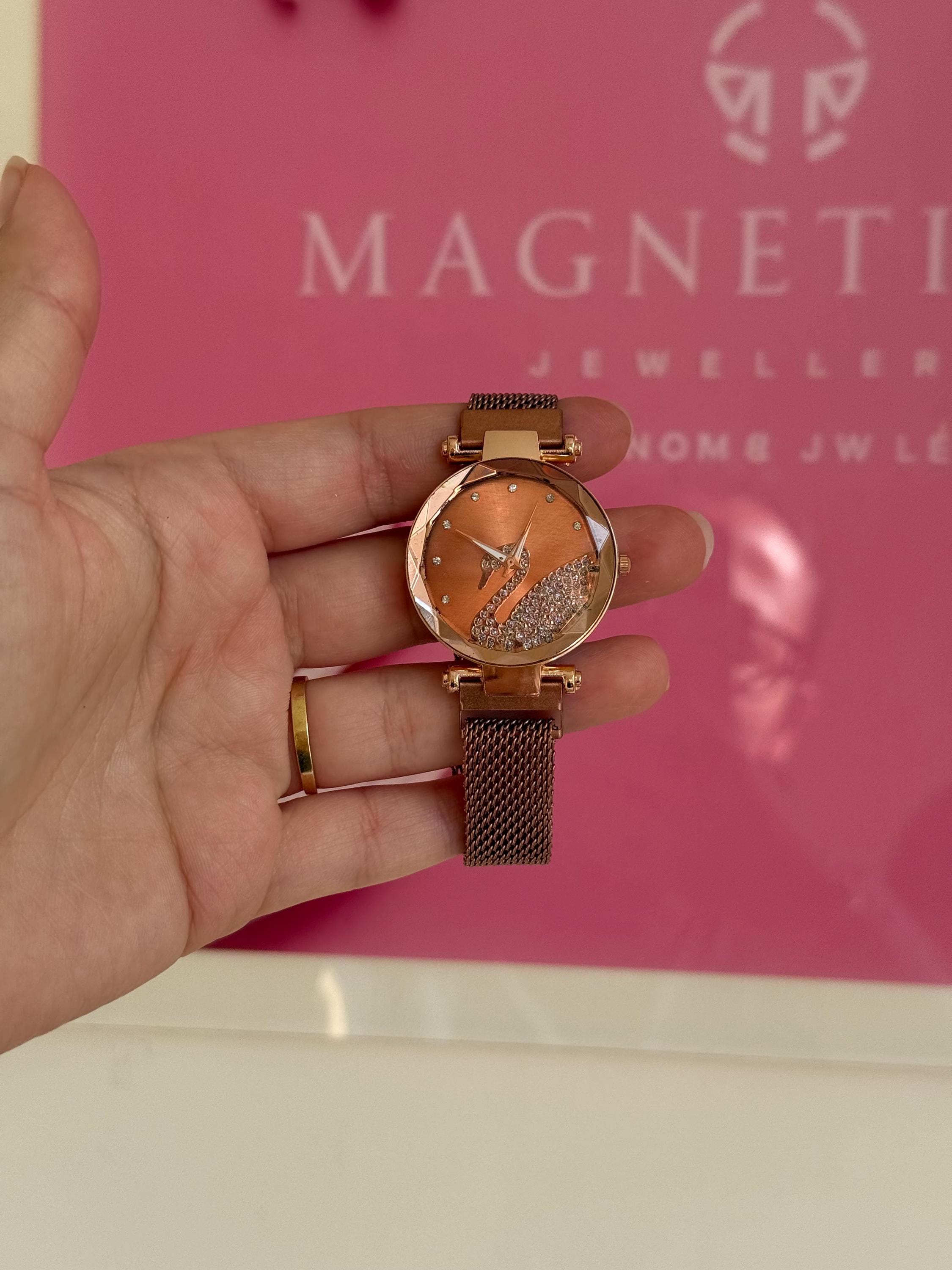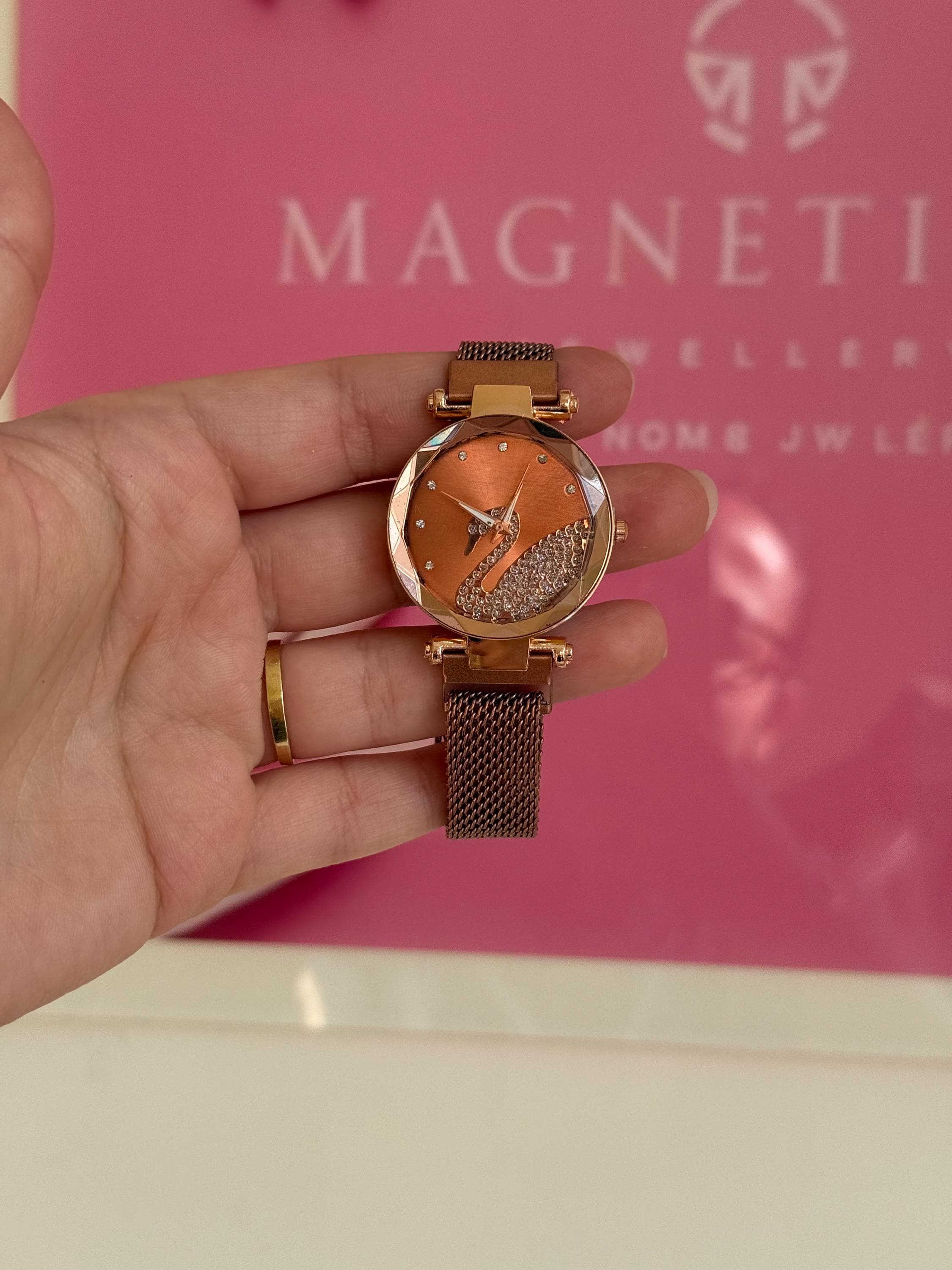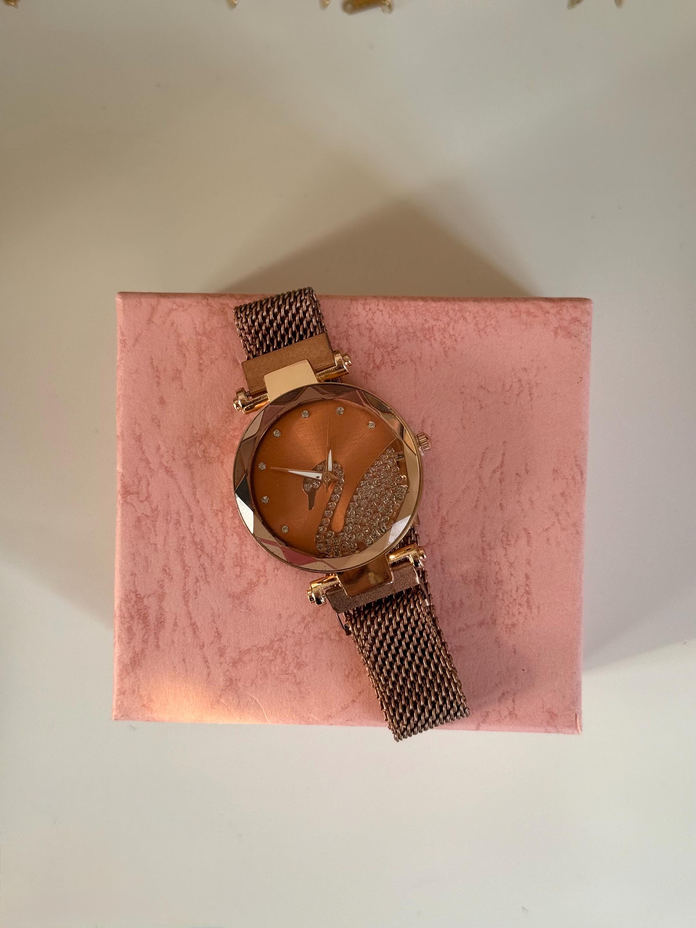 The delicate swan detail adds a unique and graceful touch, while the mesh strap offers a modern and comfortable fit.