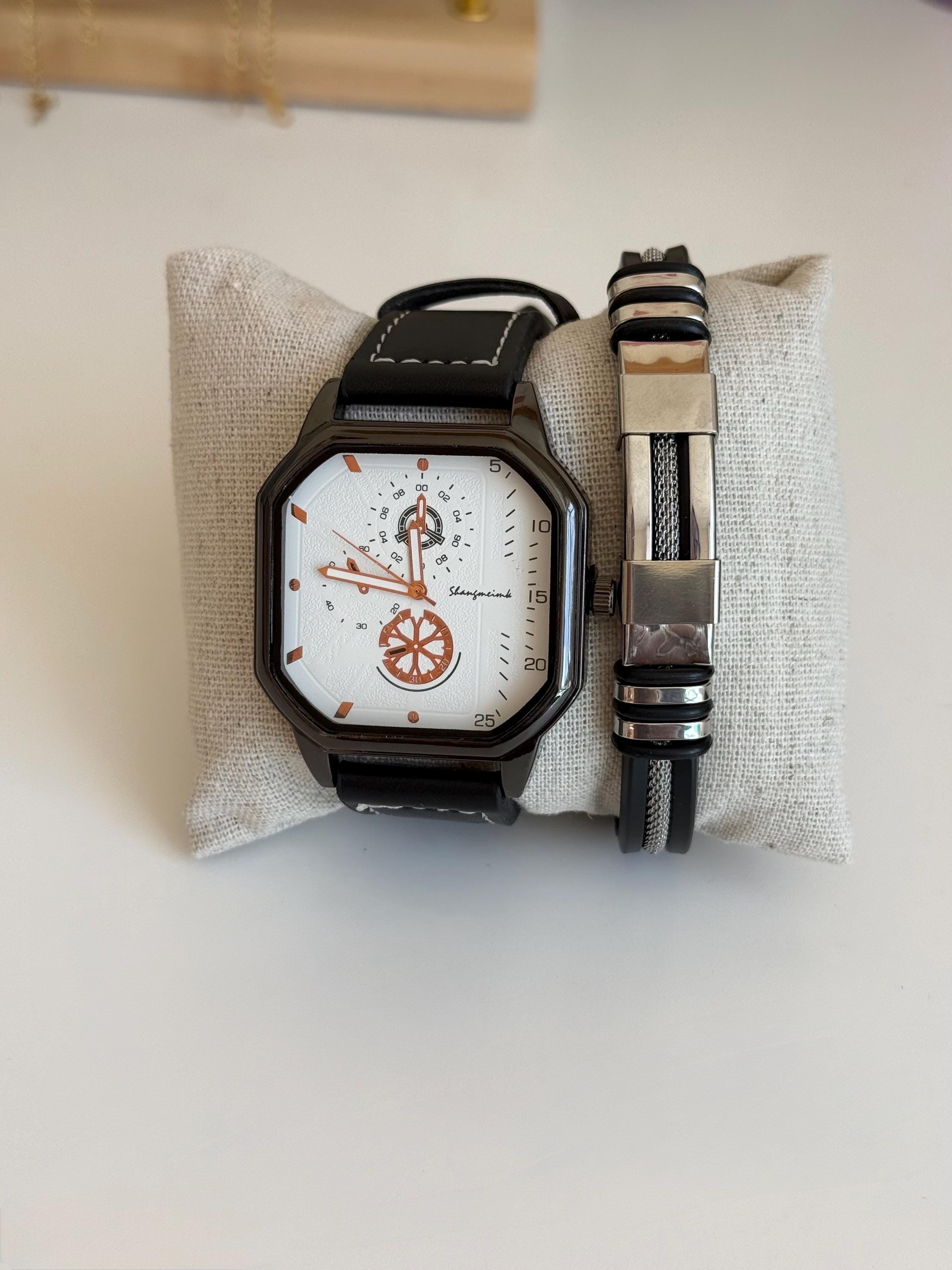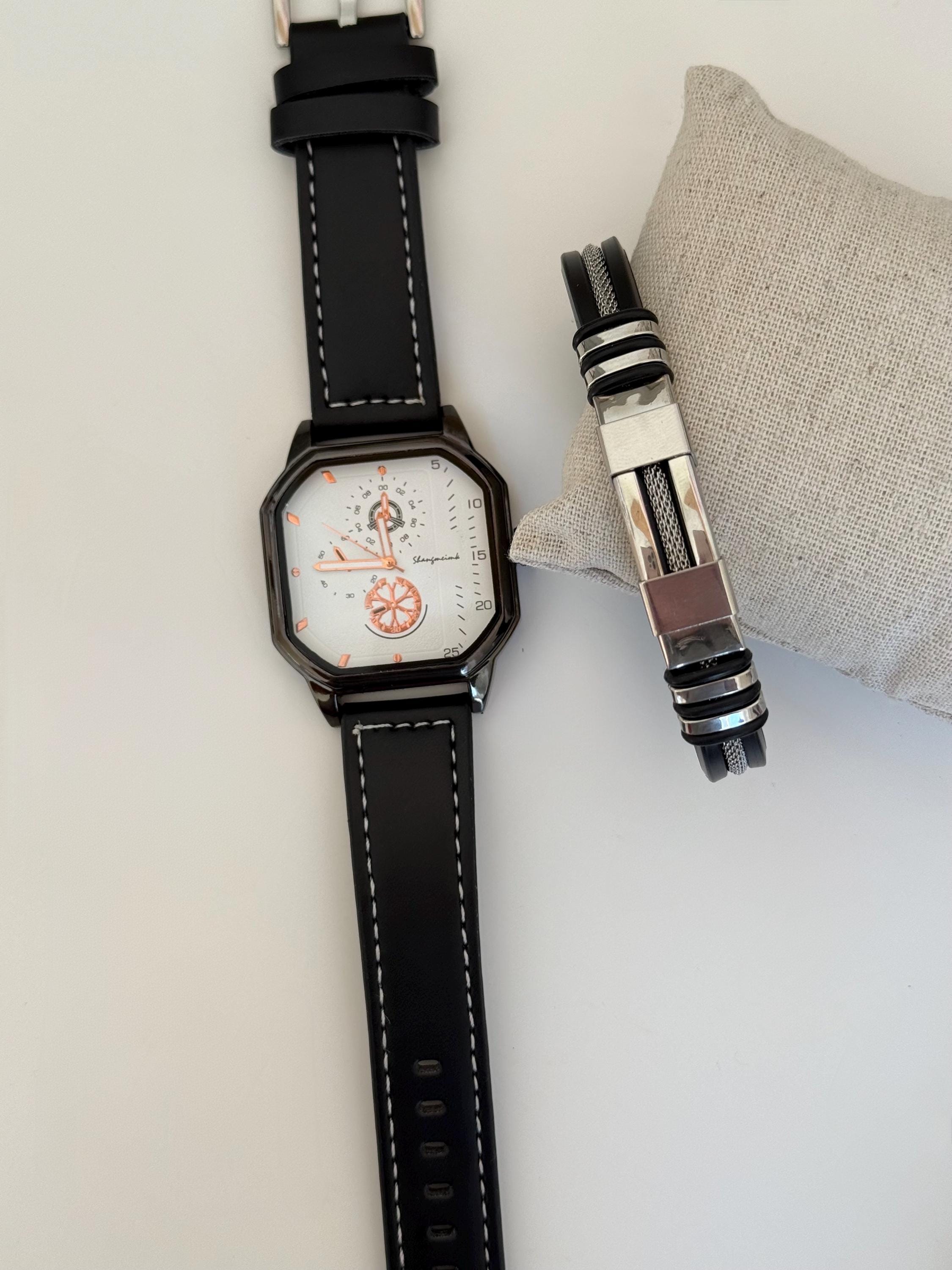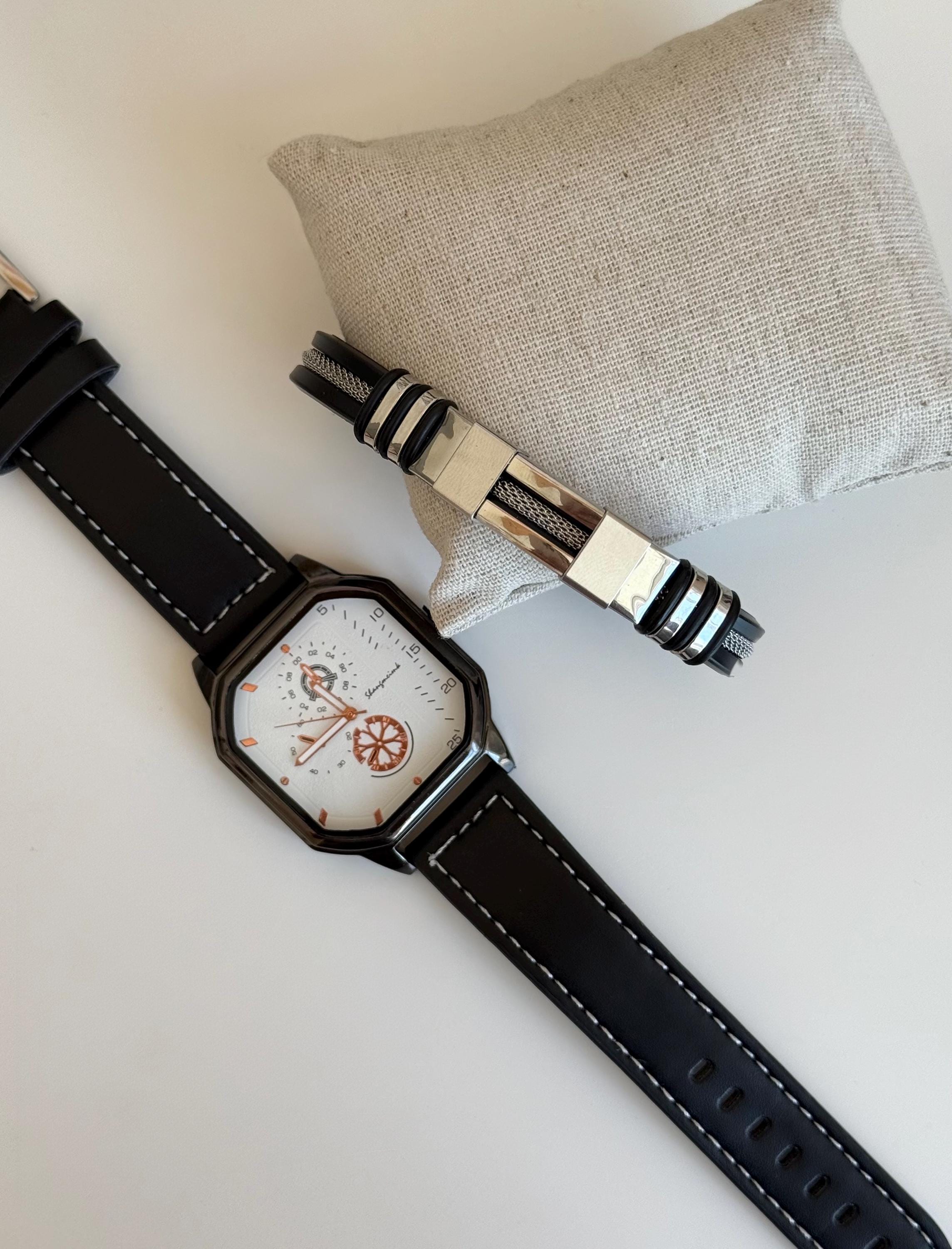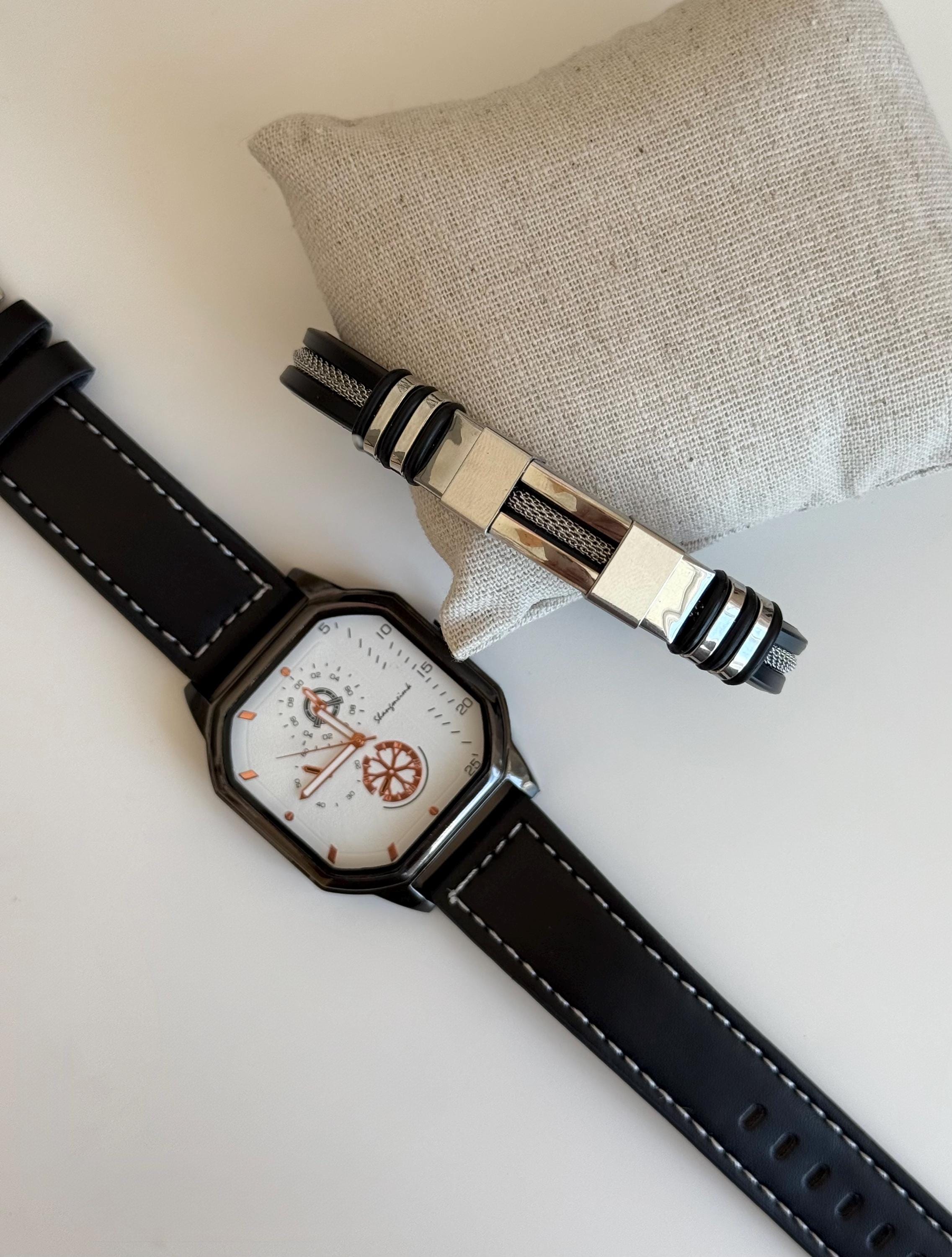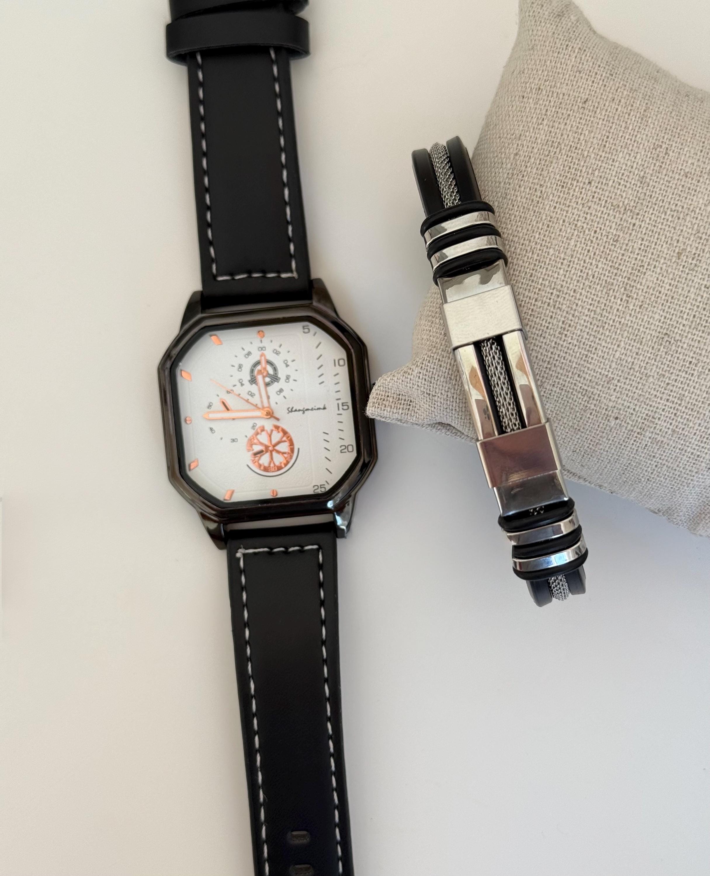 ✨ 2-piece men’s set ✨ Black leather strap watch ✨ Unique modern dial design ✨ Matching stainless steel bracelet ✨ Comfortable and stylish