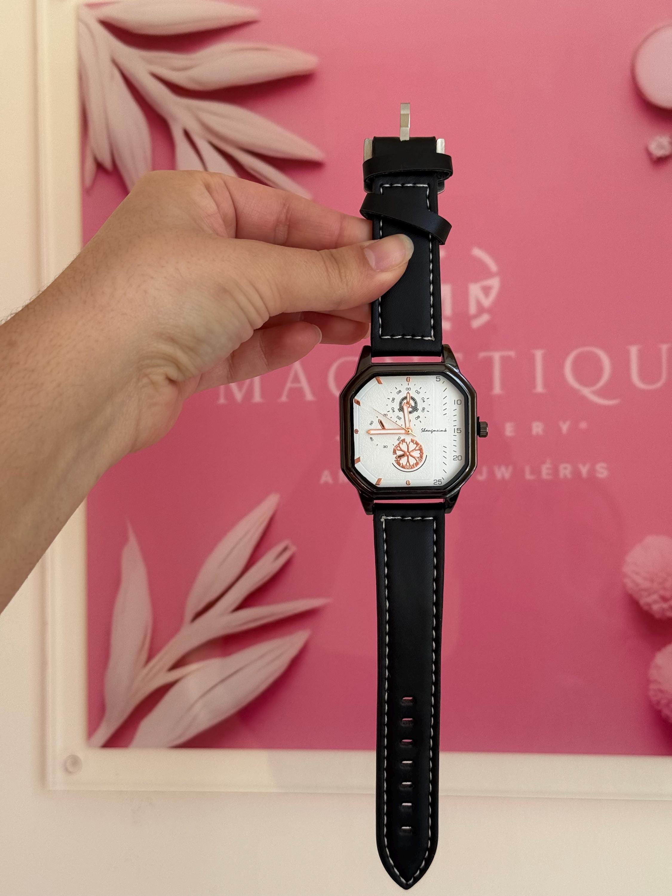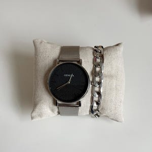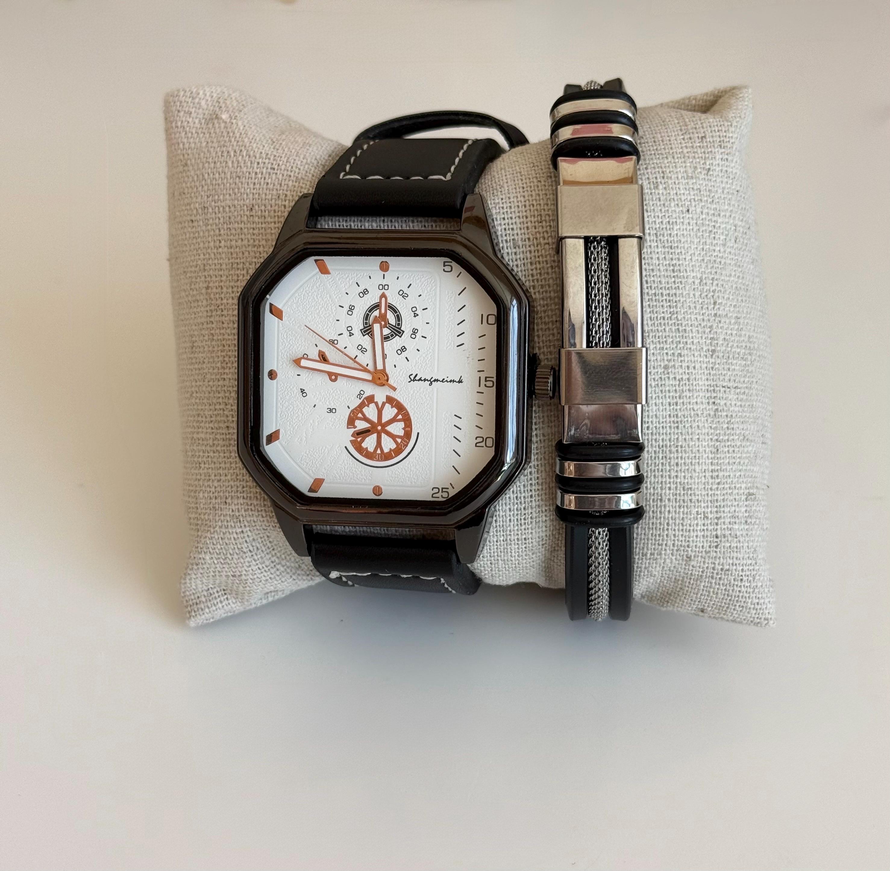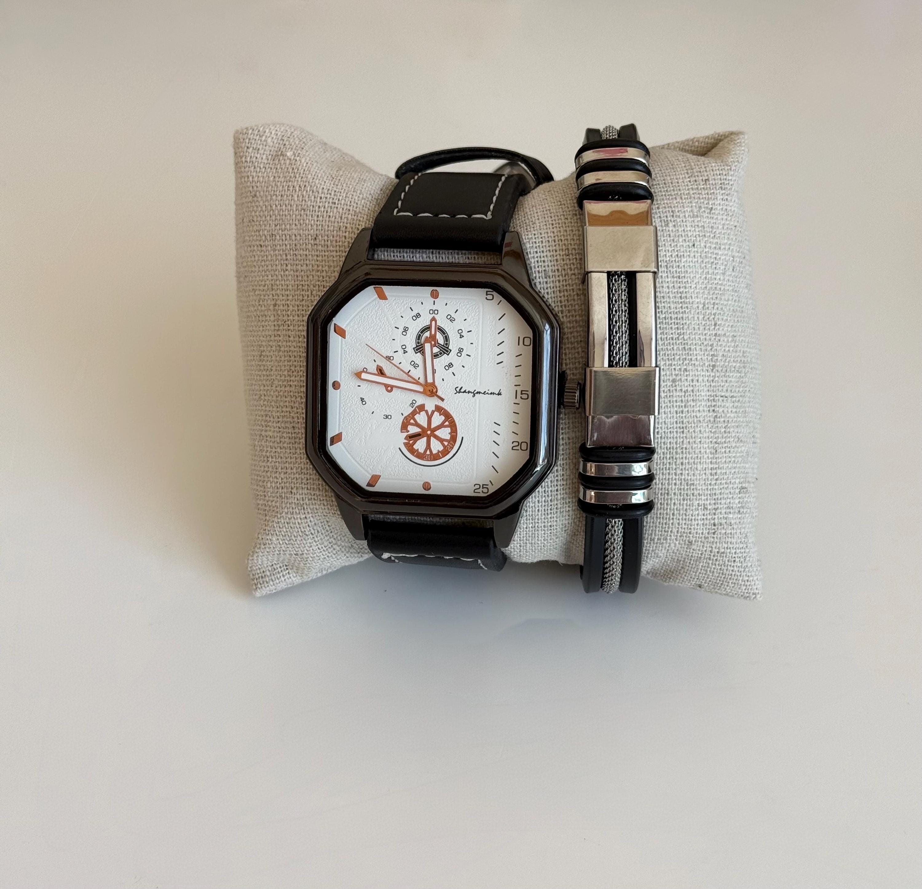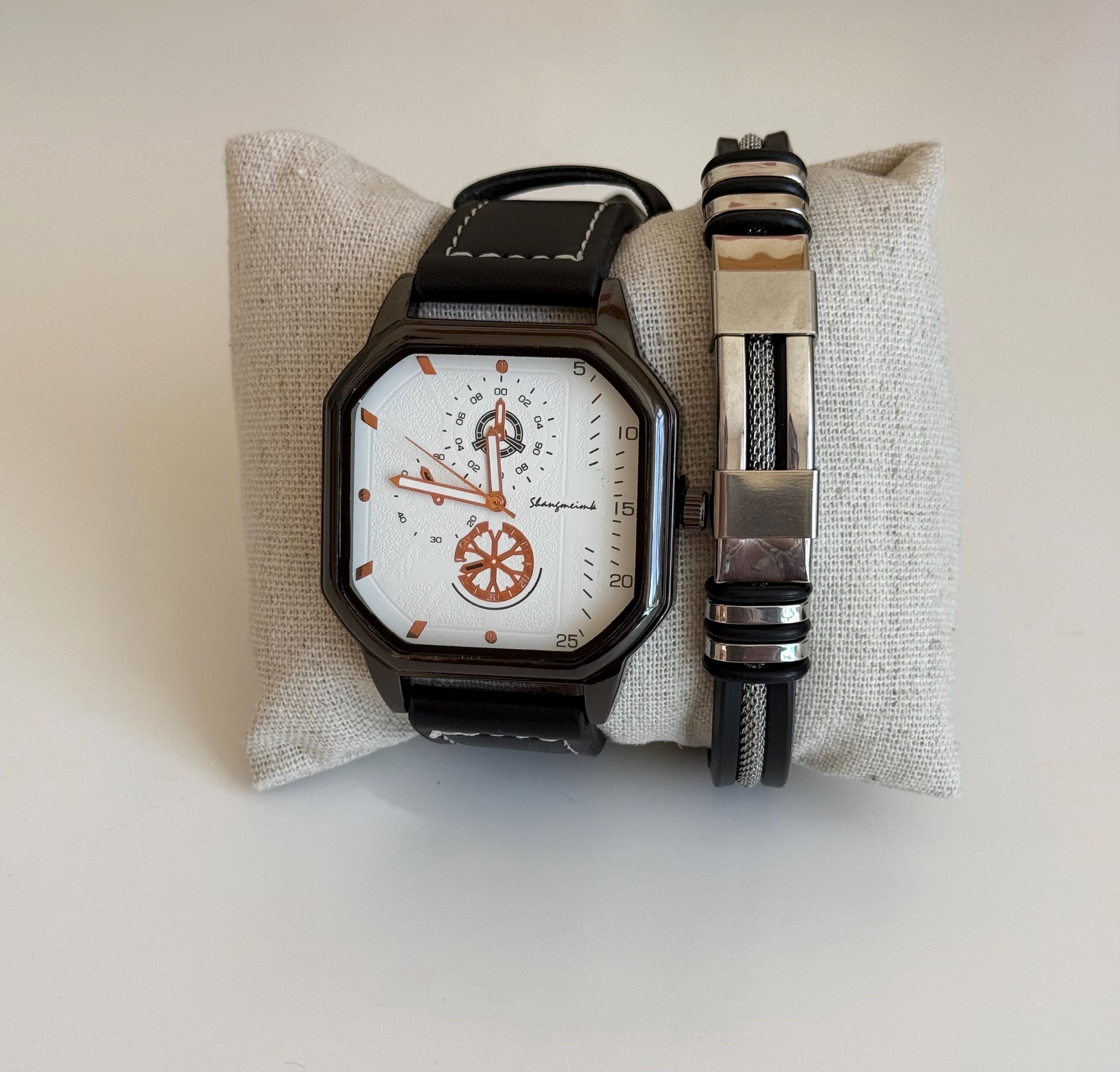 ✨ 2-piece men’s set ✨ Black leather strap watch ✨ Unique modern dial design ✨ Matching stainless steel bracelet ✨ Comfortable and stylish