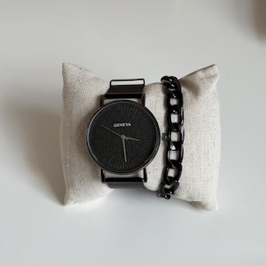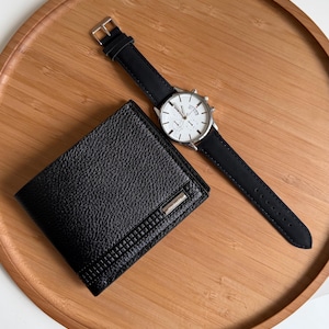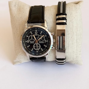 Mens Leather Watch Set Black Strap Bracelet - Gift For Him ✨ Stylish men’s watch set featuring a modern black leather strap watch paired with a matching stainless steel bracelet.