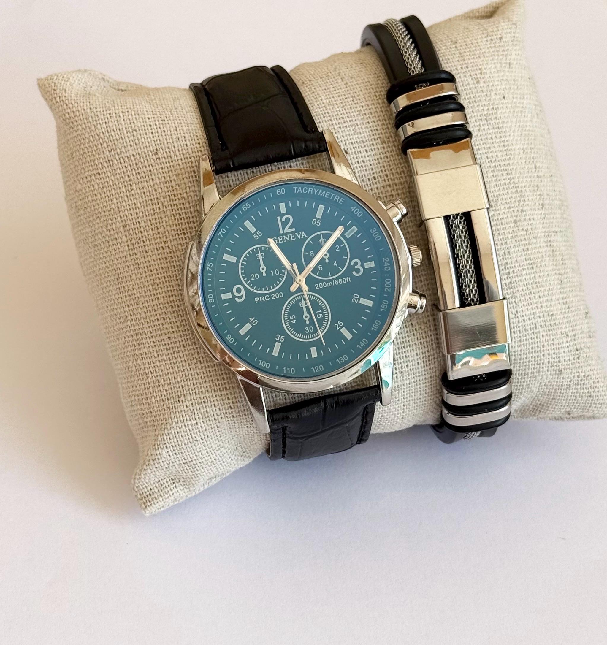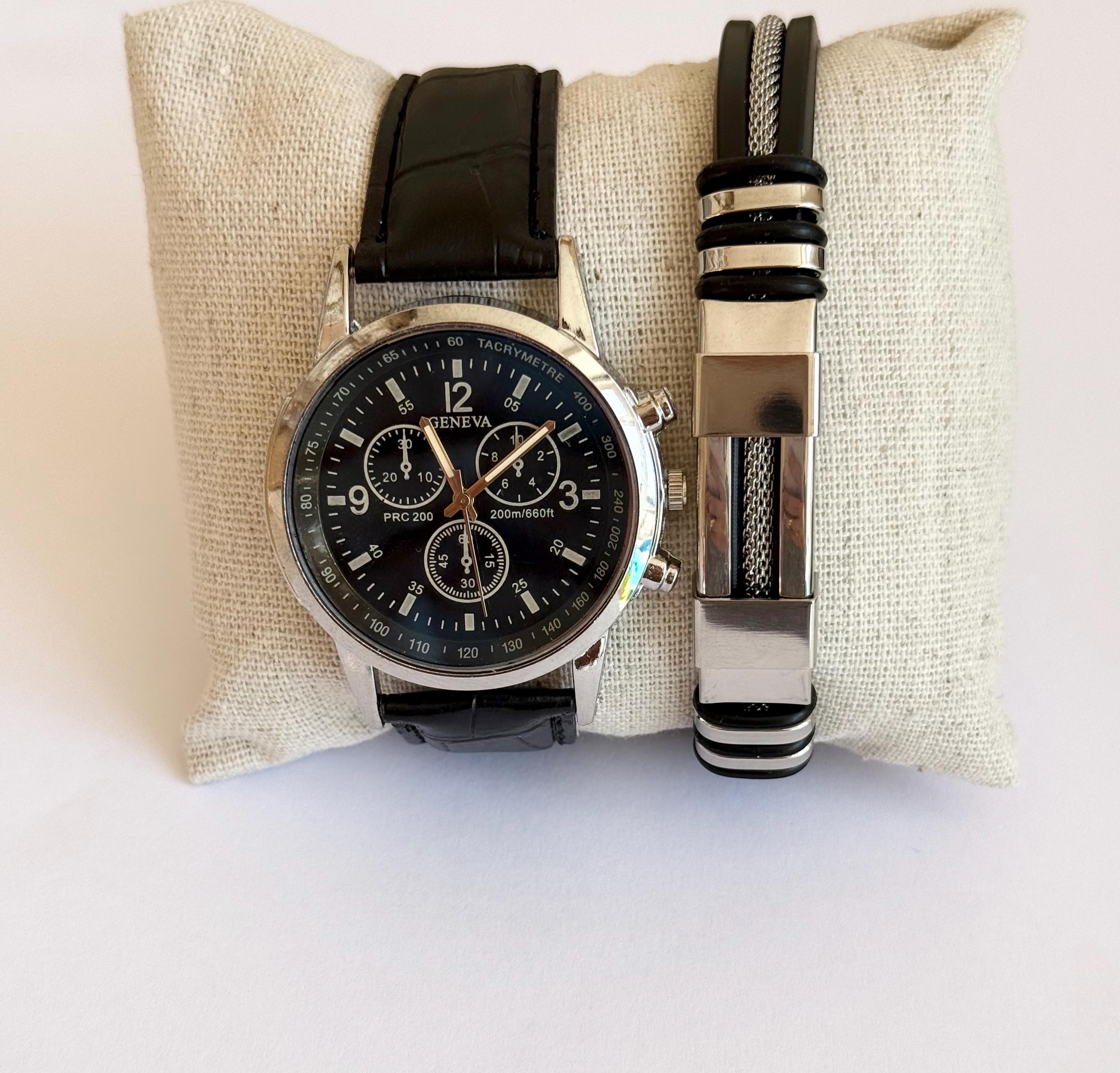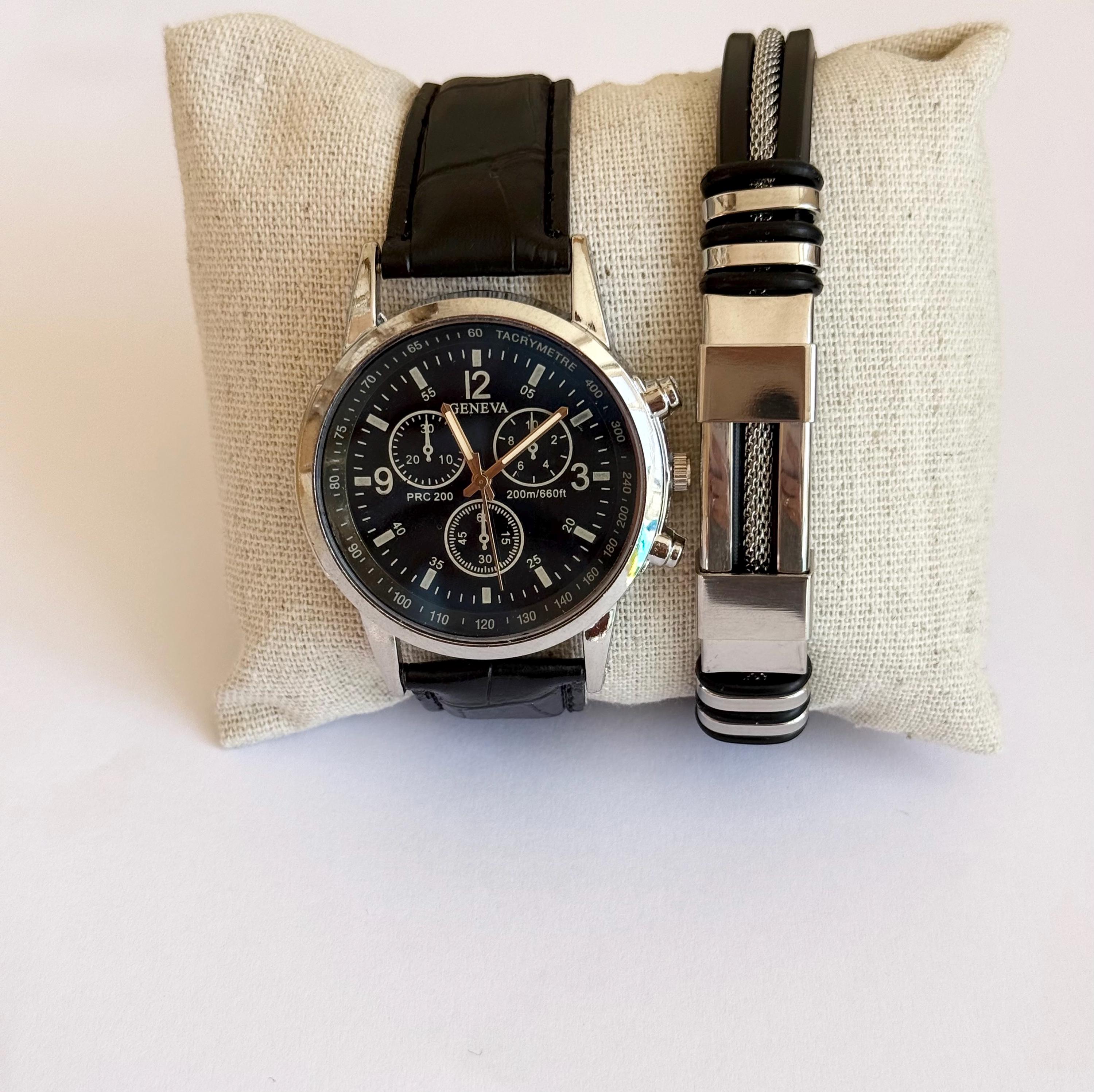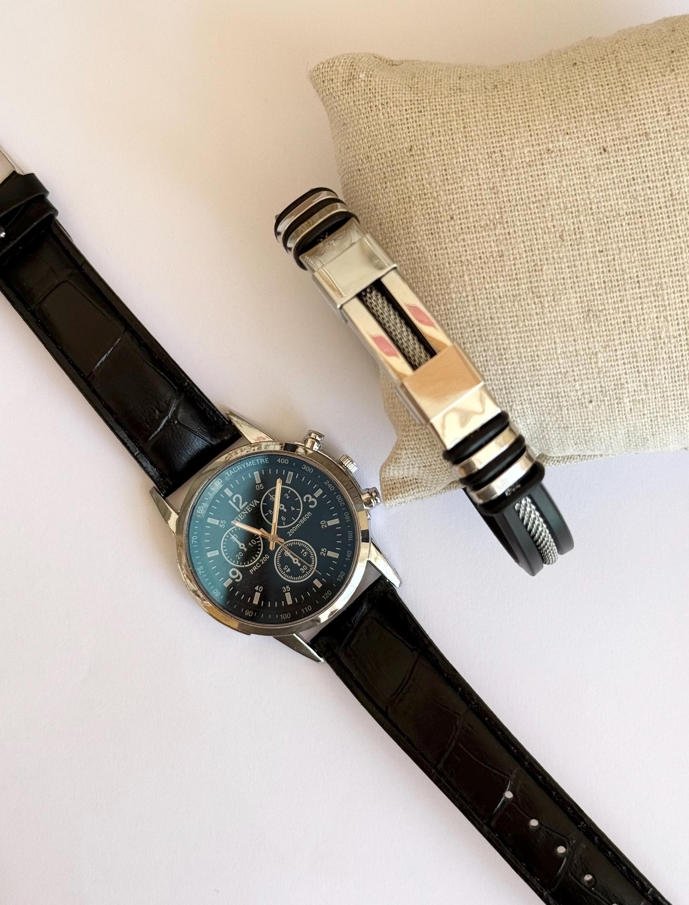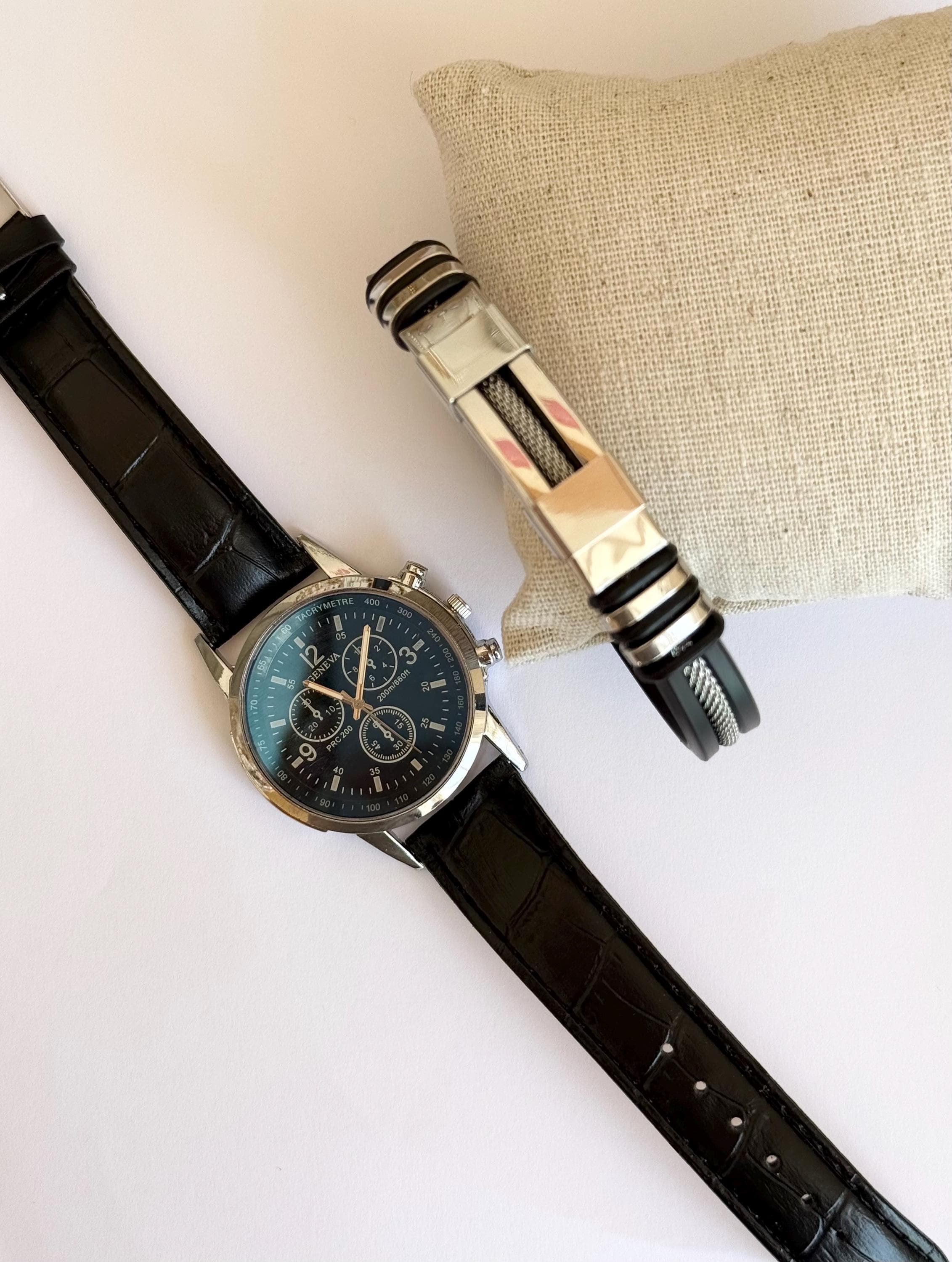 ✨ 2-piece men’s set ✨ Chronograph-style design ✨ Black leather strap ✨ Matching stainless steel bracelet ✨ Stylish and comfortable