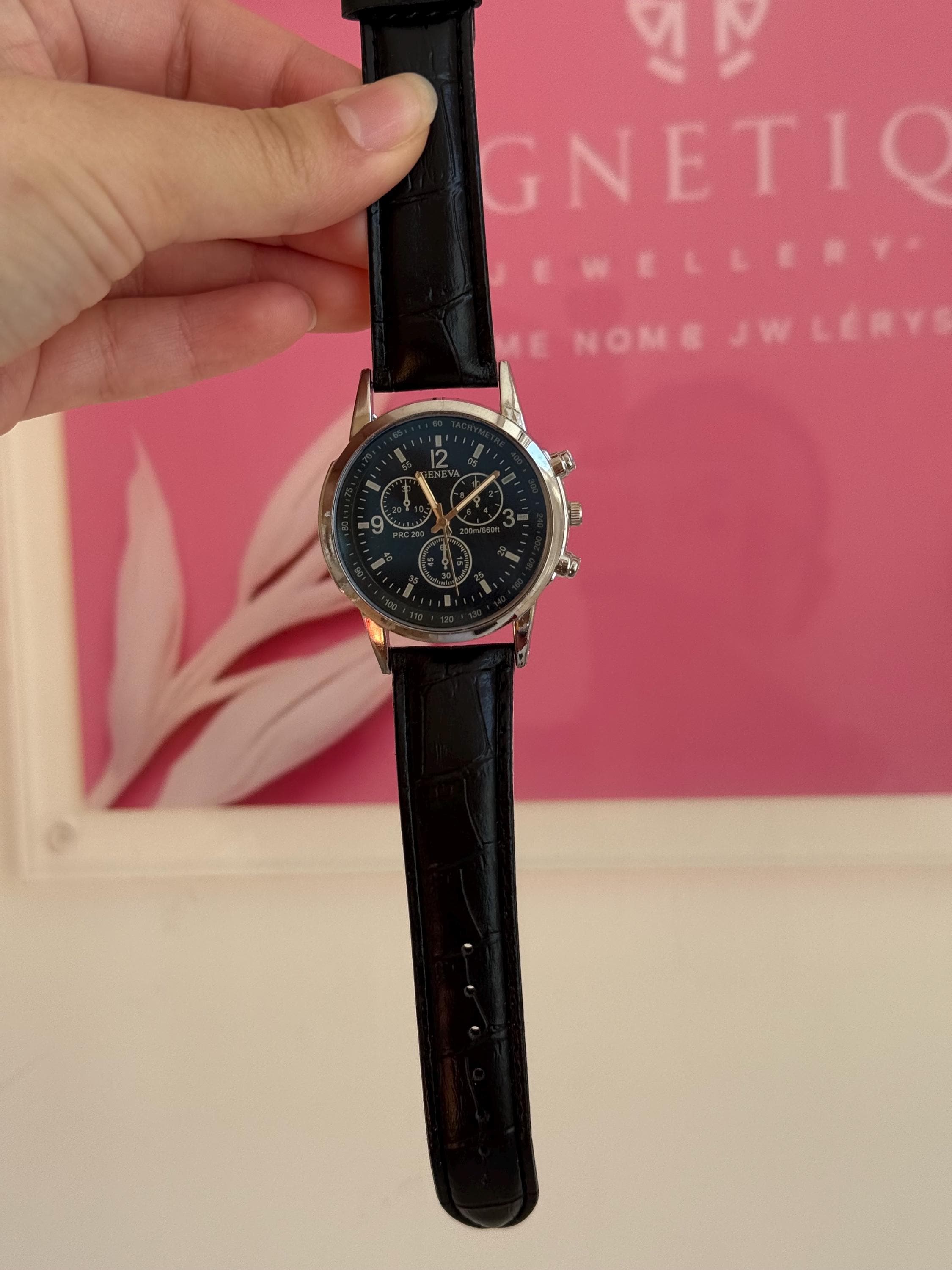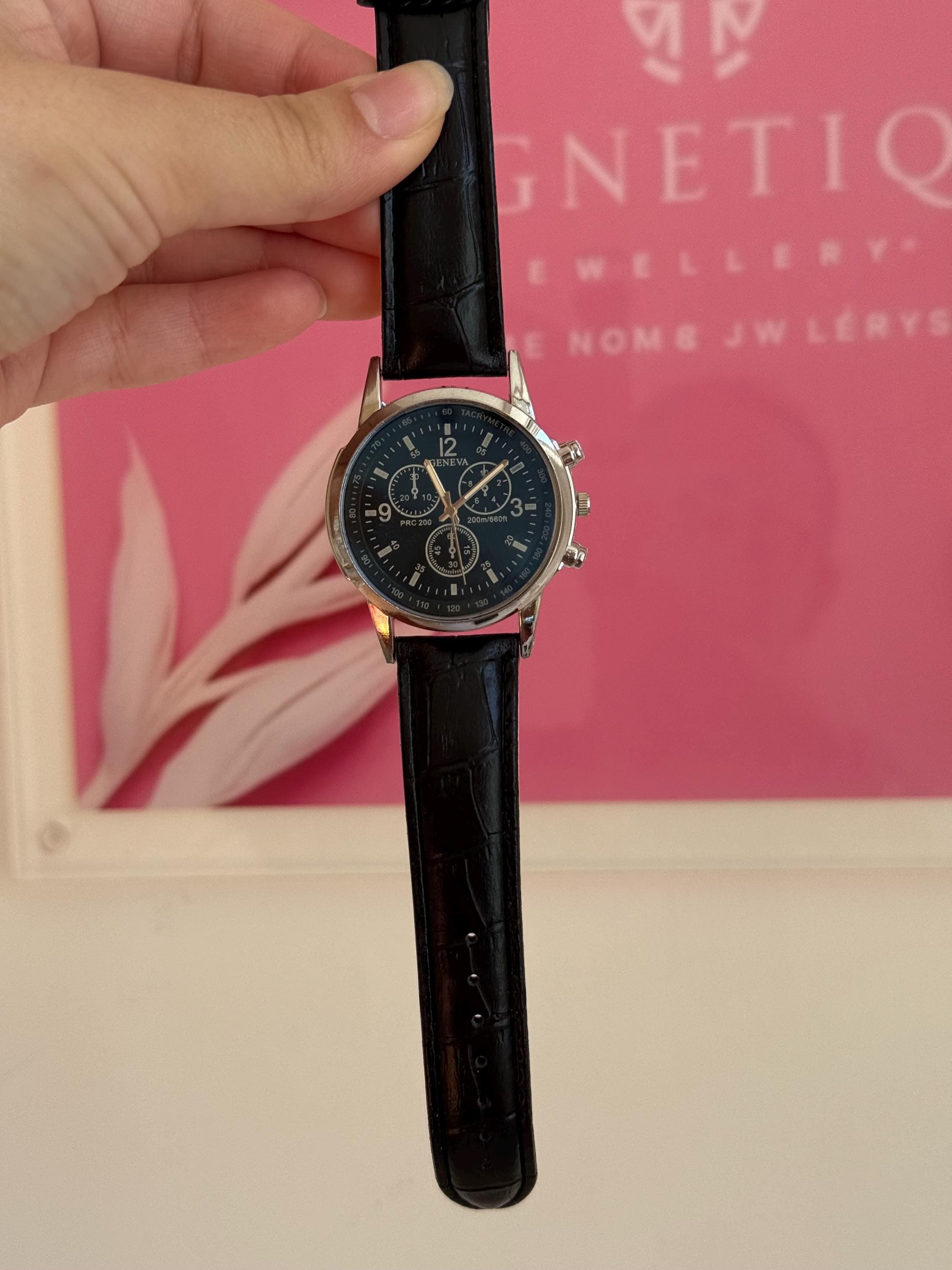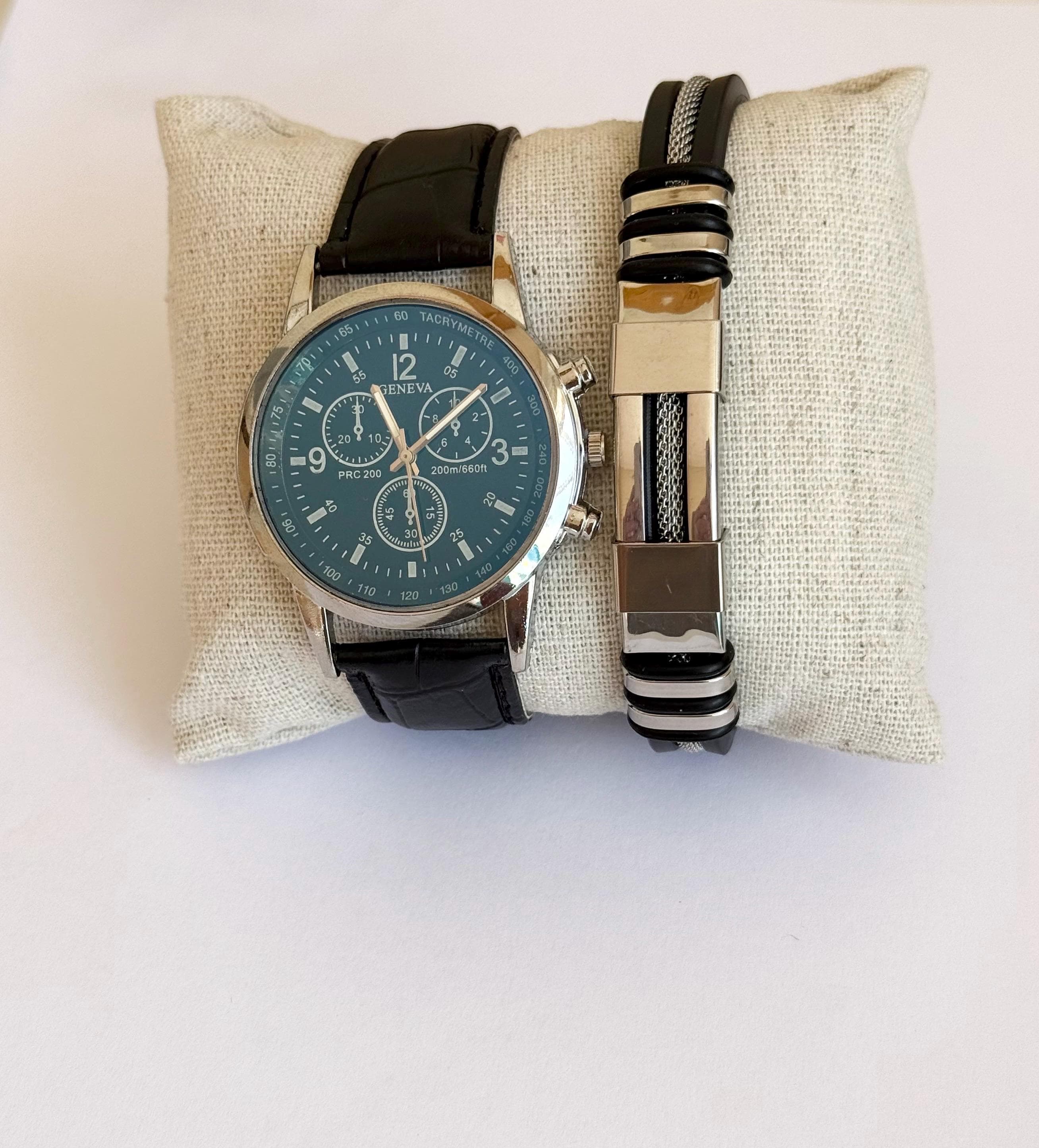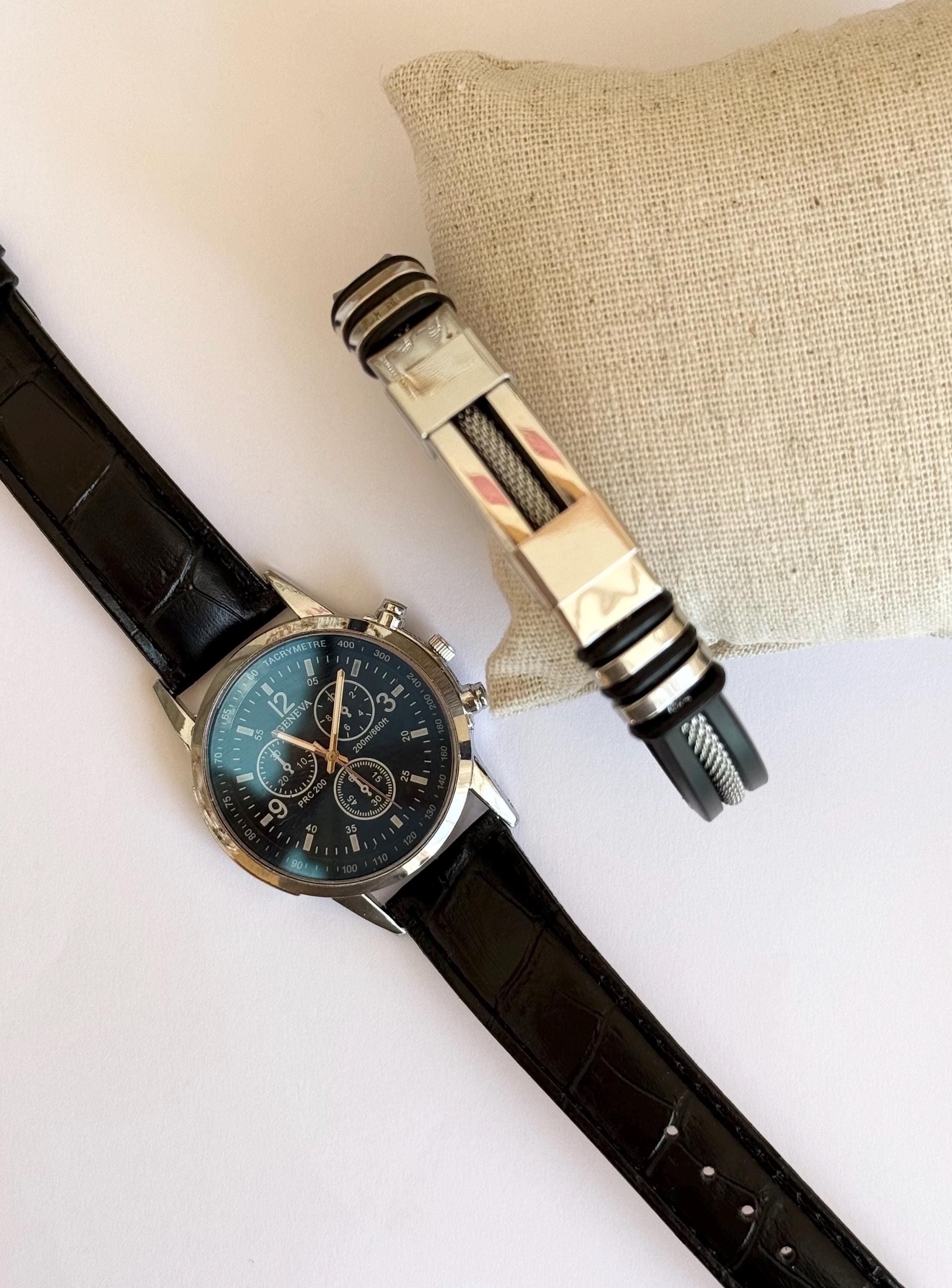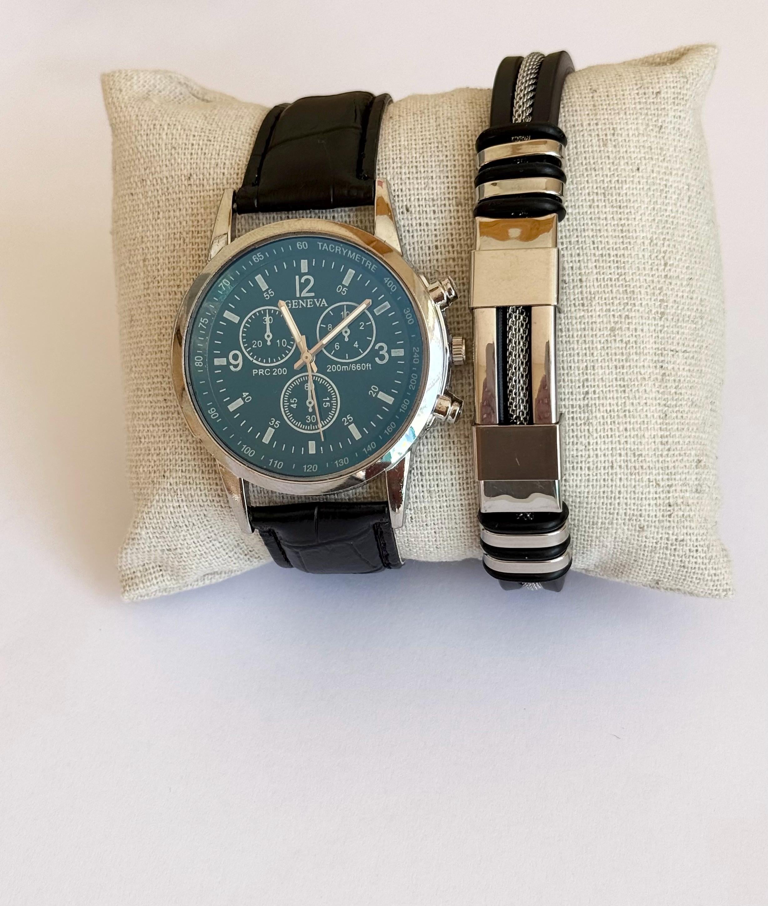 ✨ 2-piece men’s set ✨ Chronograph-style design ✨ Black leather strap ✨ Matching stainless steel bracelet ✨ Stylish and comfortable