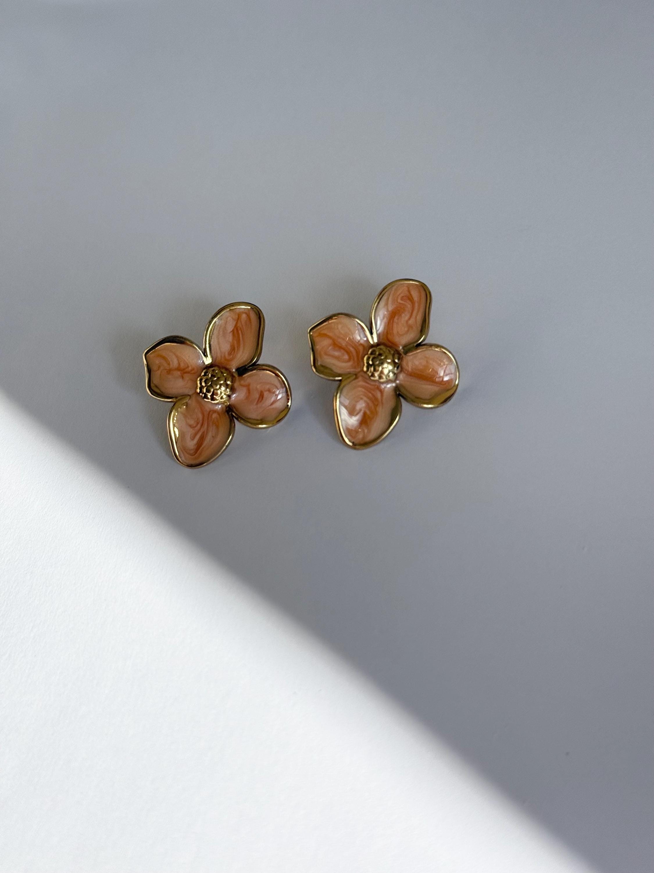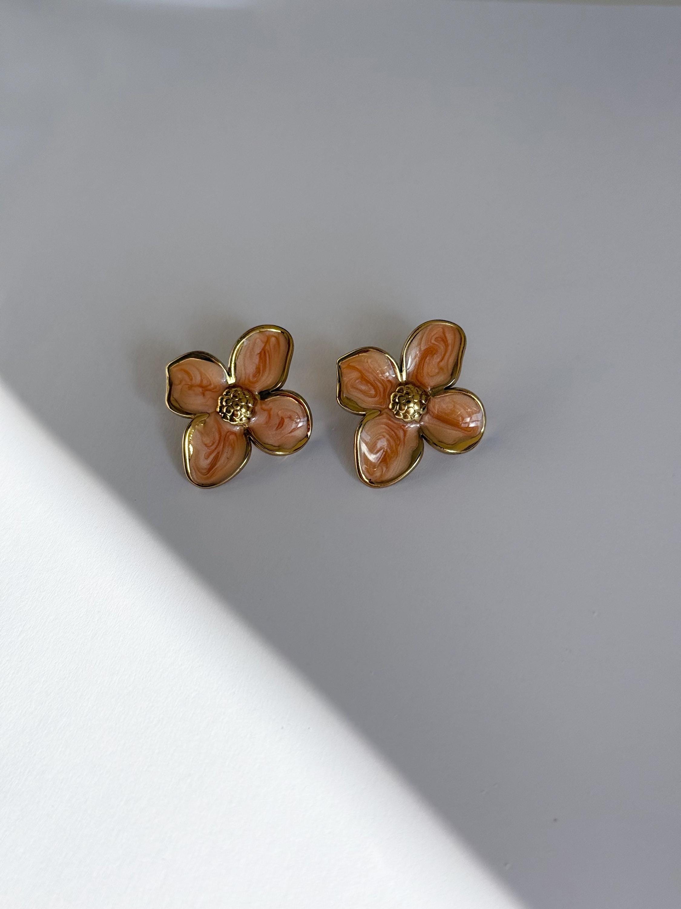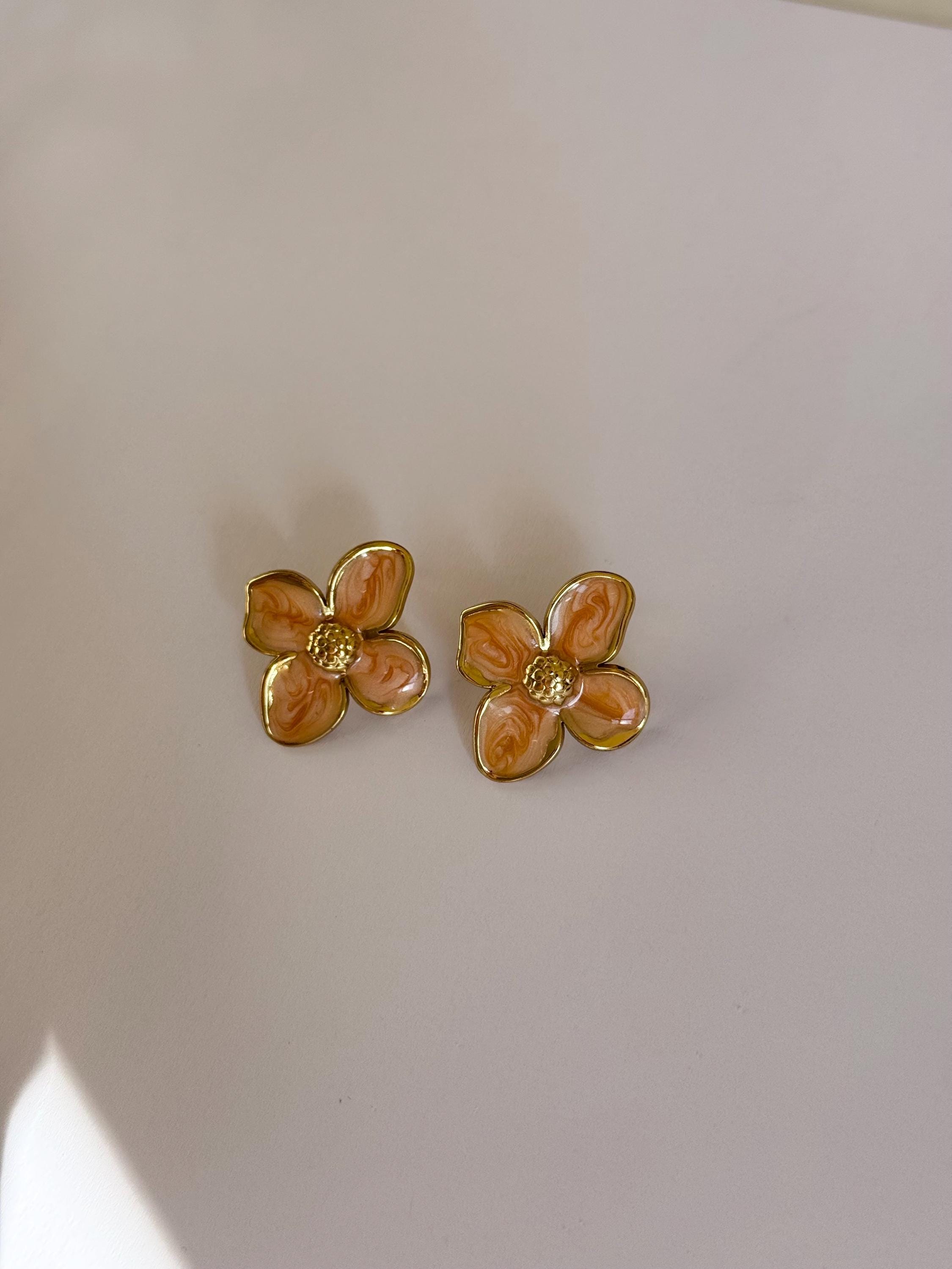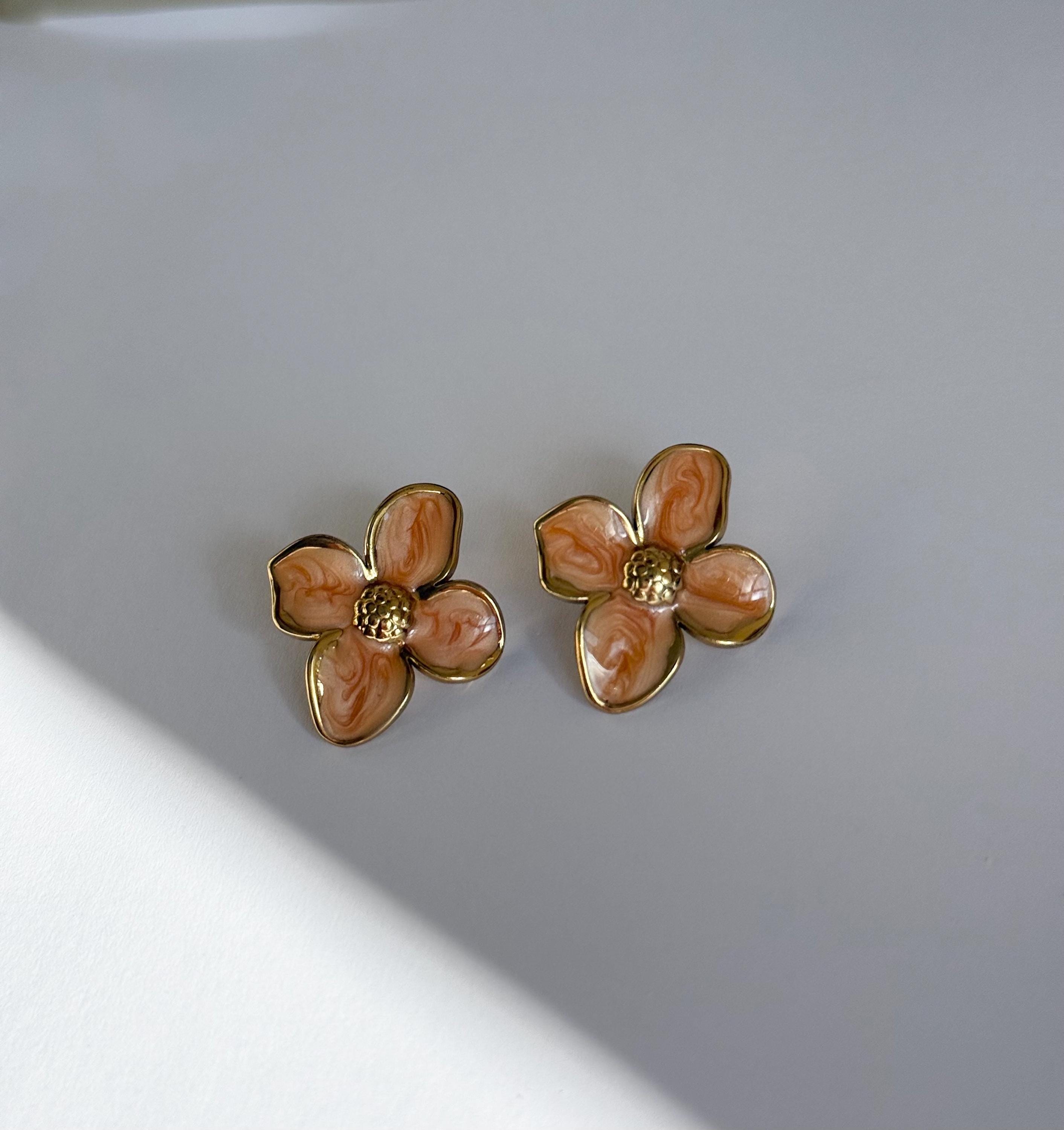 Elegant peach flower stud earrings with a soft enamel finish and gold-tone detailing.