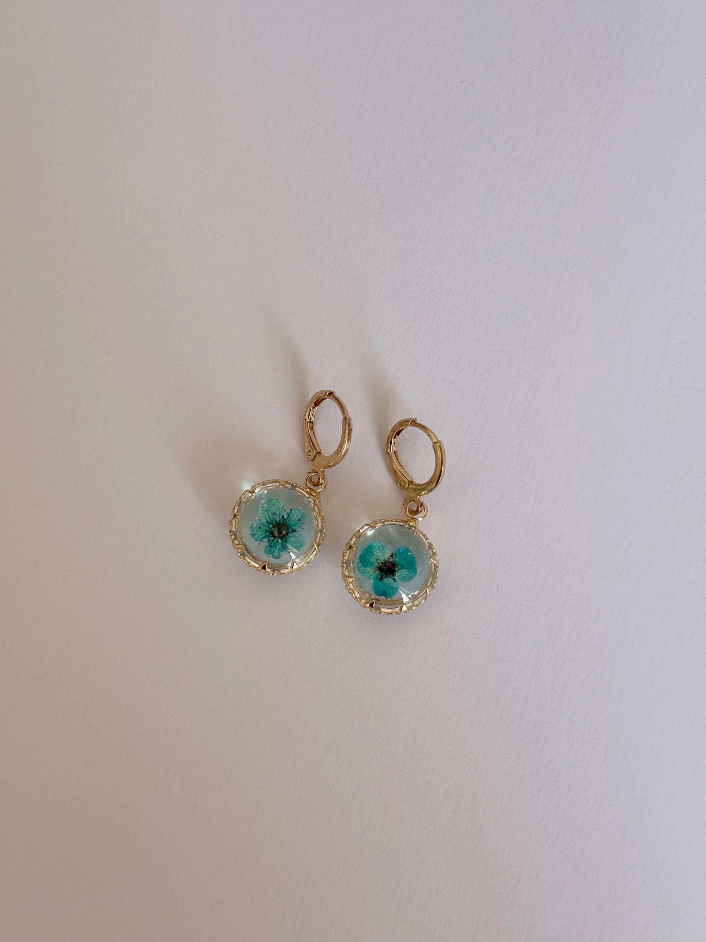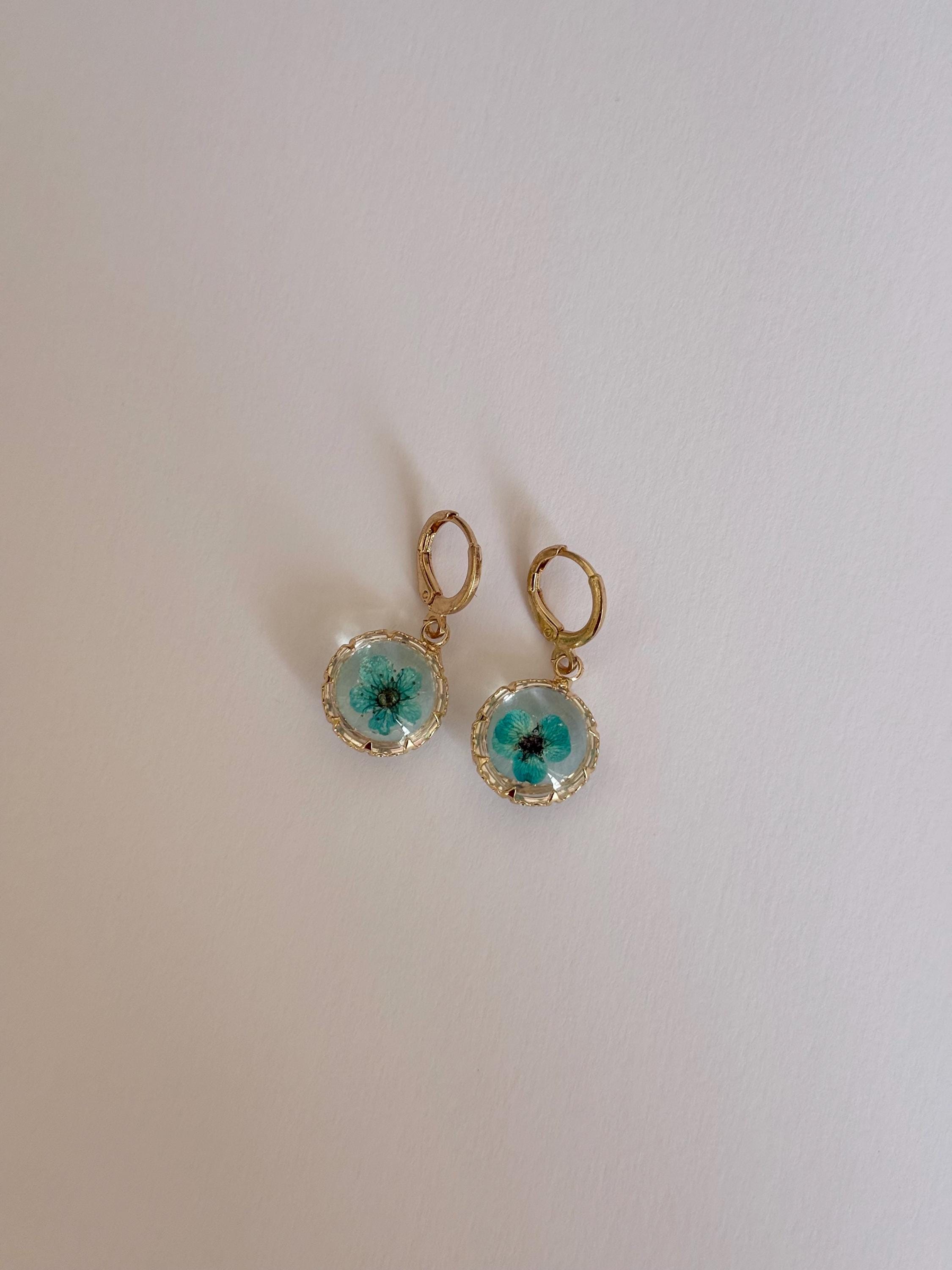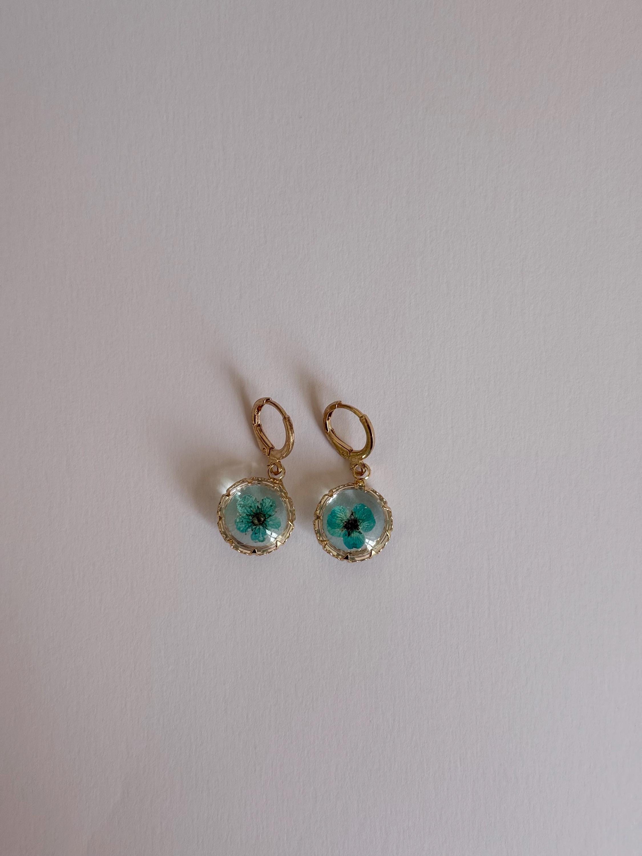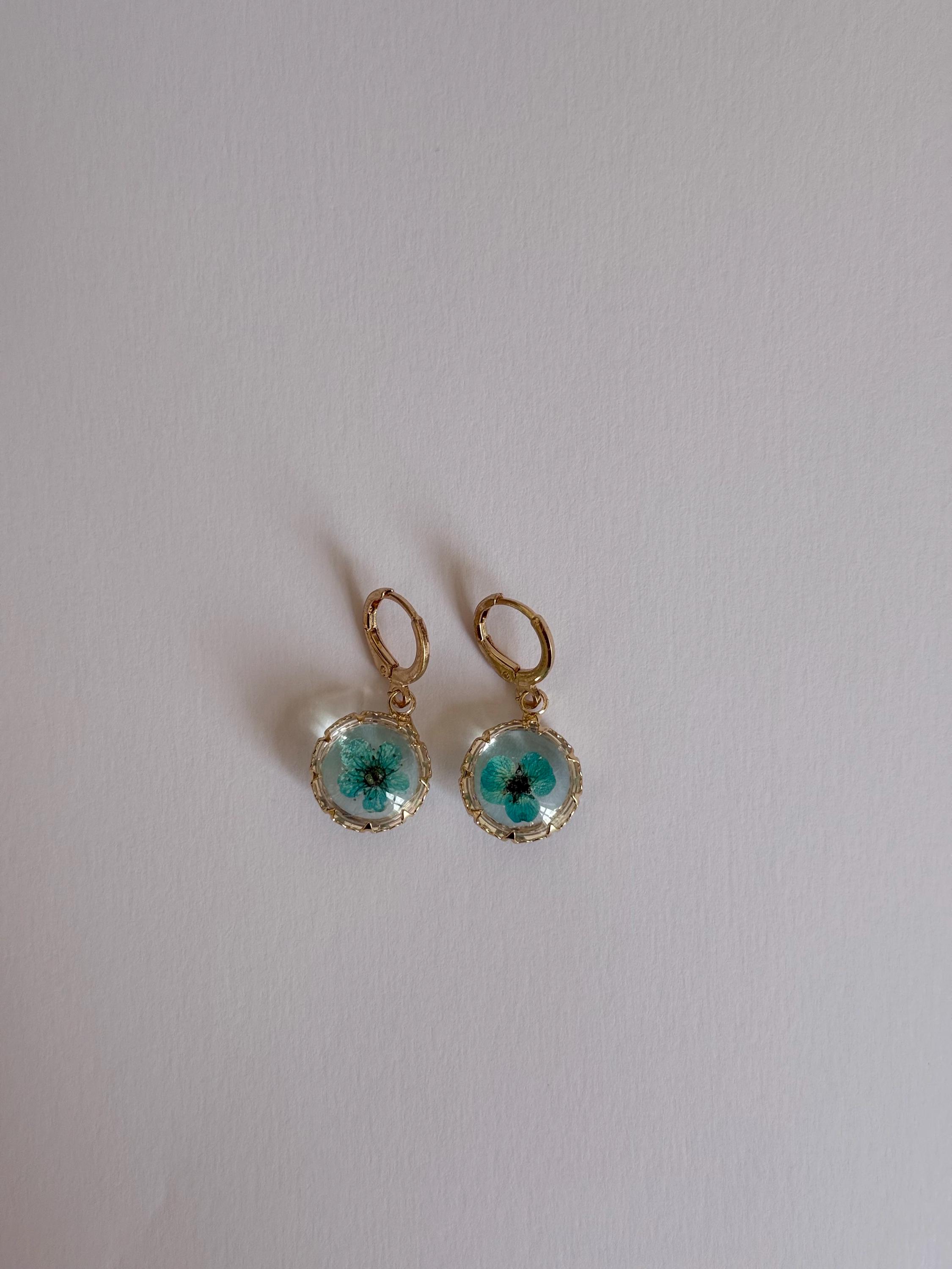 Beautiful dried flower earrings featuring real blue/turquoise flowers preserved in clear resin, set in a delicate round gold-tone frame.