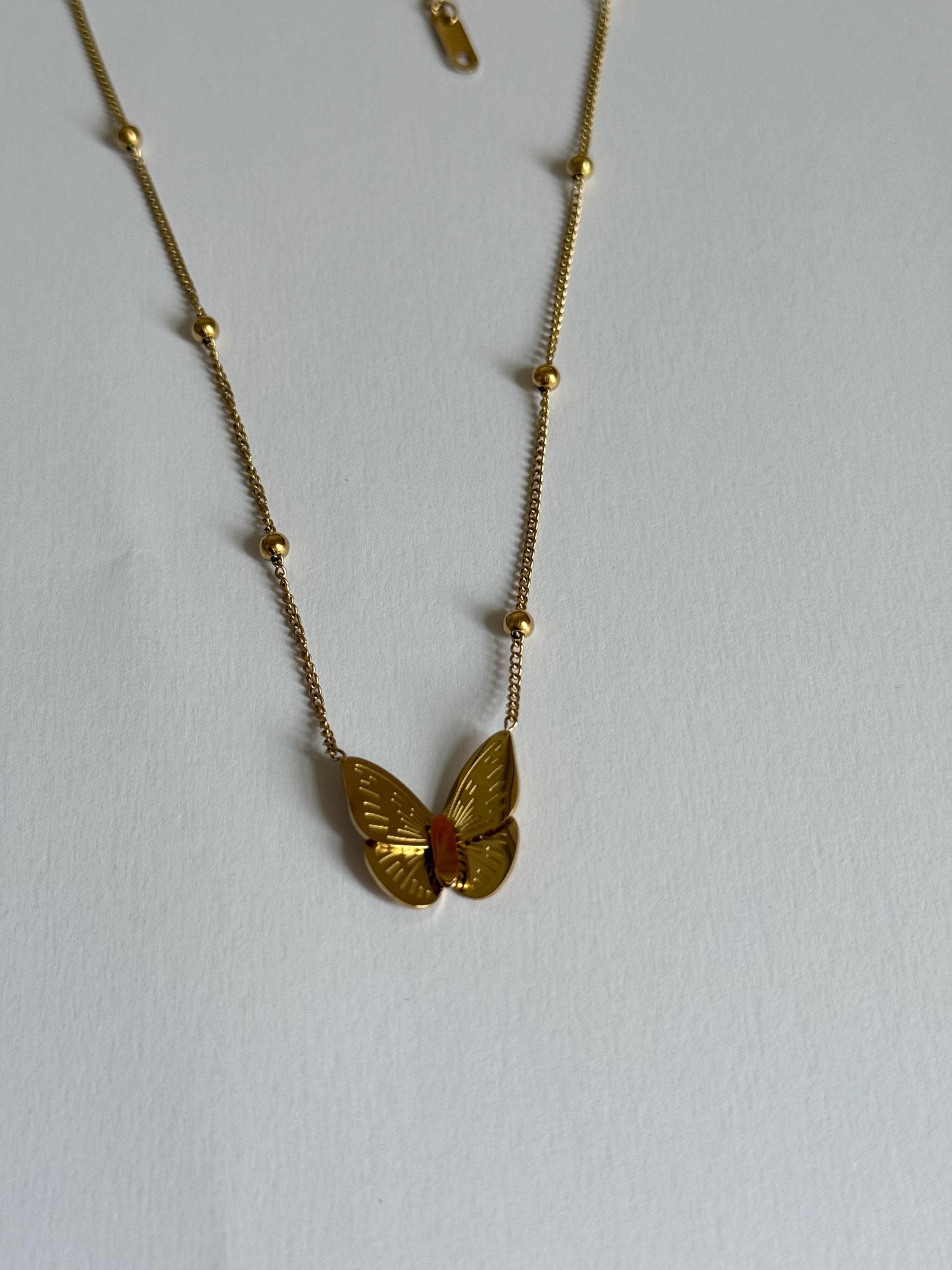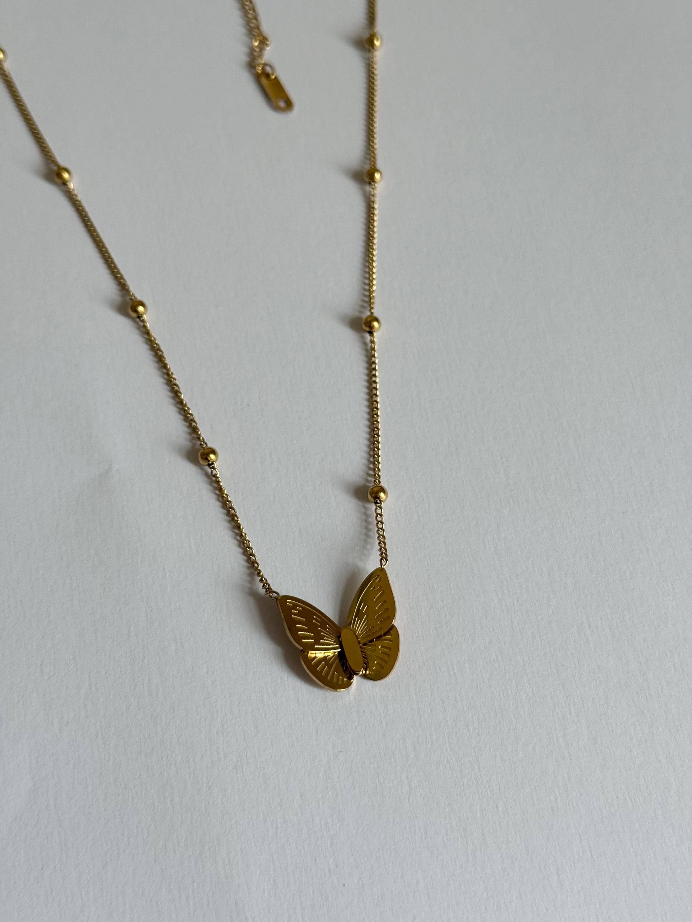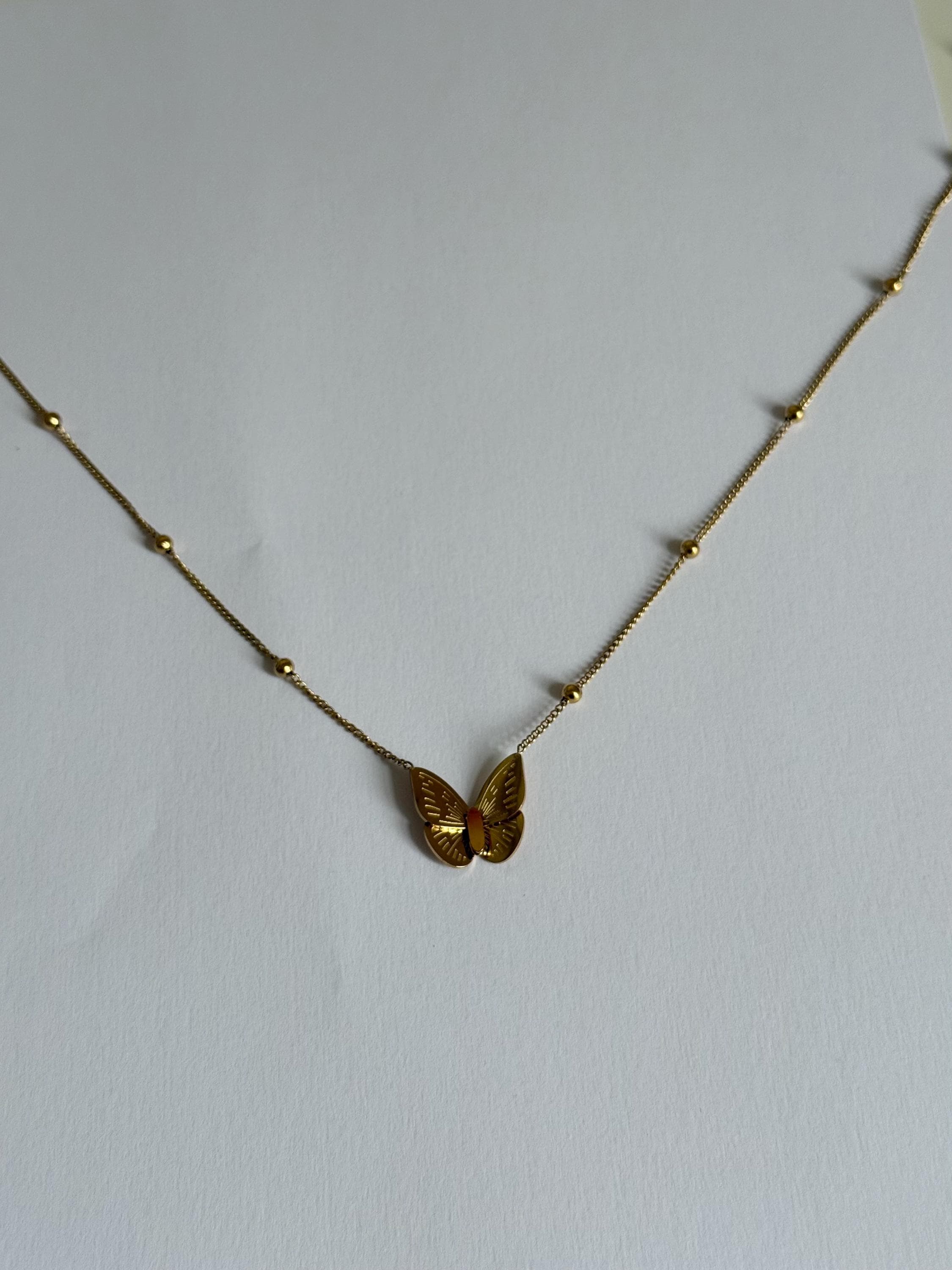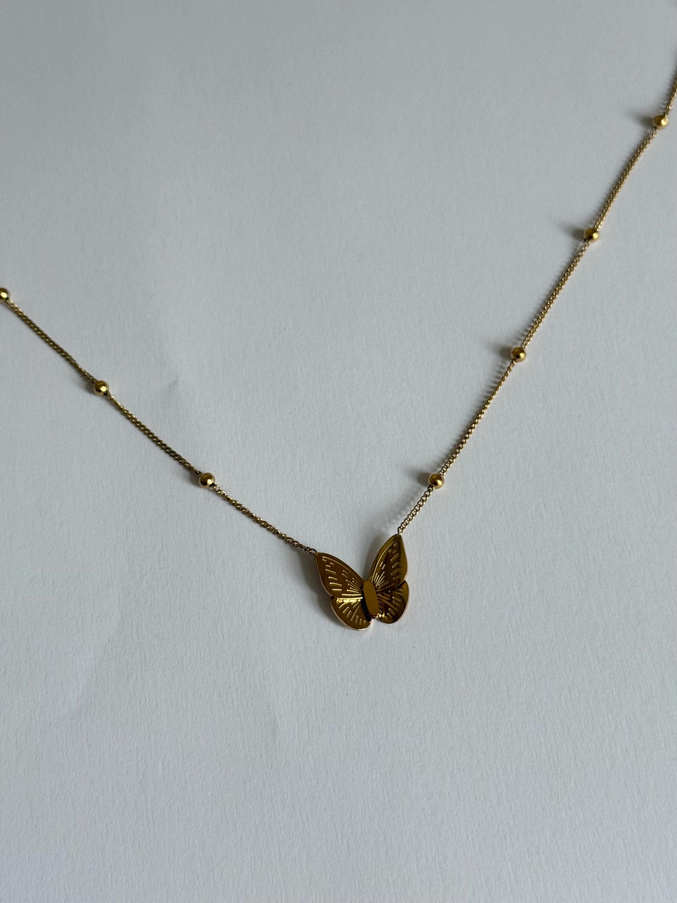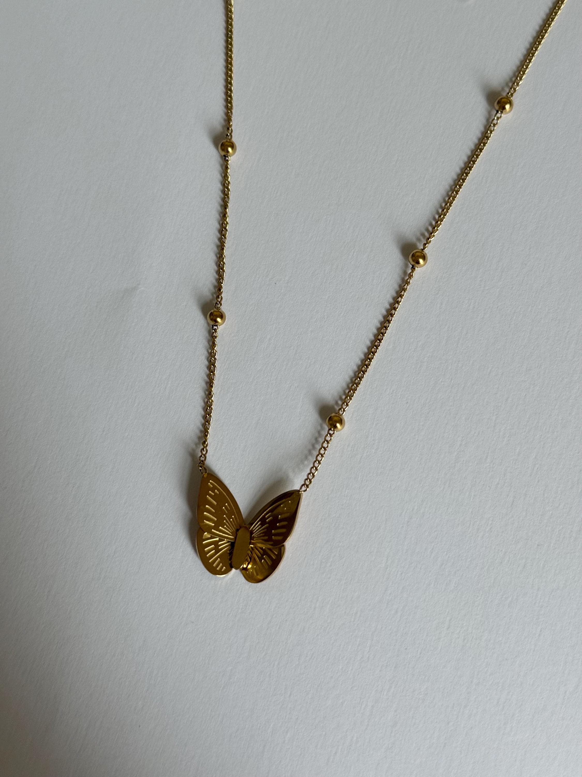A delicate gold butterfly necklace designed with a minimalist aesthetic and subtle details that catch the light beautifully.