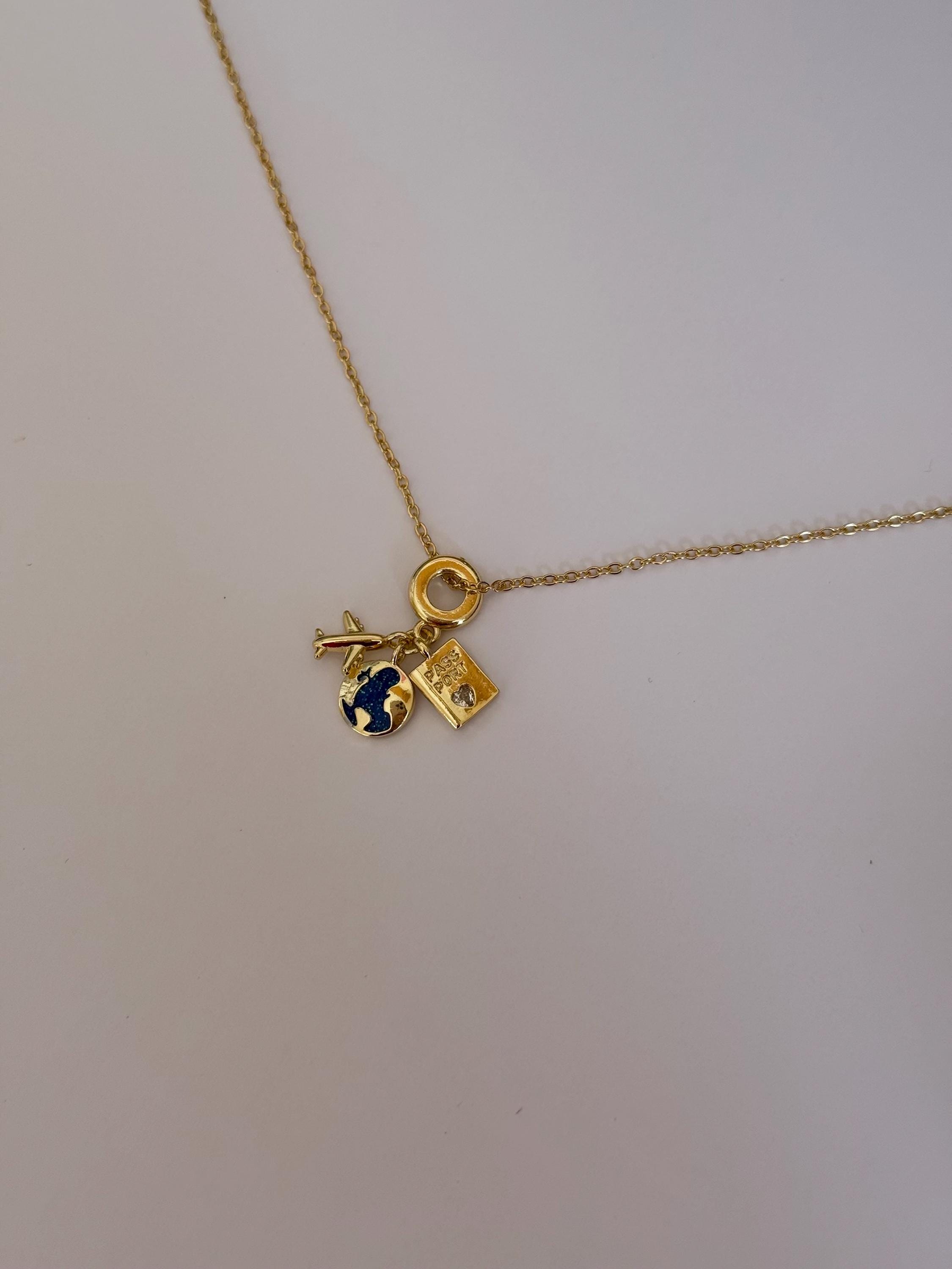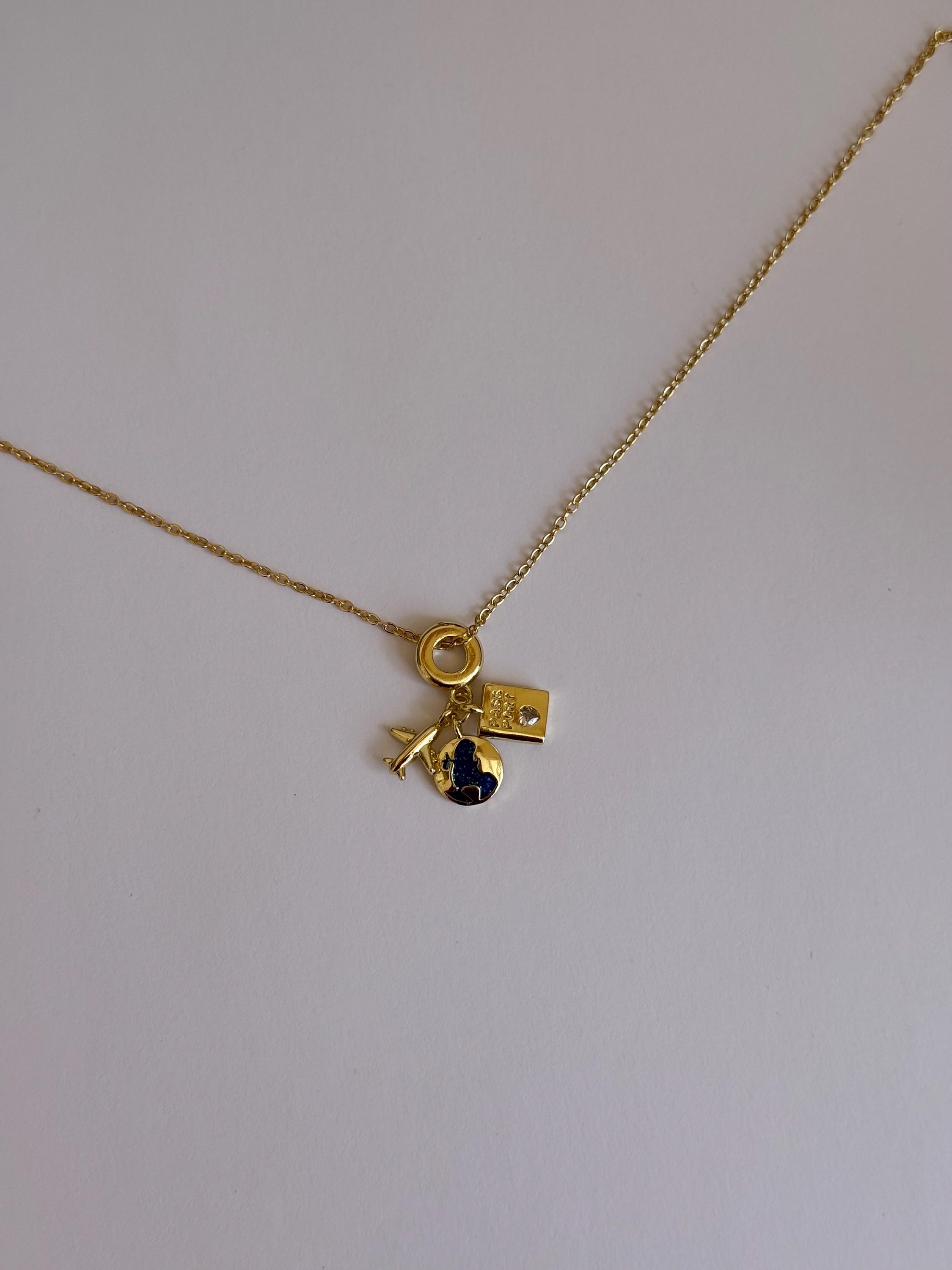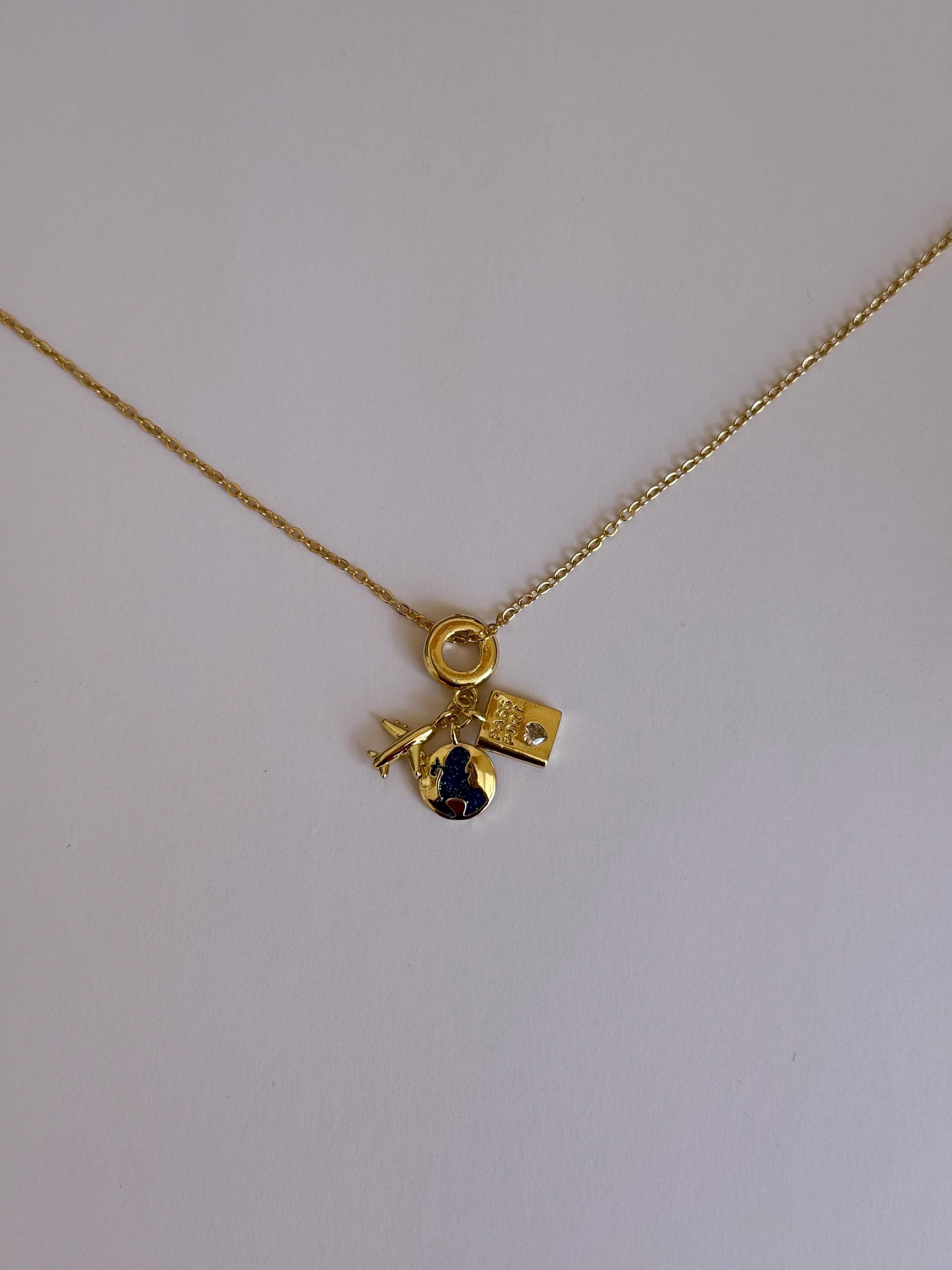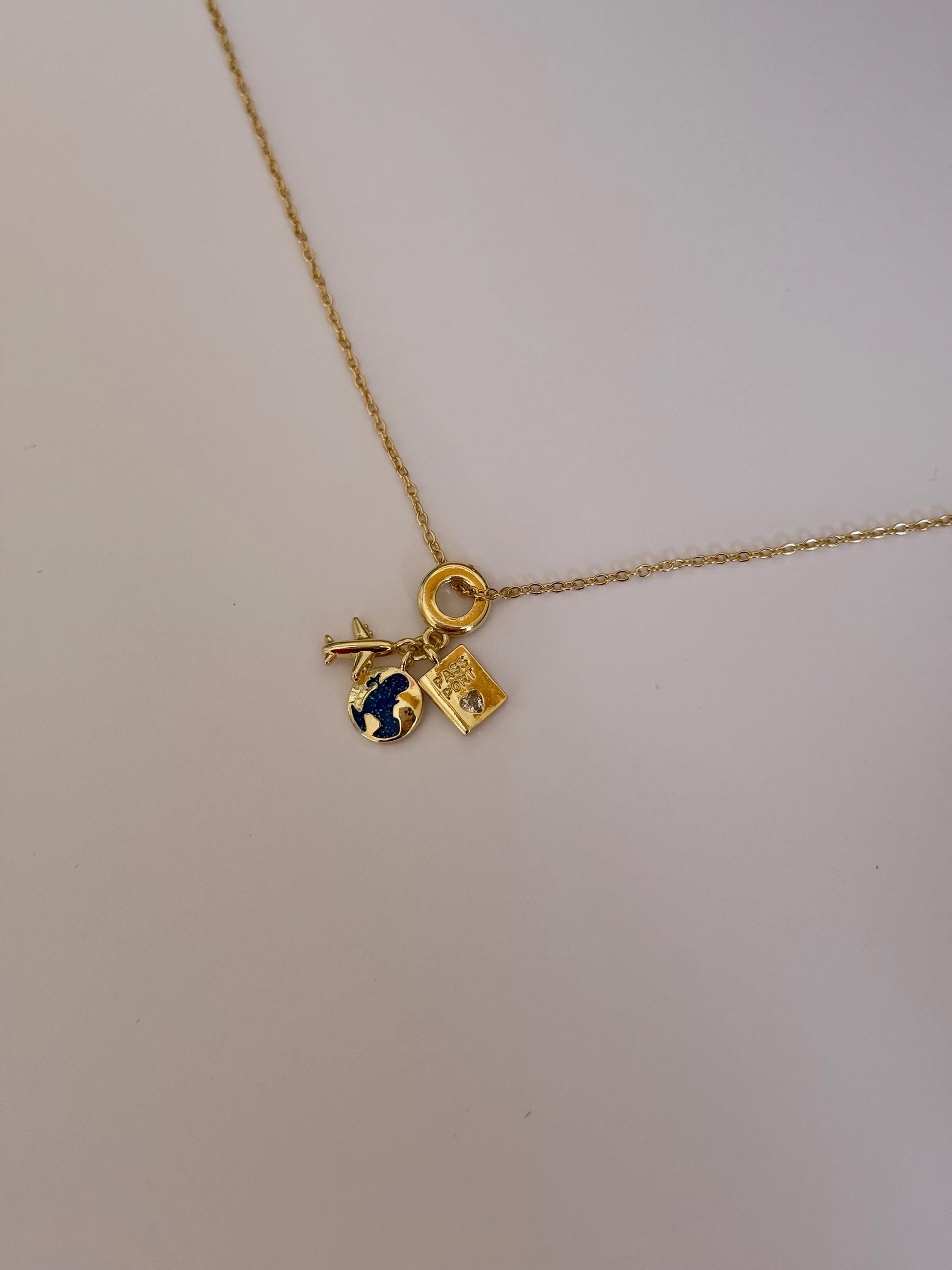 A delicate gold necklace featuring travel-inspired charms, including an airplane, globe, and passport.