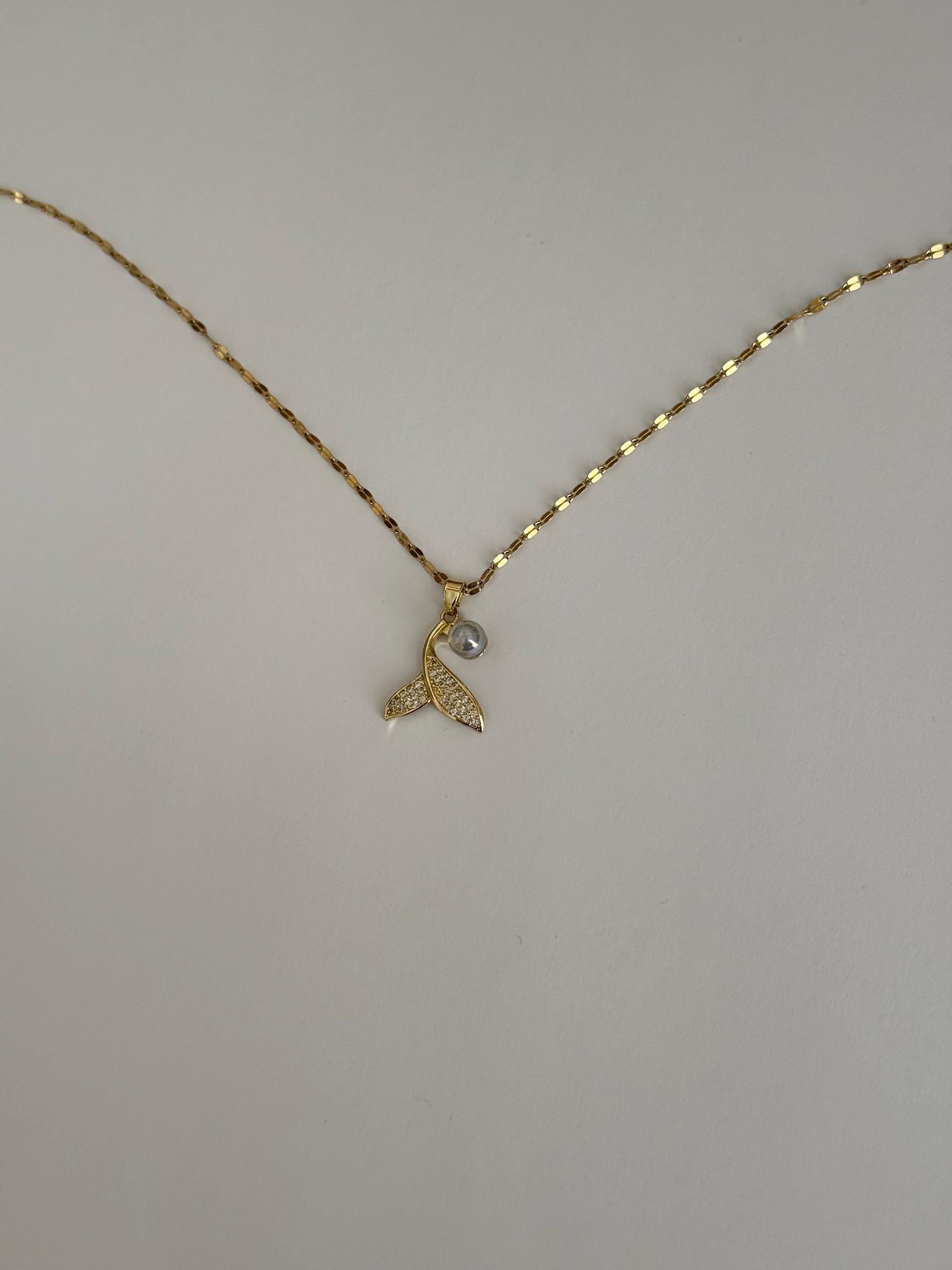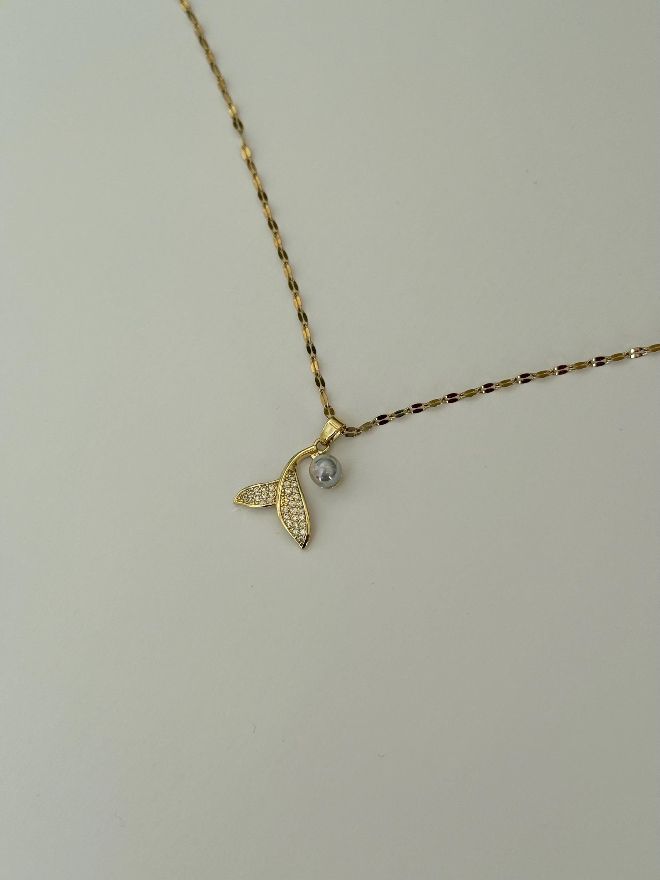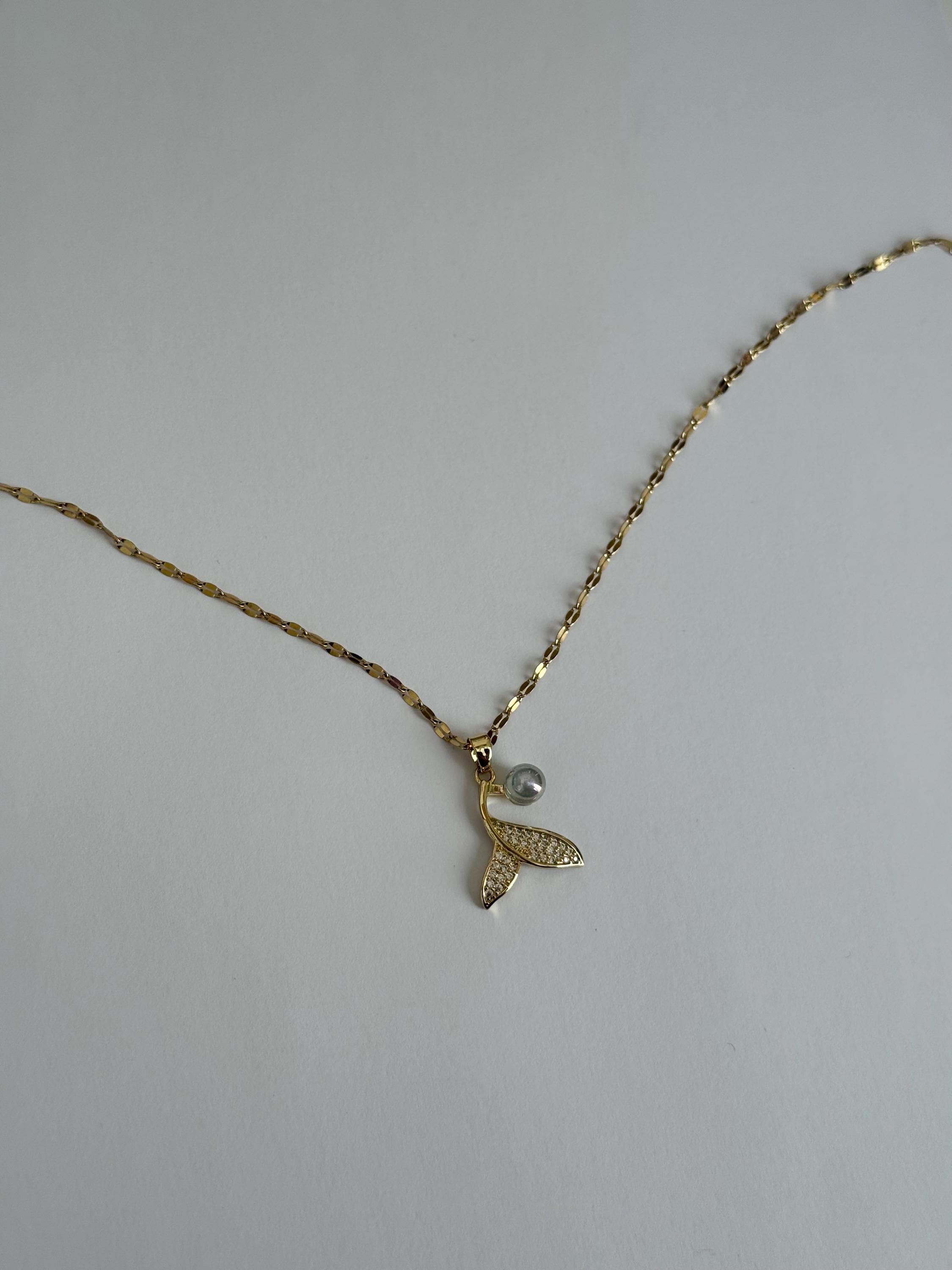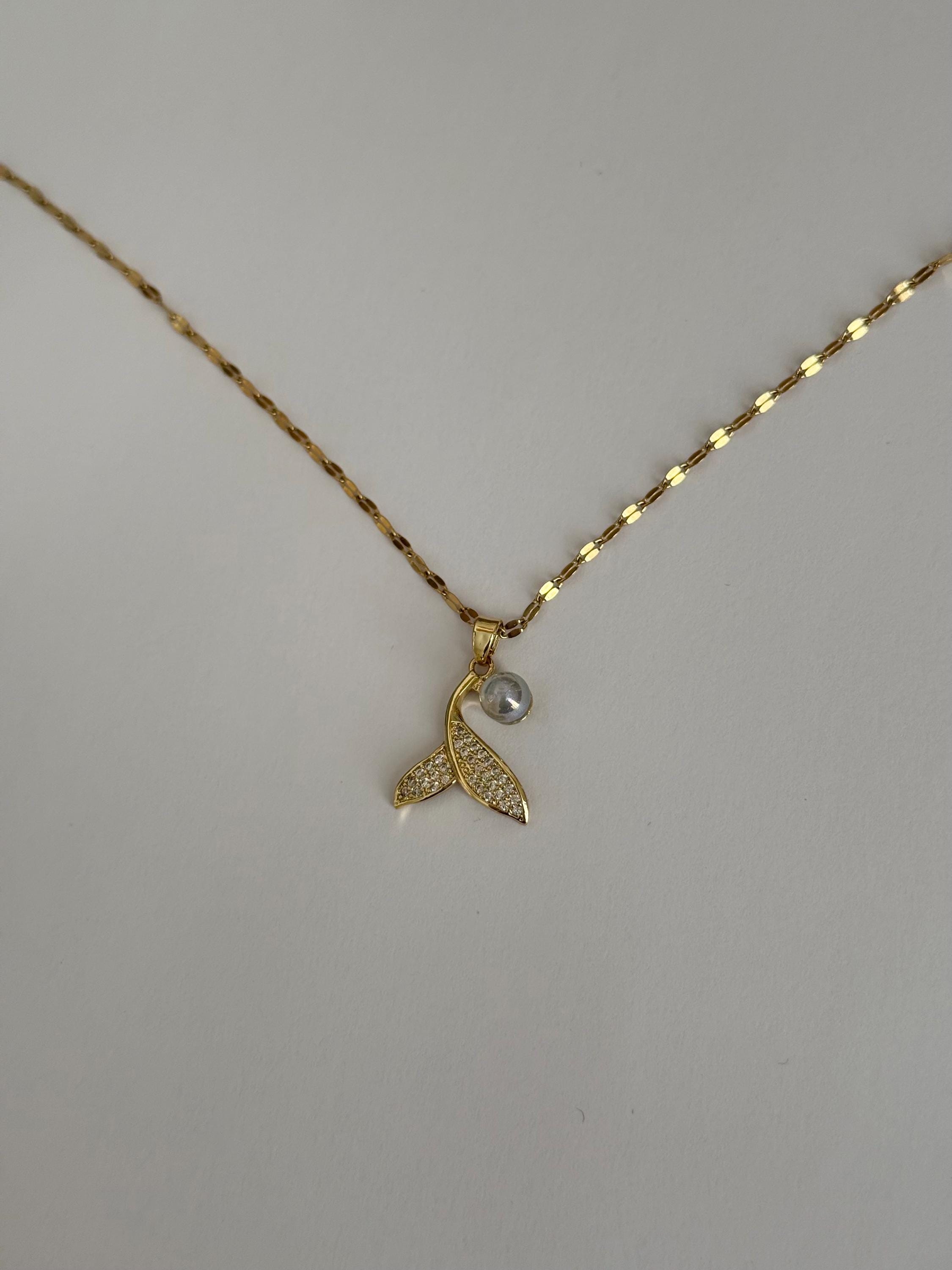 A delicate gold necklace featuring a sparkling mermaid tail pendant with zircon details and a small pearl accent.