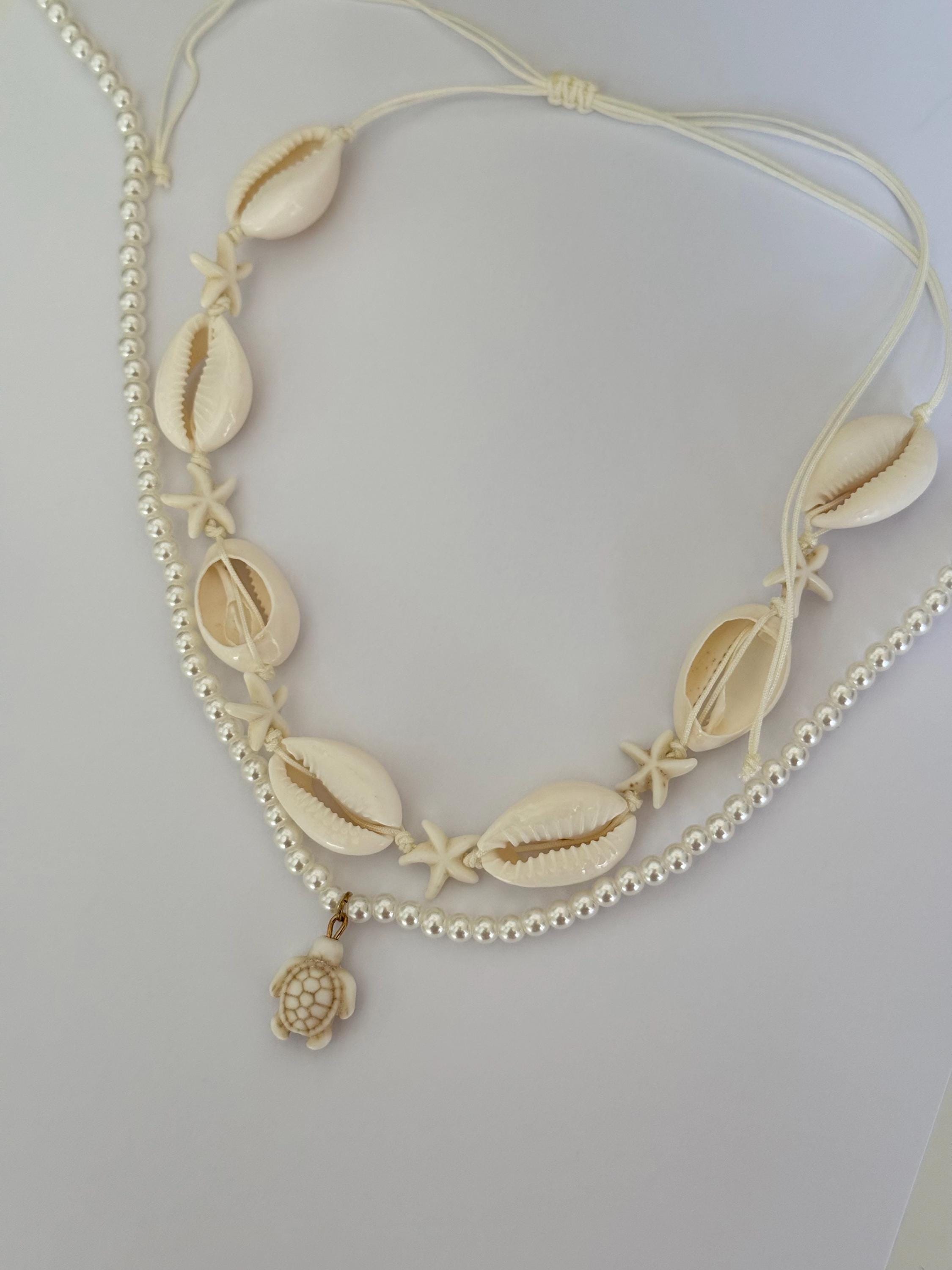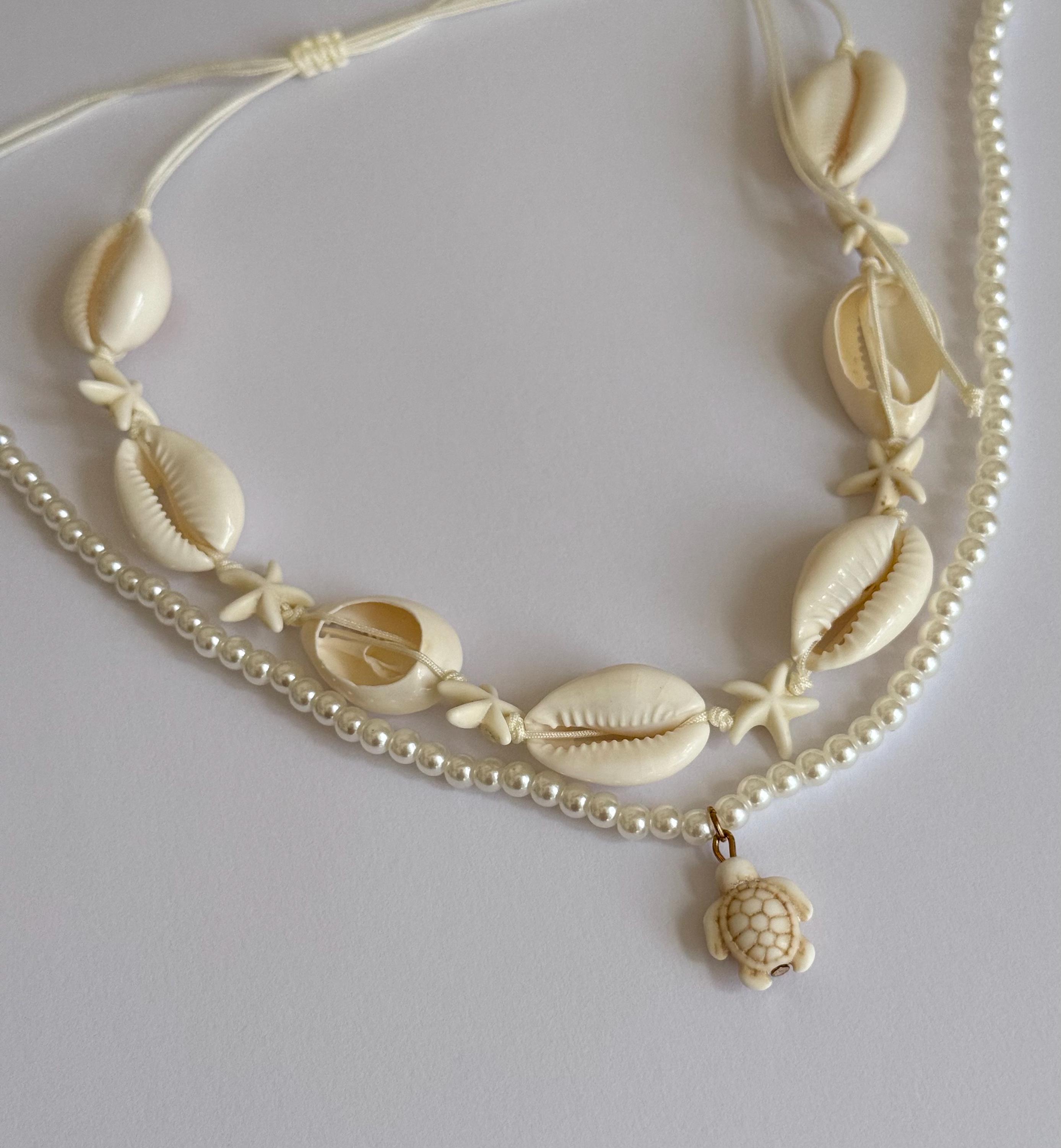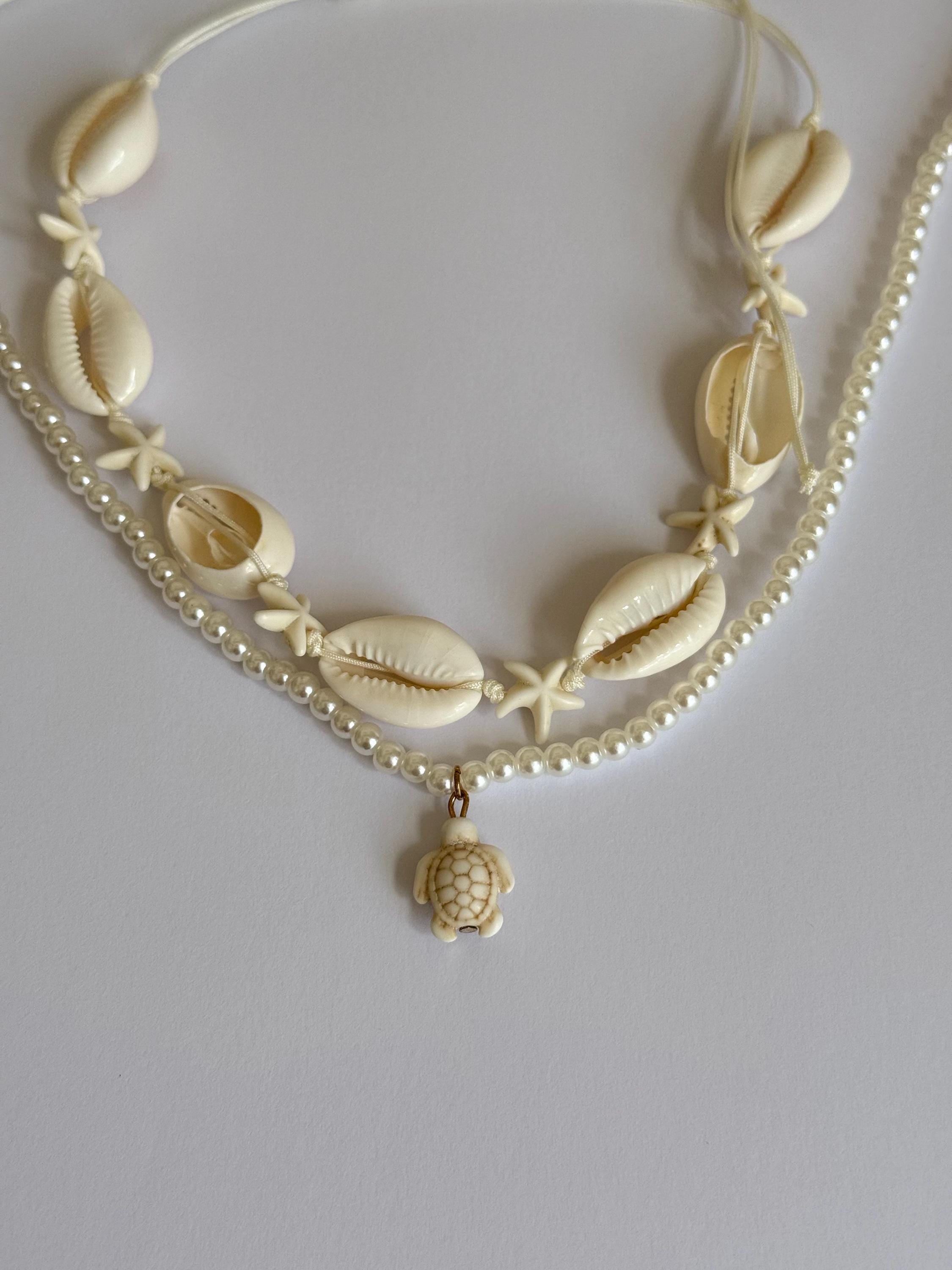 A beautiful layered beach necklace set featuring two complementary pieces: a shell and starfish choker and a delicate pearl necklace with a turtle charm.