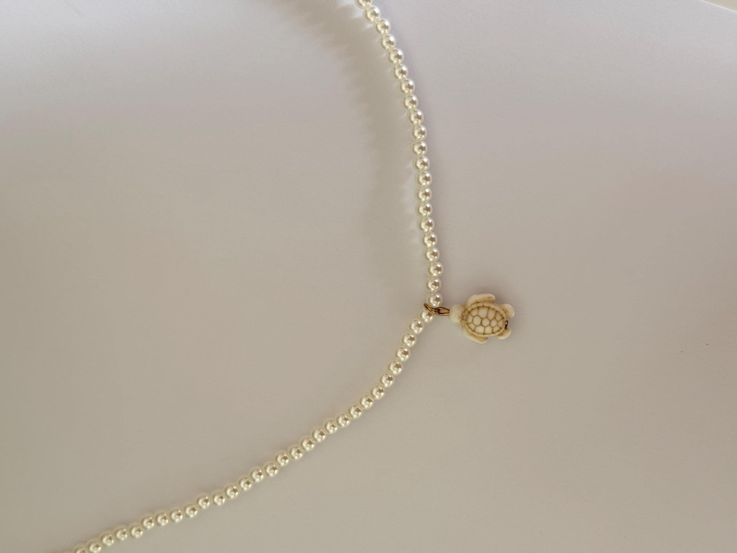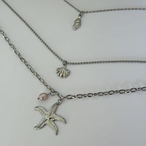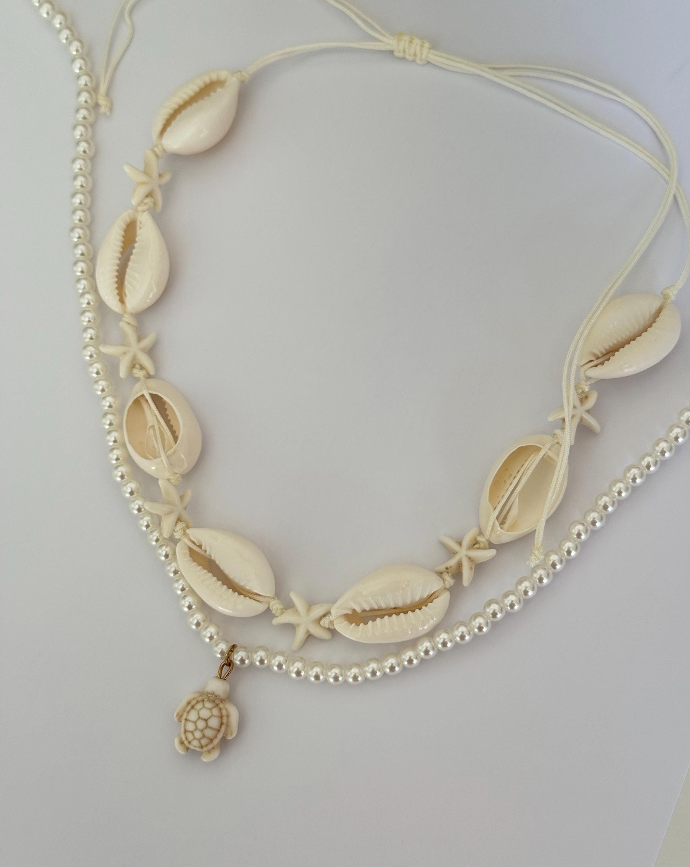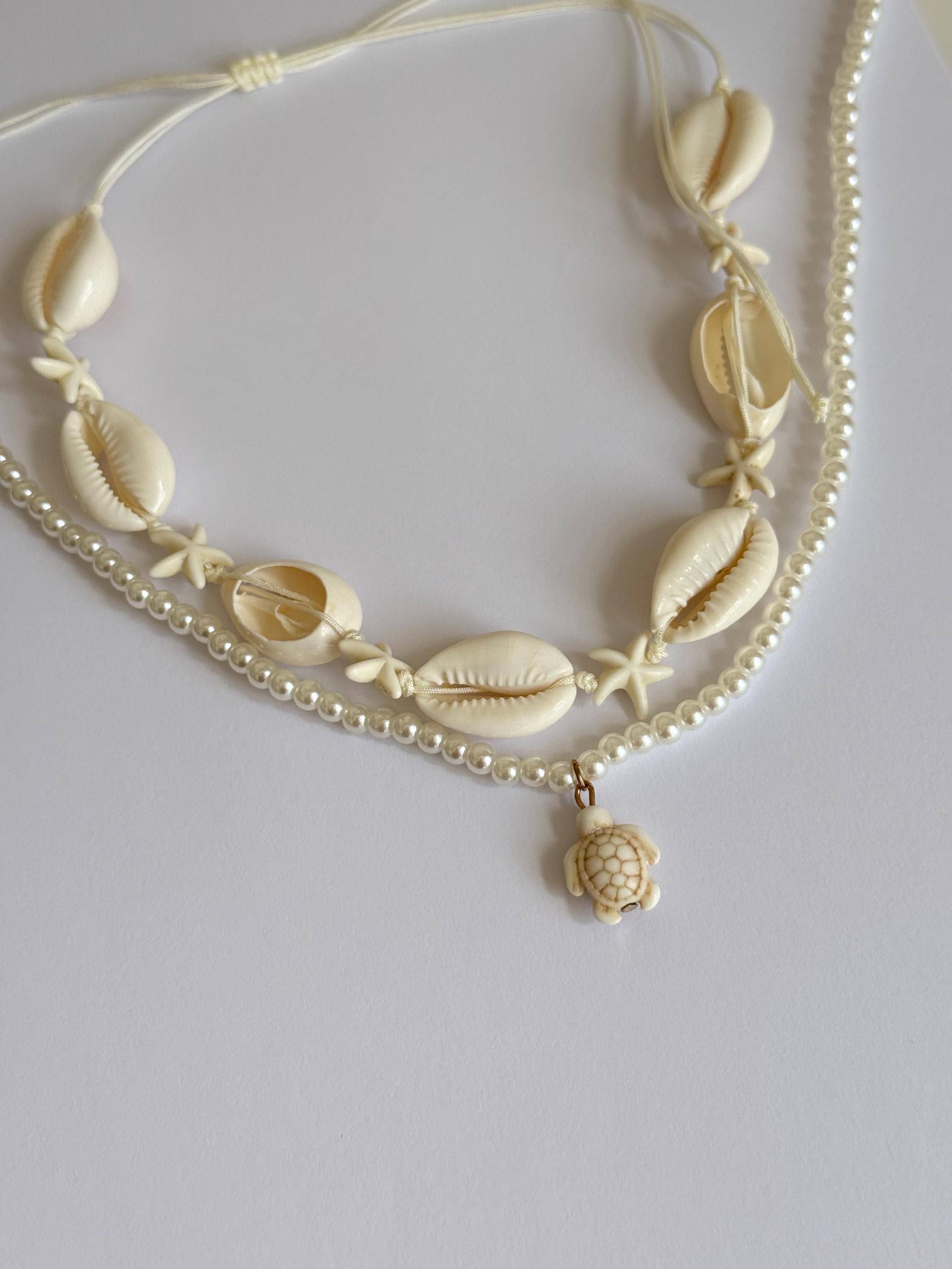 A beautiful layered beach necklace set featuring two complementary pieces: a shell and starfish choker and a delicate pearl necklace with a turtle charm.