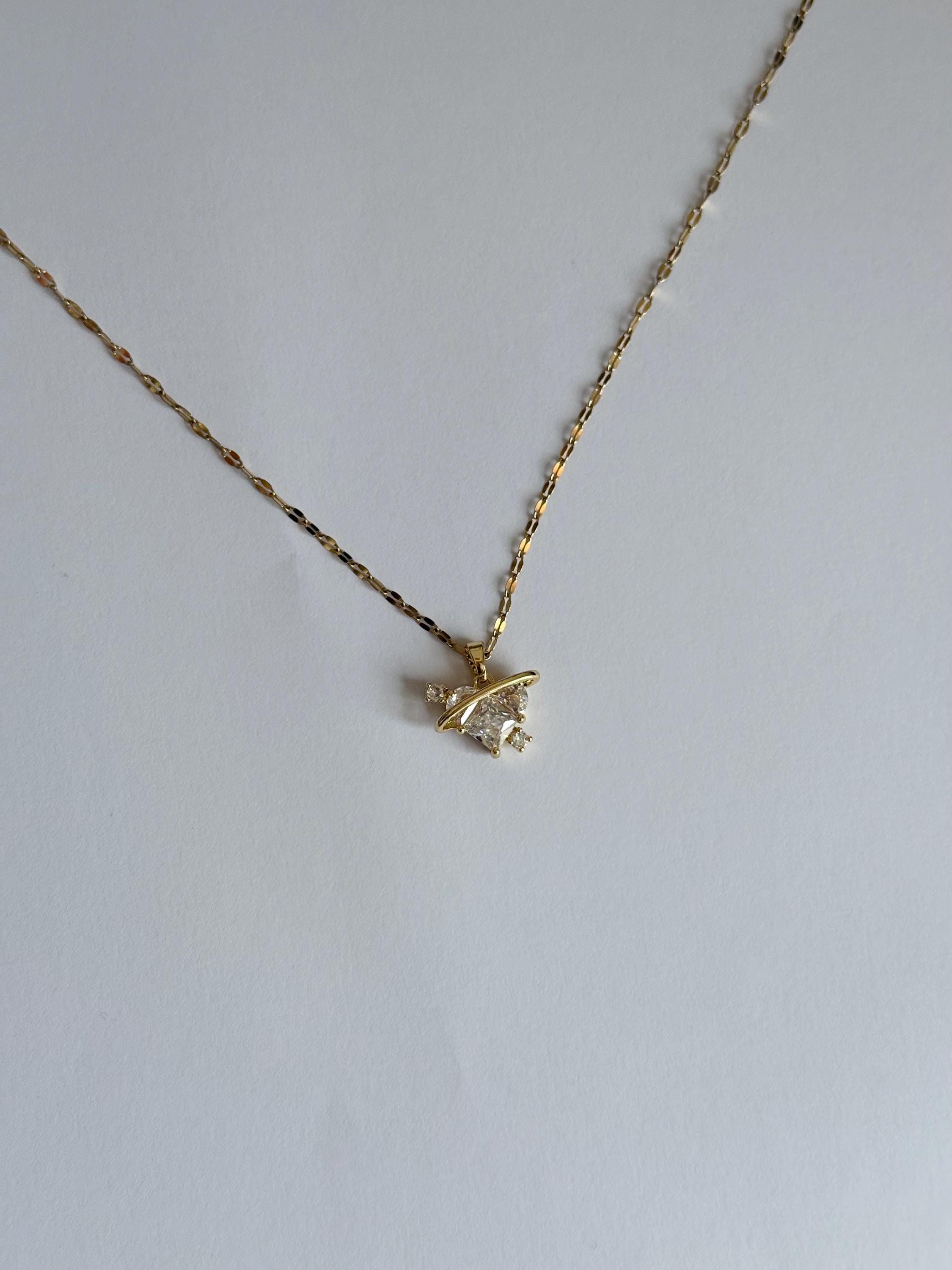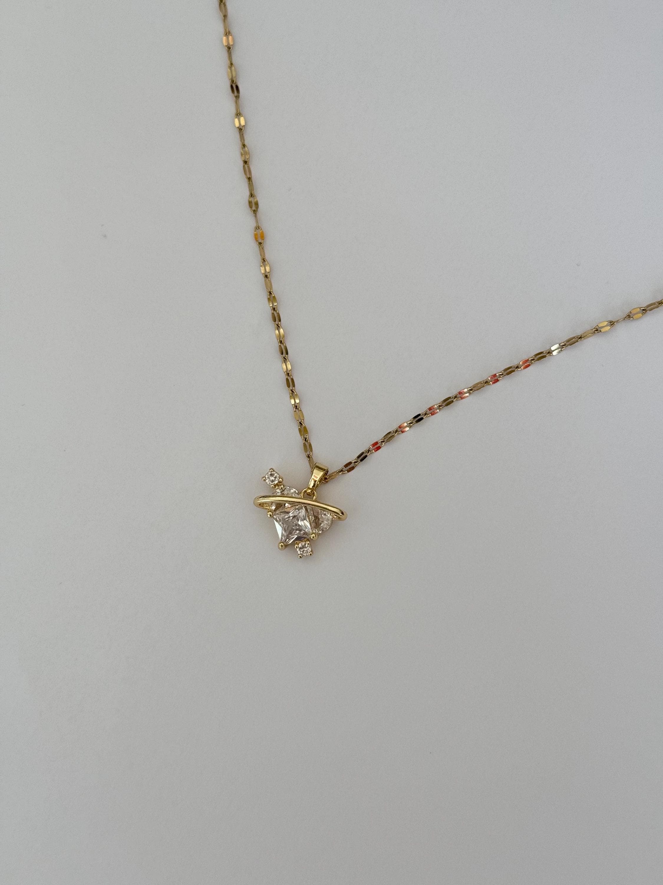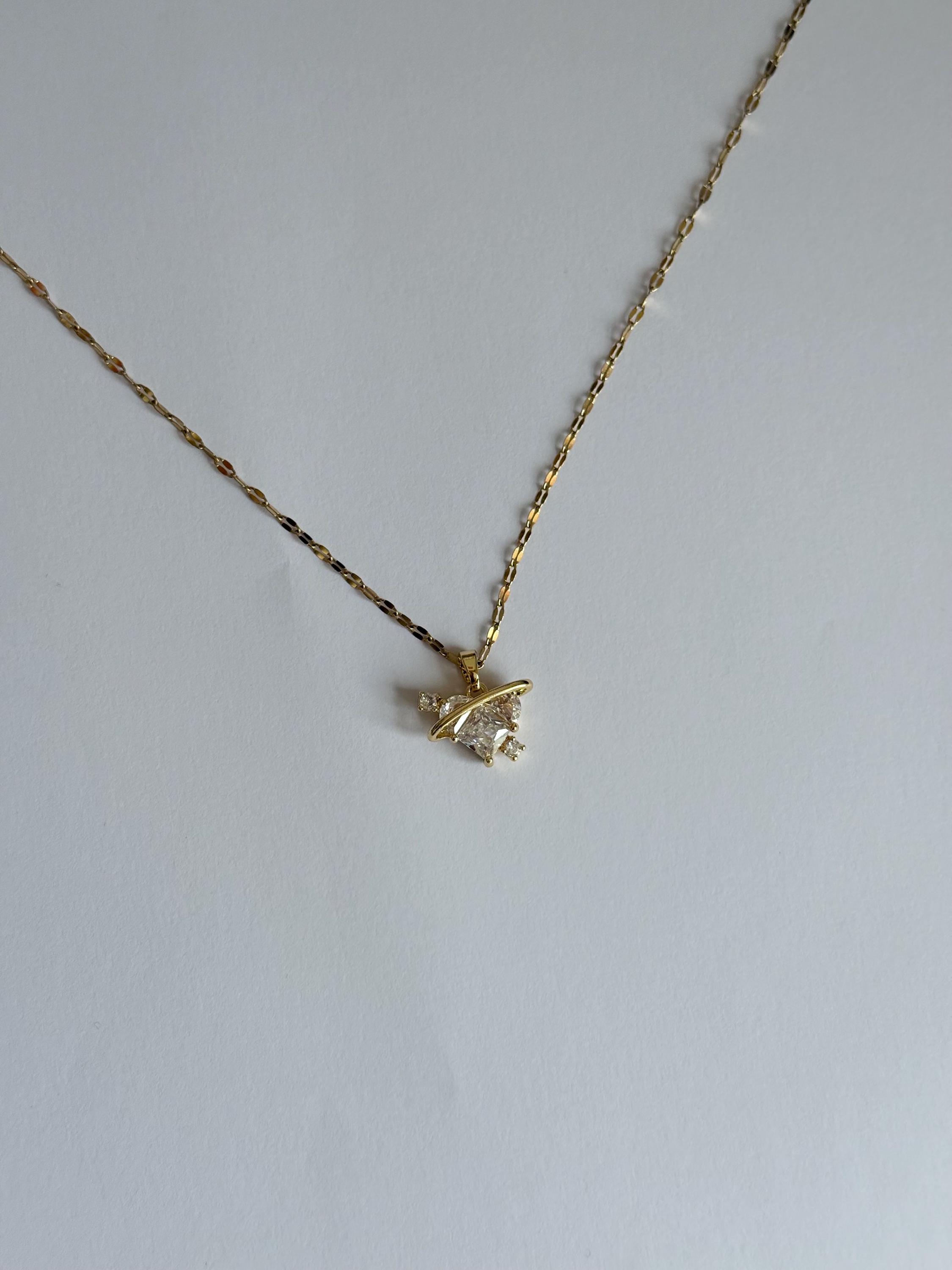 A unique gold necklace featuring a heart-shaped clear zircon pendant with a modern ring detail around it (Saturn-inspired design).