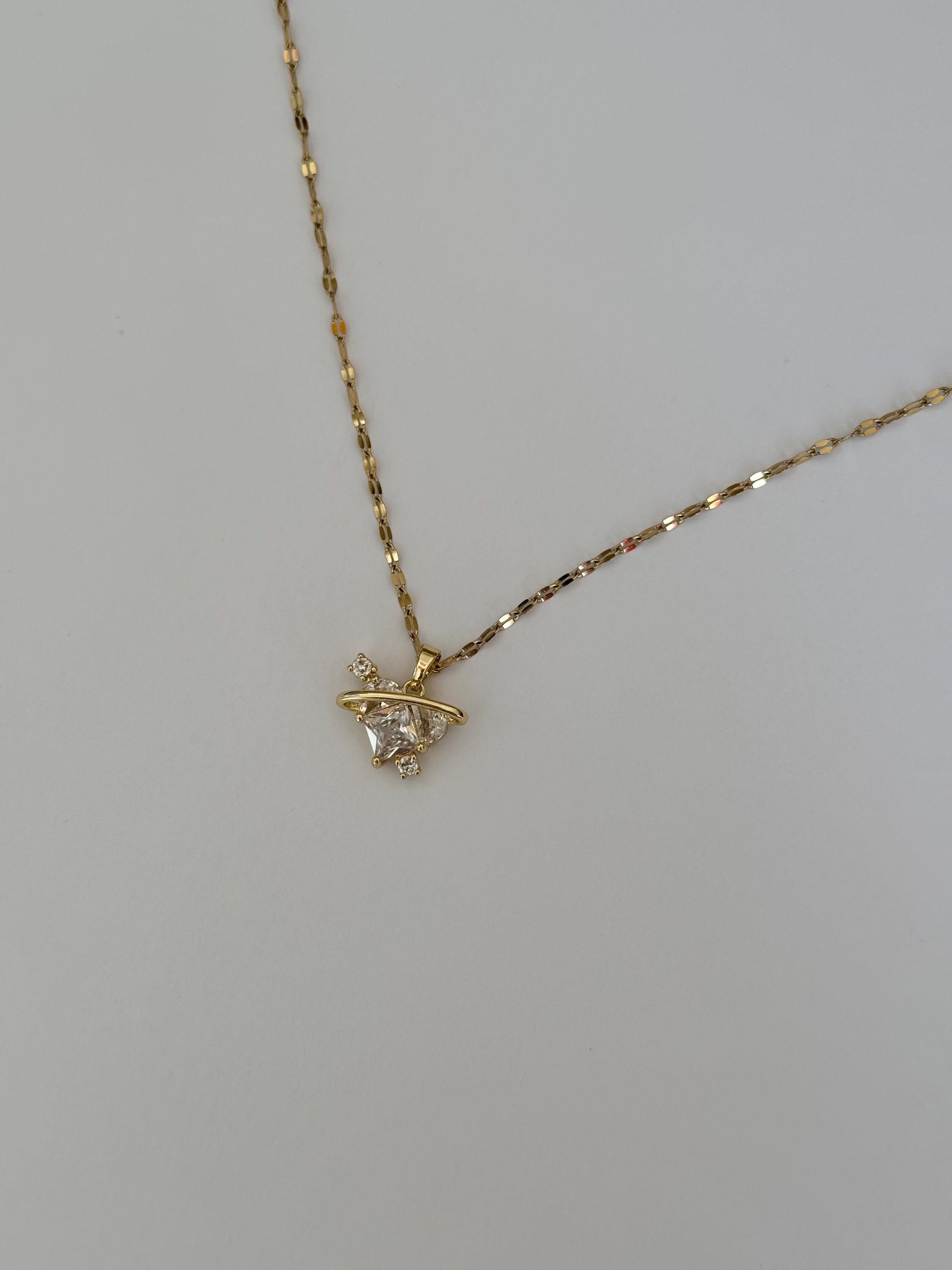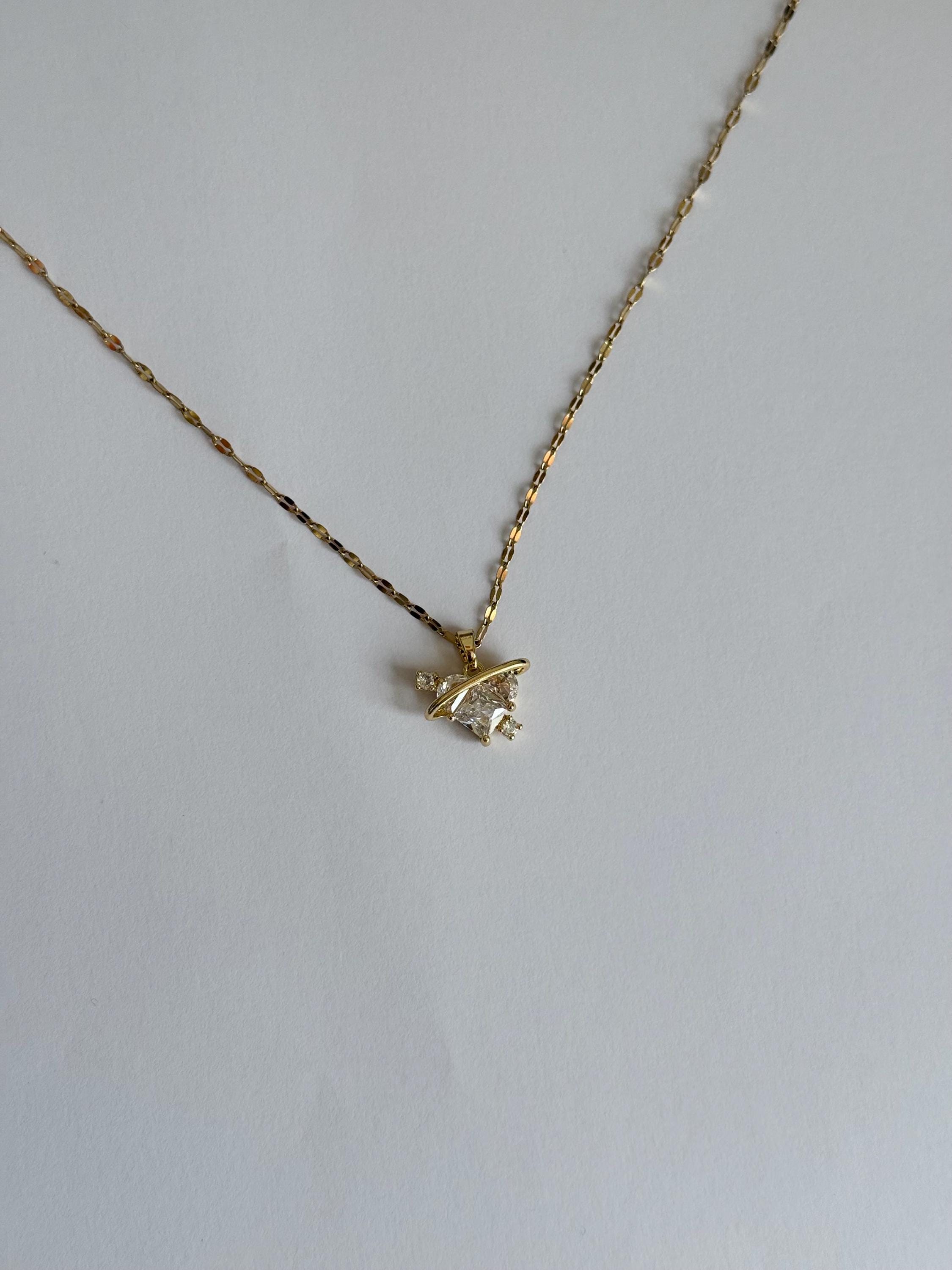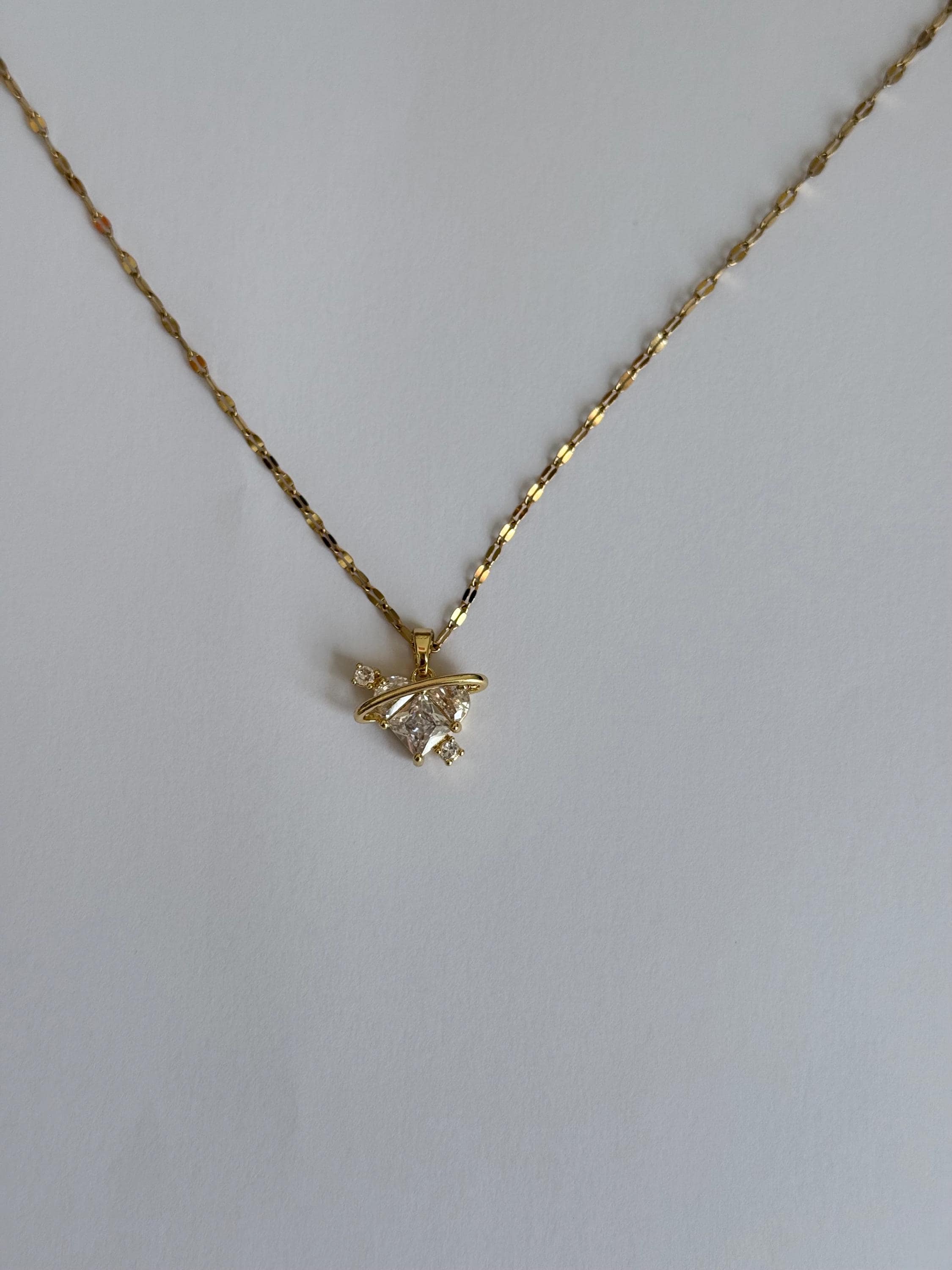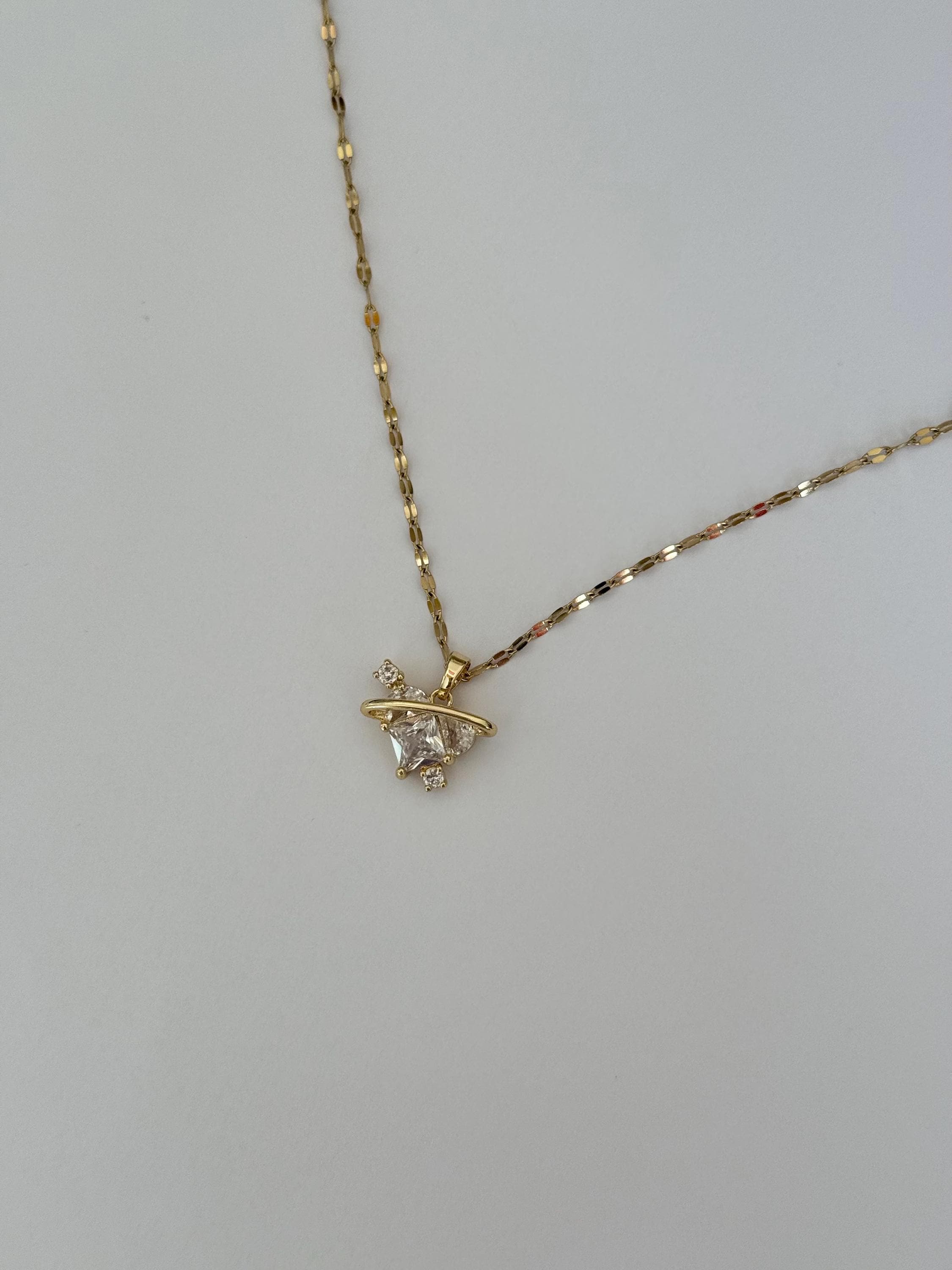 A unique gold necklace featuring a heart-shaped clear zircon pendant with a modern ring detail around it (Saturn-inspired design).