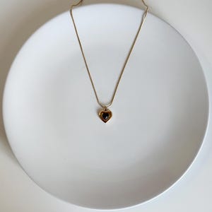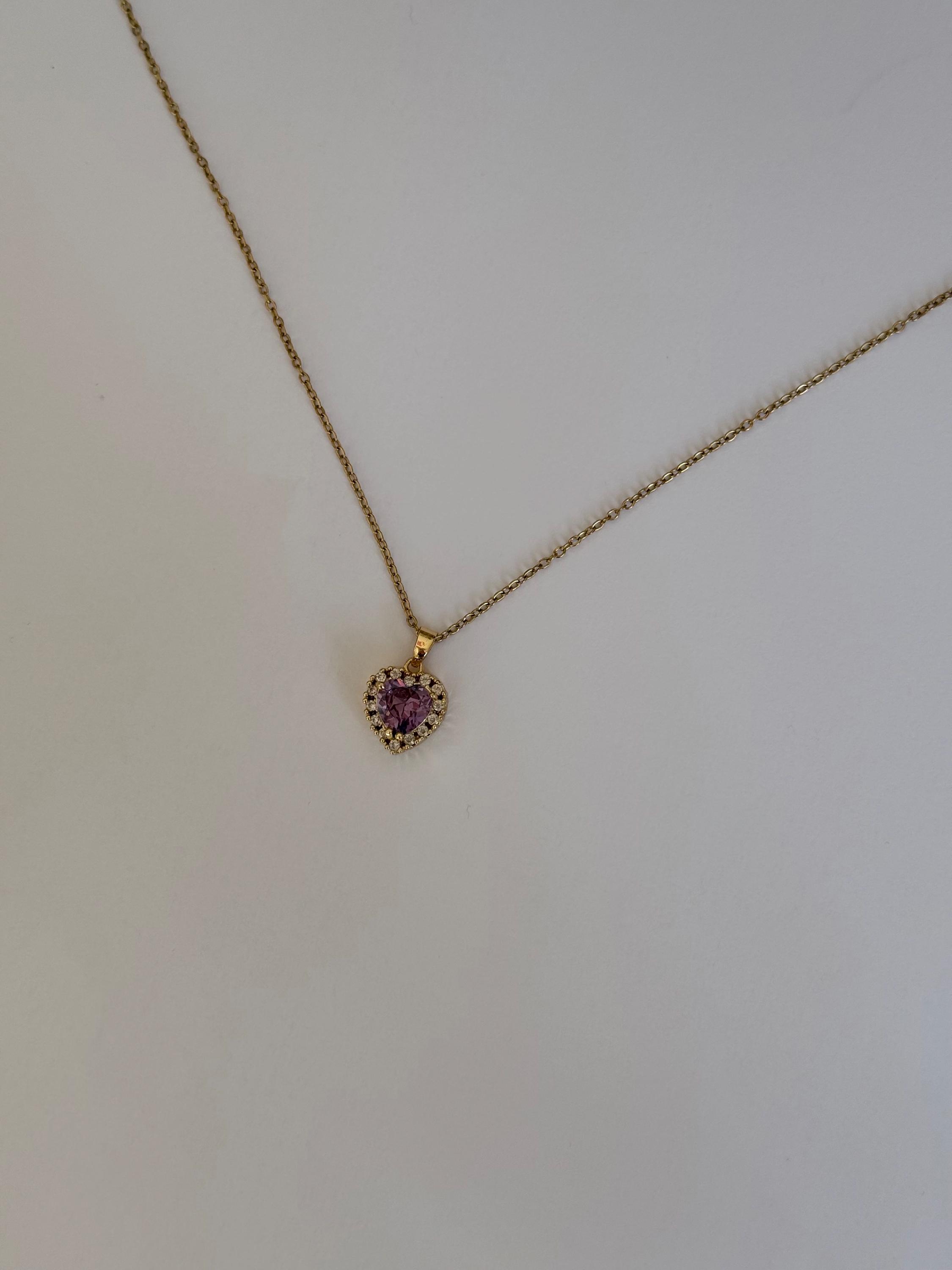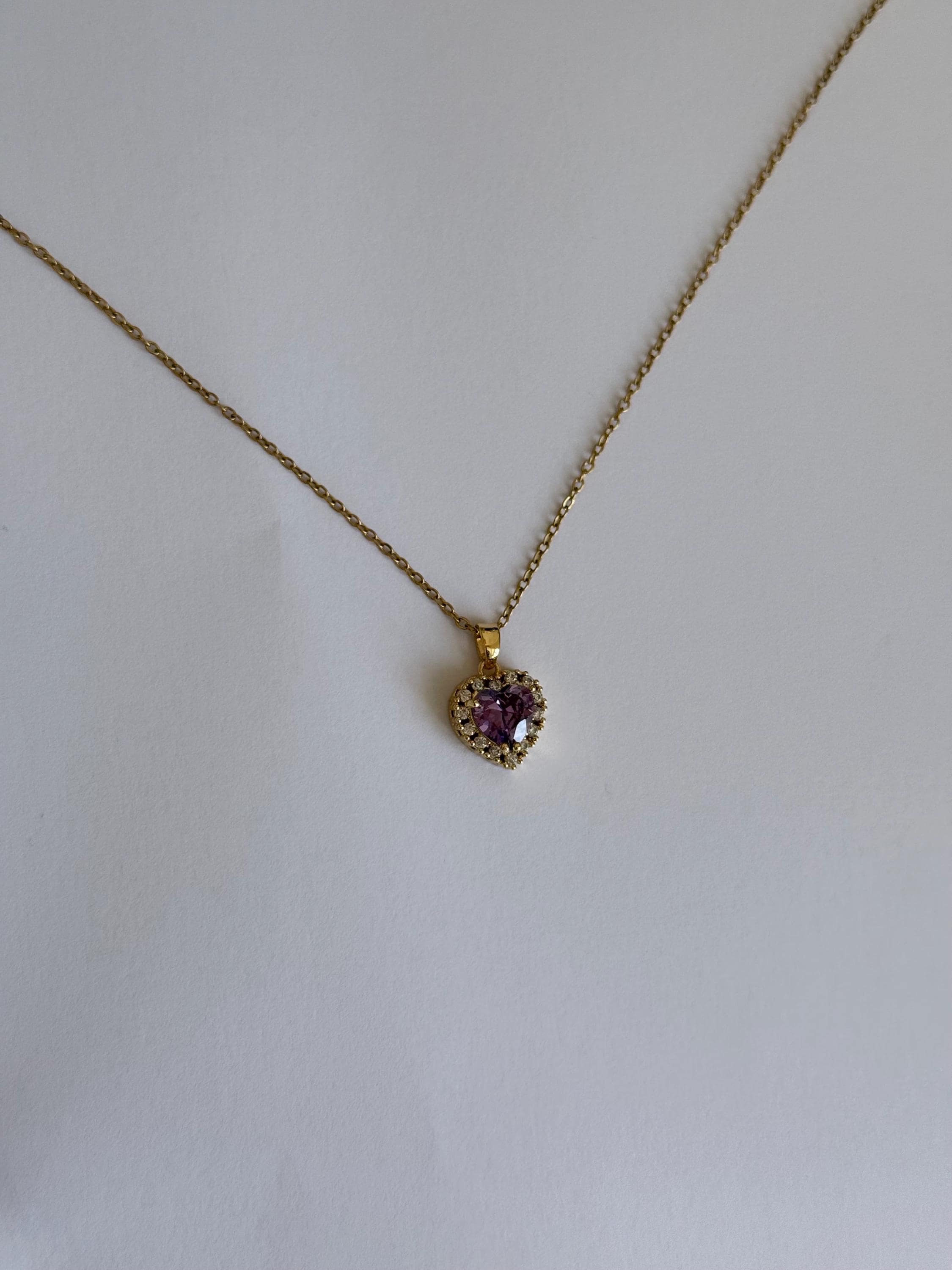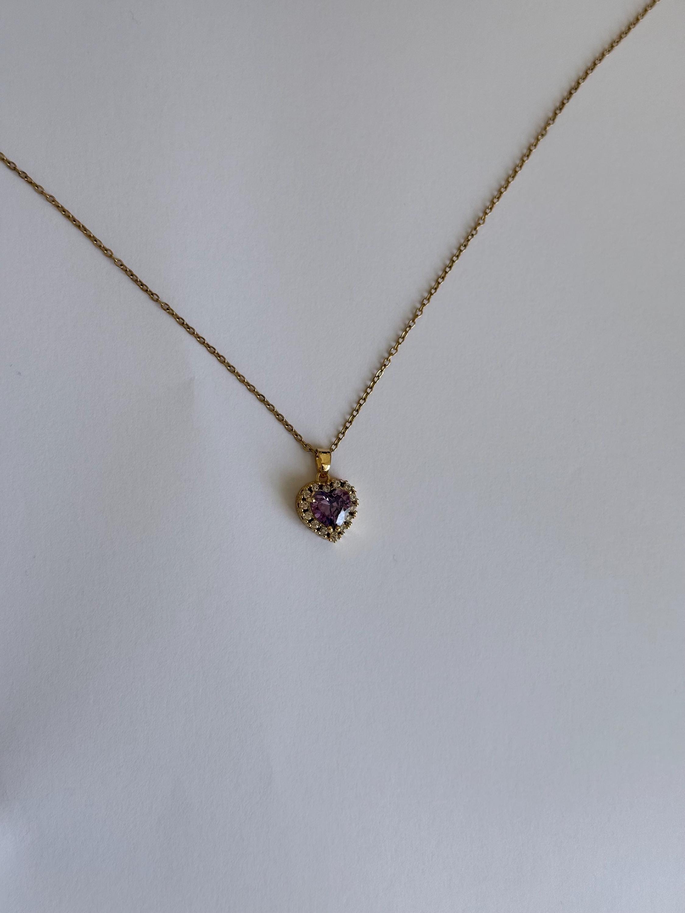 A beautiful gold necklace featuring a purple heart-shaped zircon stone surrounded by a sparkling halo of clear crystals.