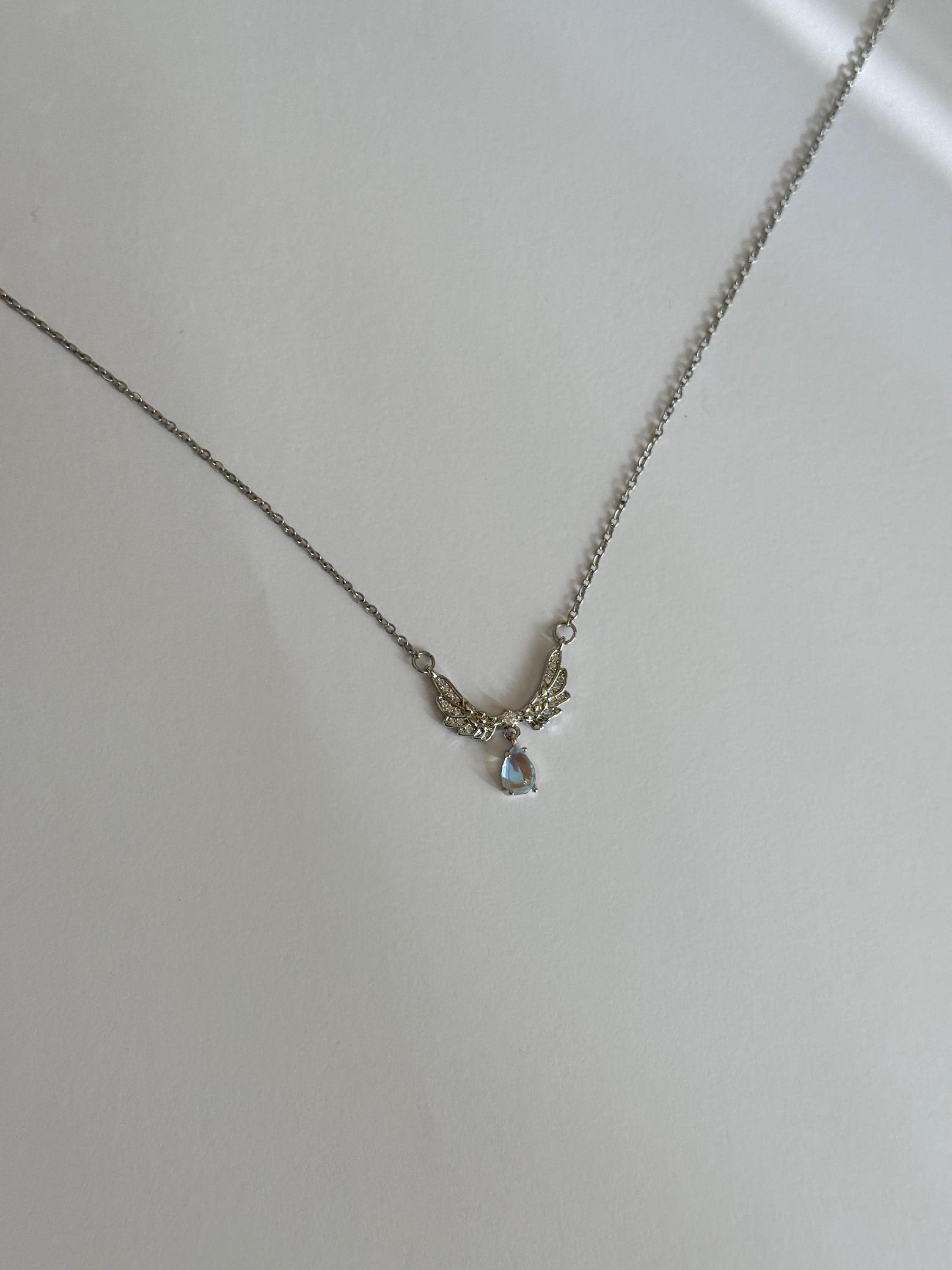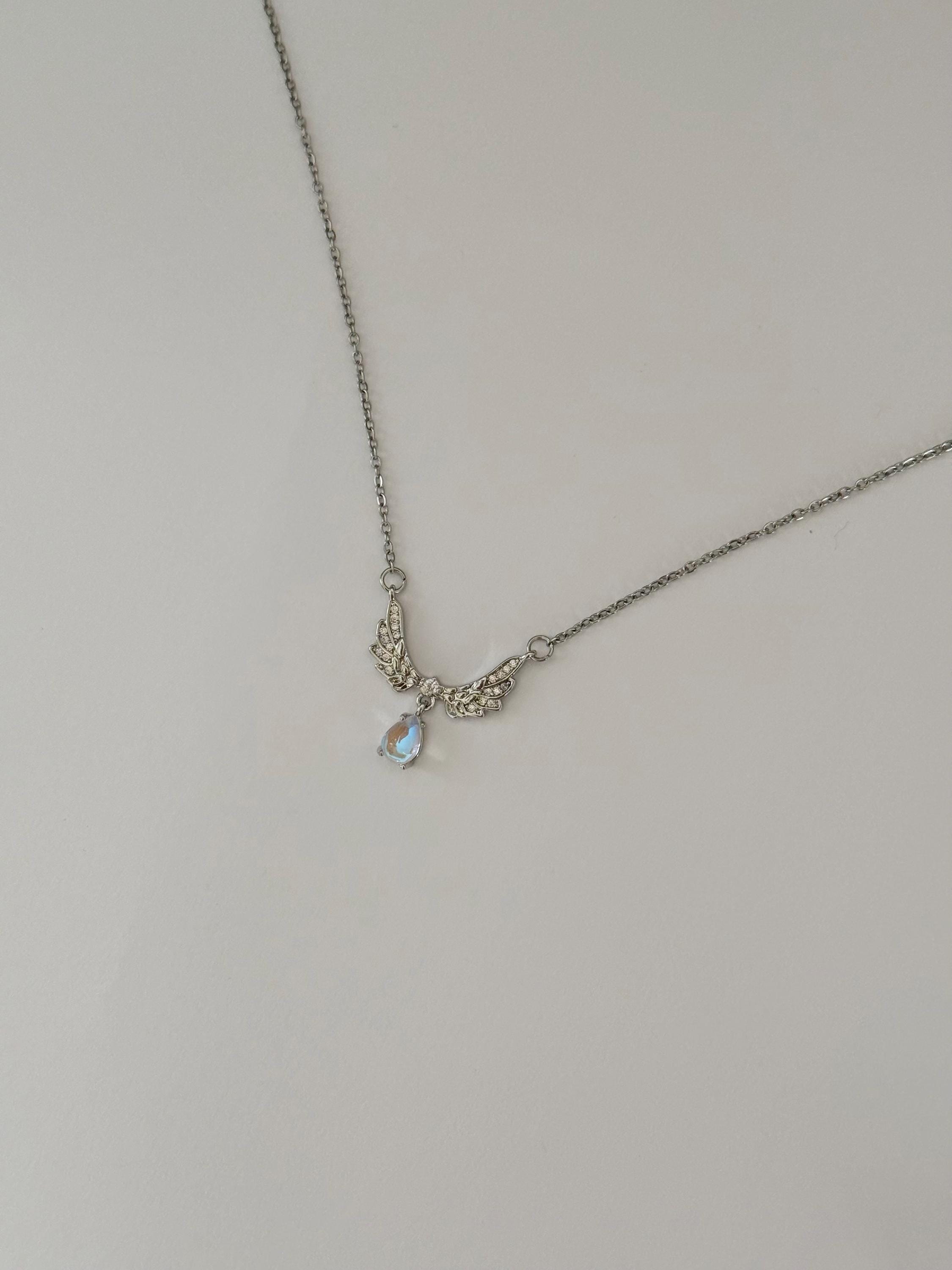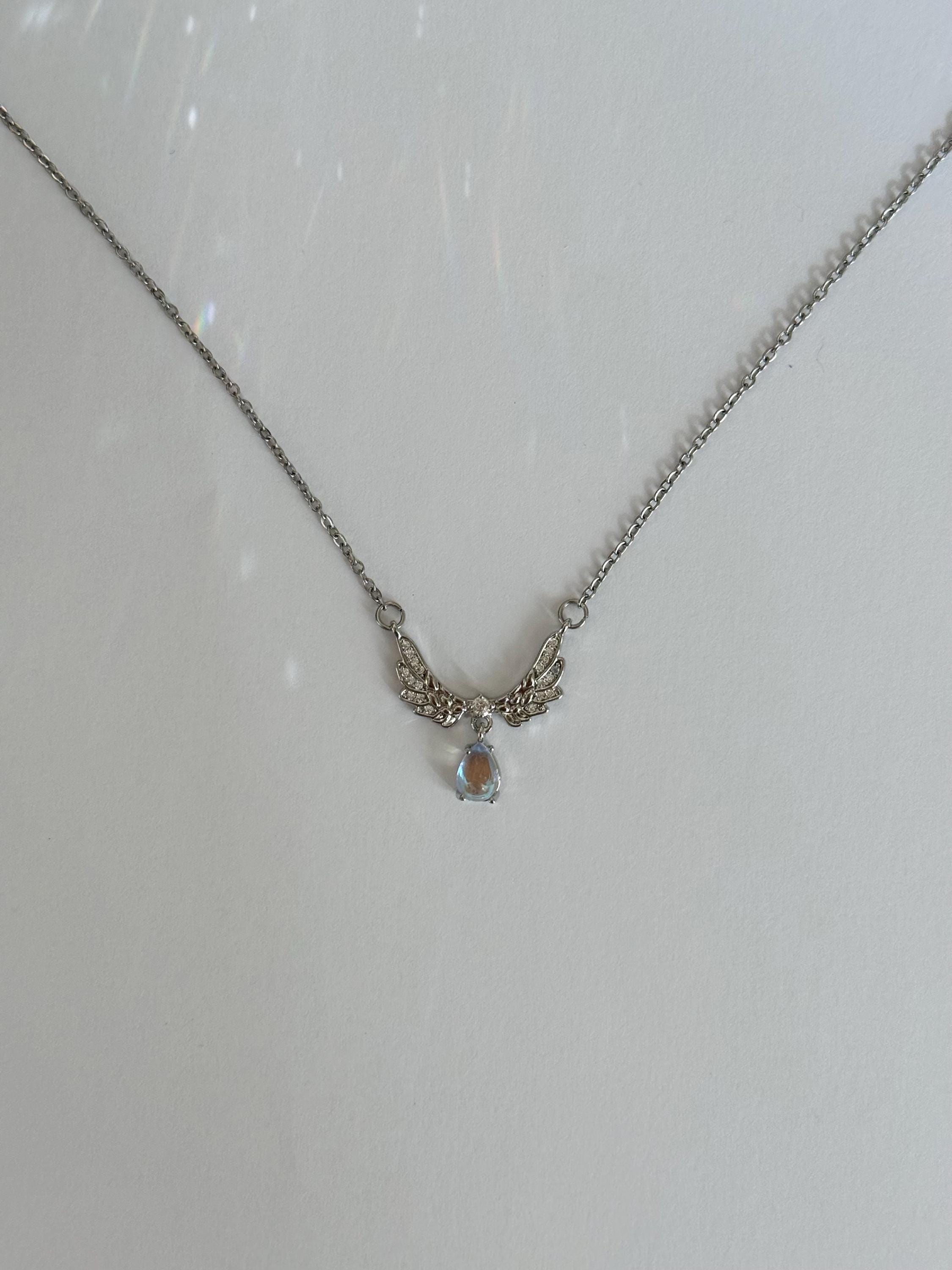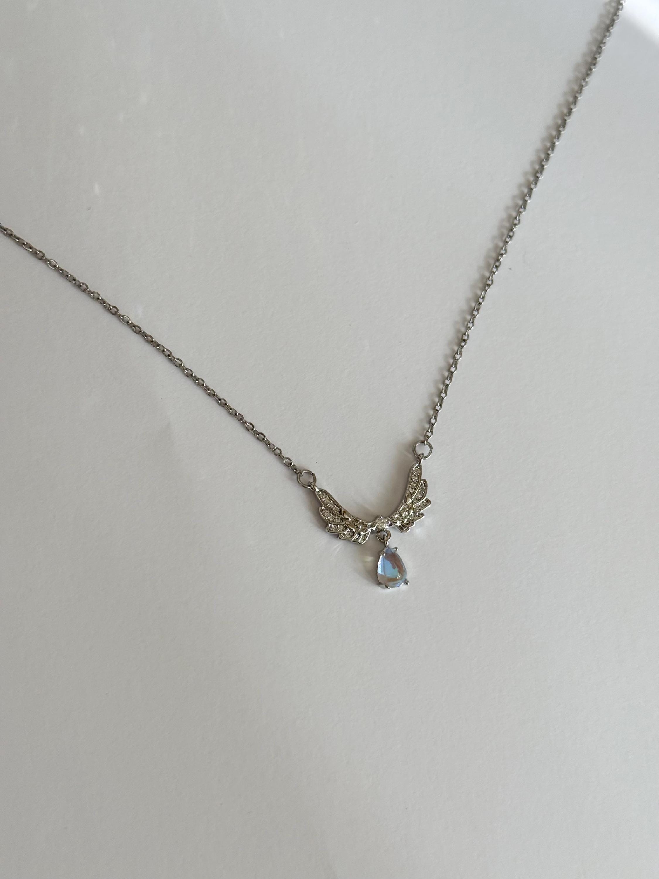 A delicate angel wing necklace featuring detailed silver wings and a shimmering teardrop opal-style pendant.