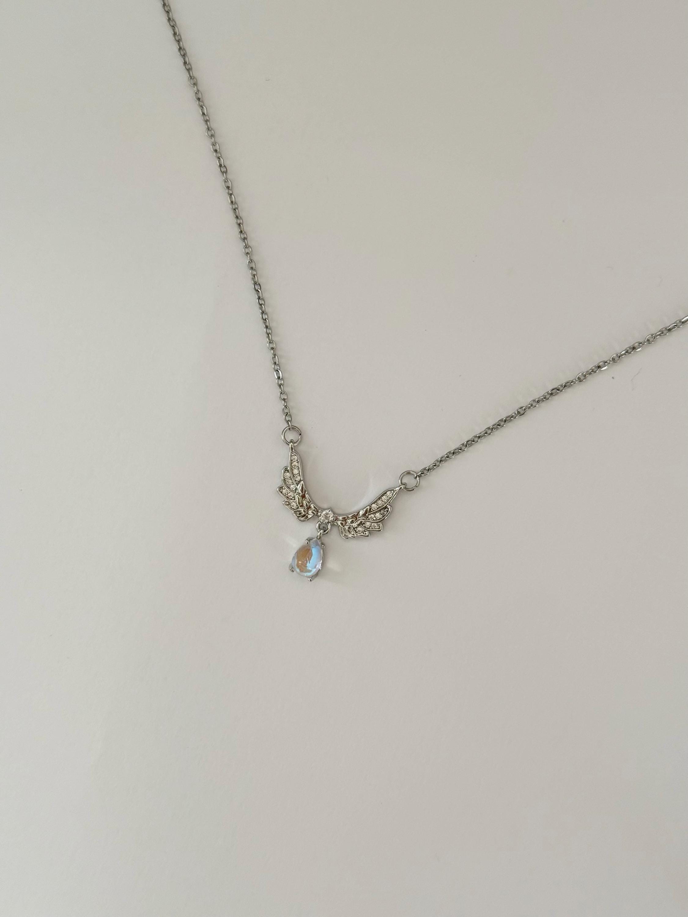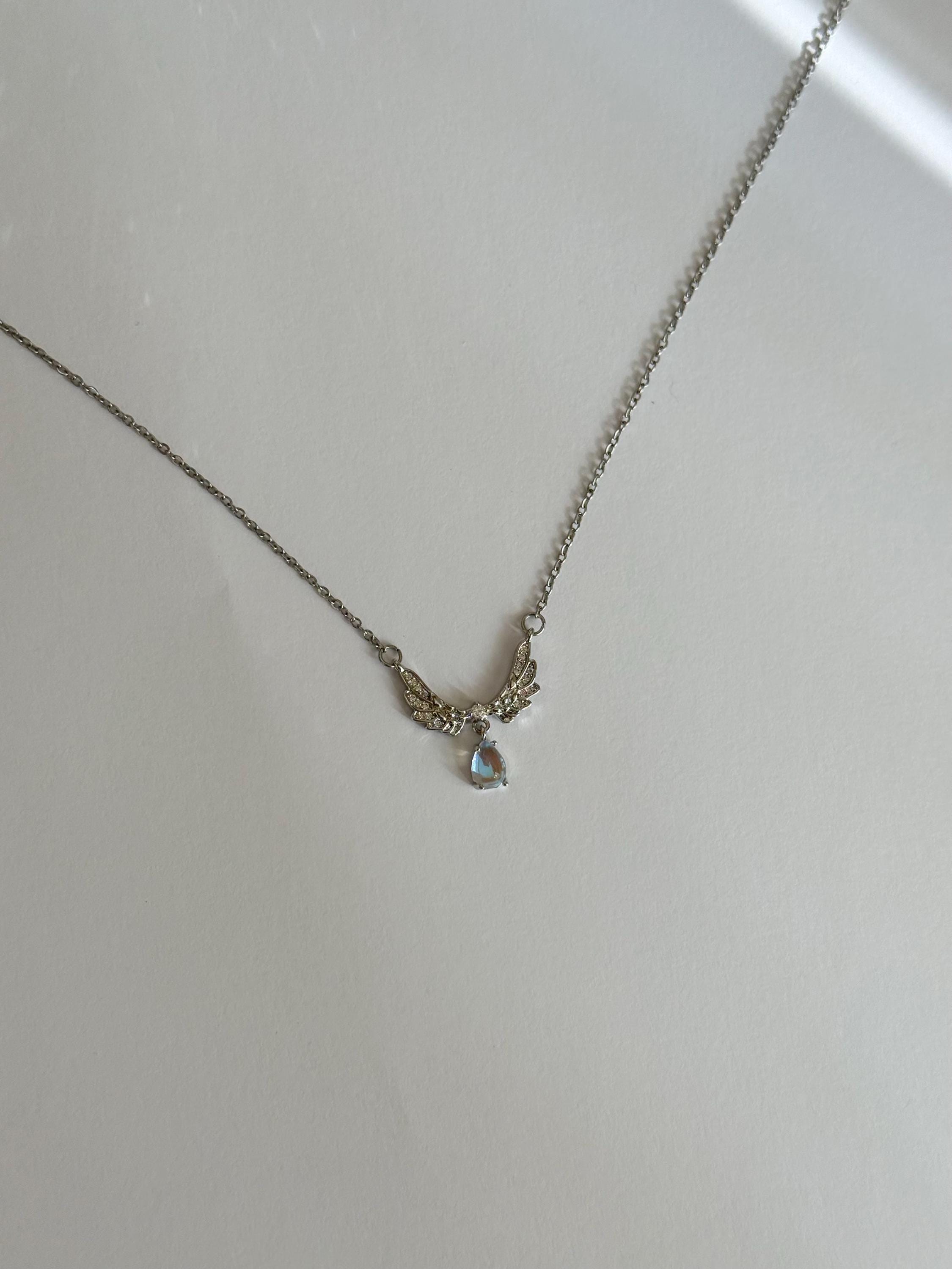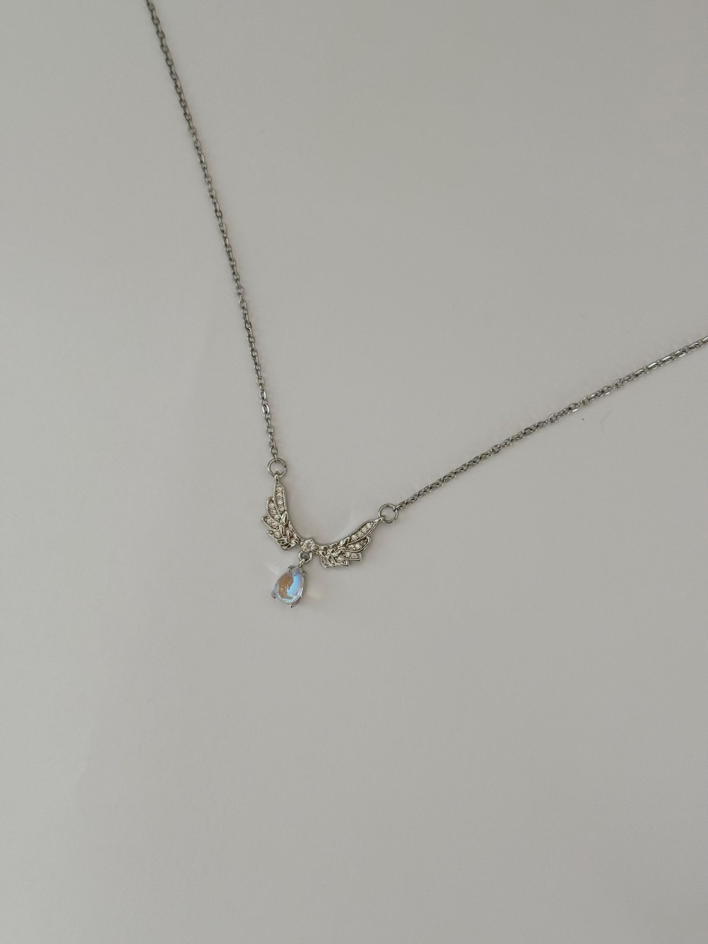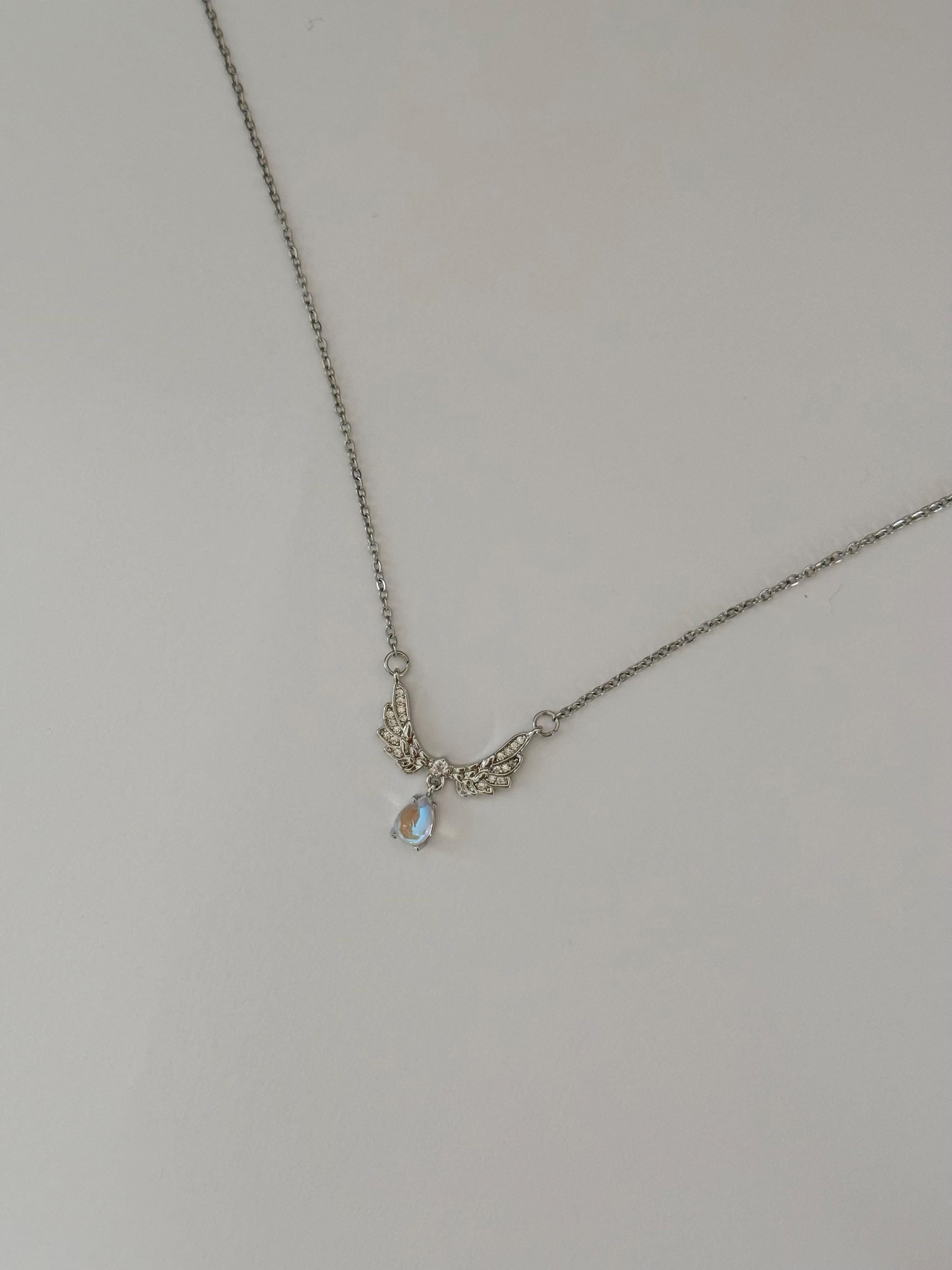 A delicate angel wing necklace featuring detailed silver wings and a shimmering teardrop opal-style pendant.