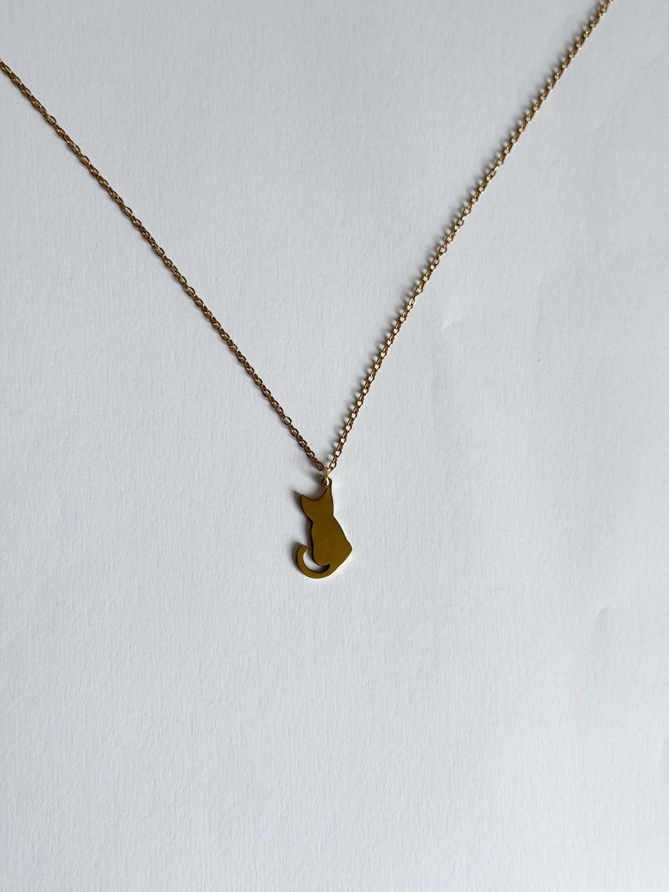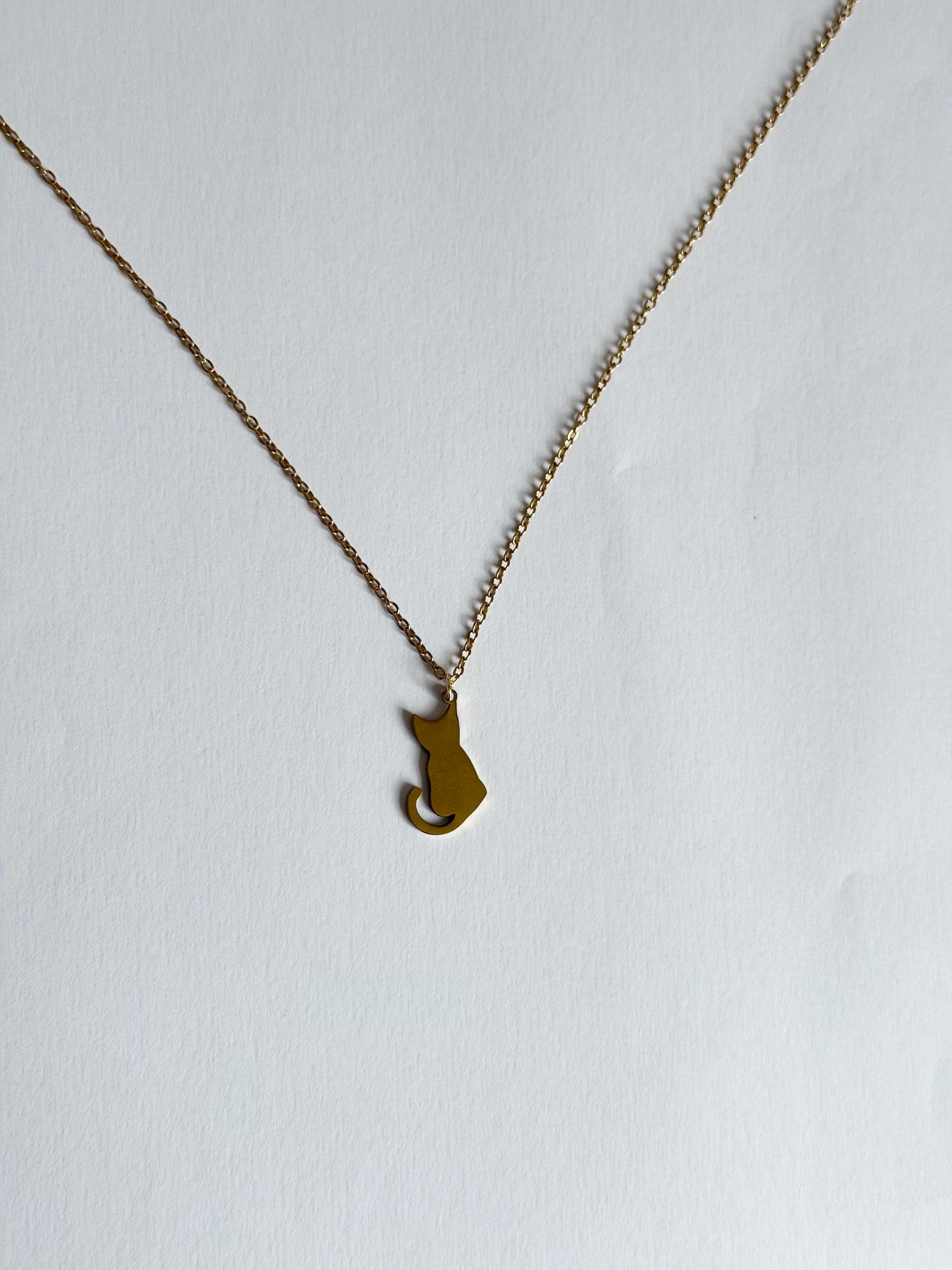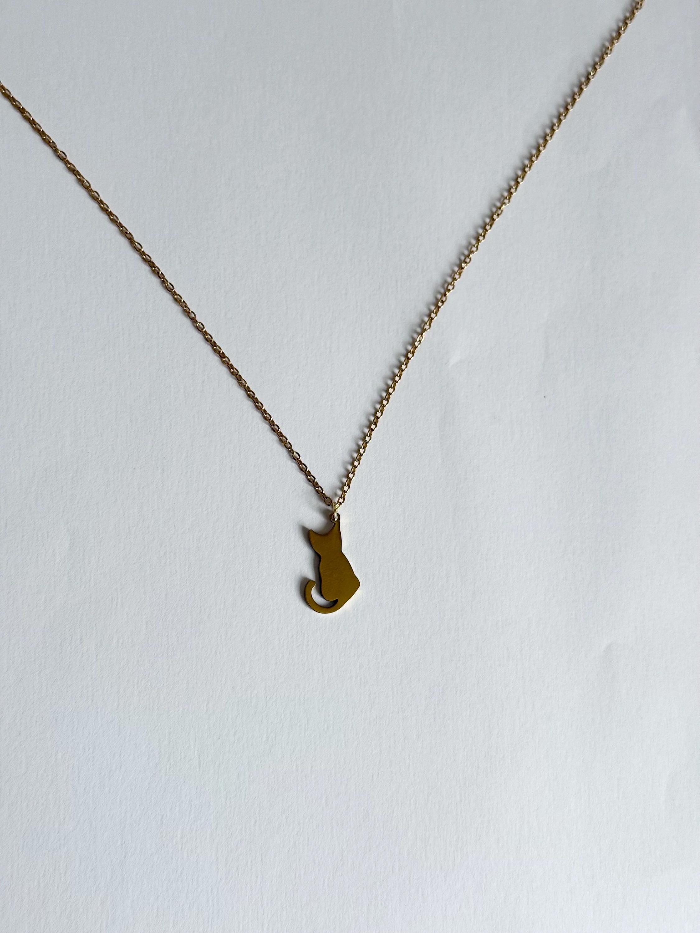 A cute and minimal cat silhouette necklace crafted from stainless steel in a gold finish.