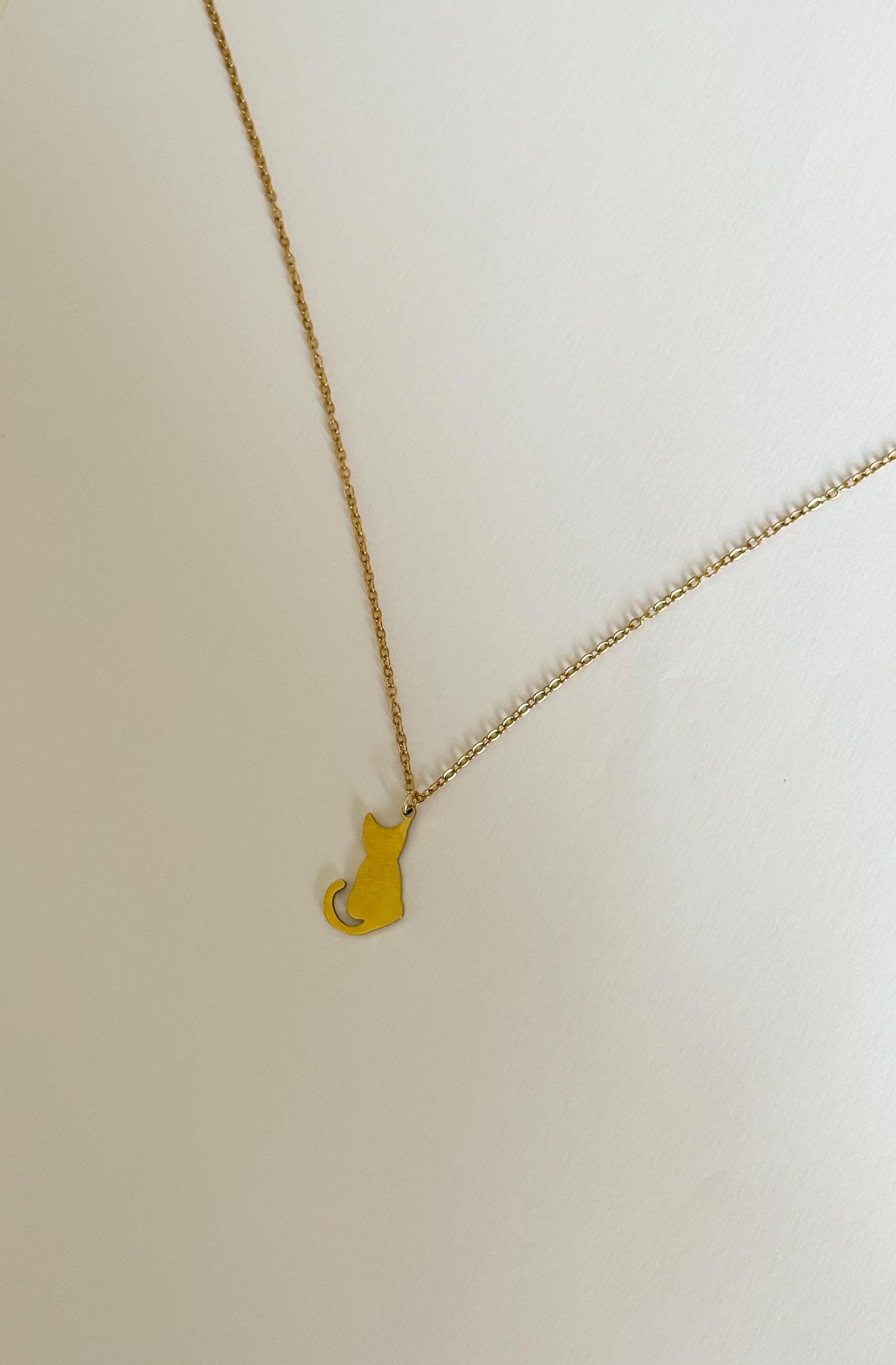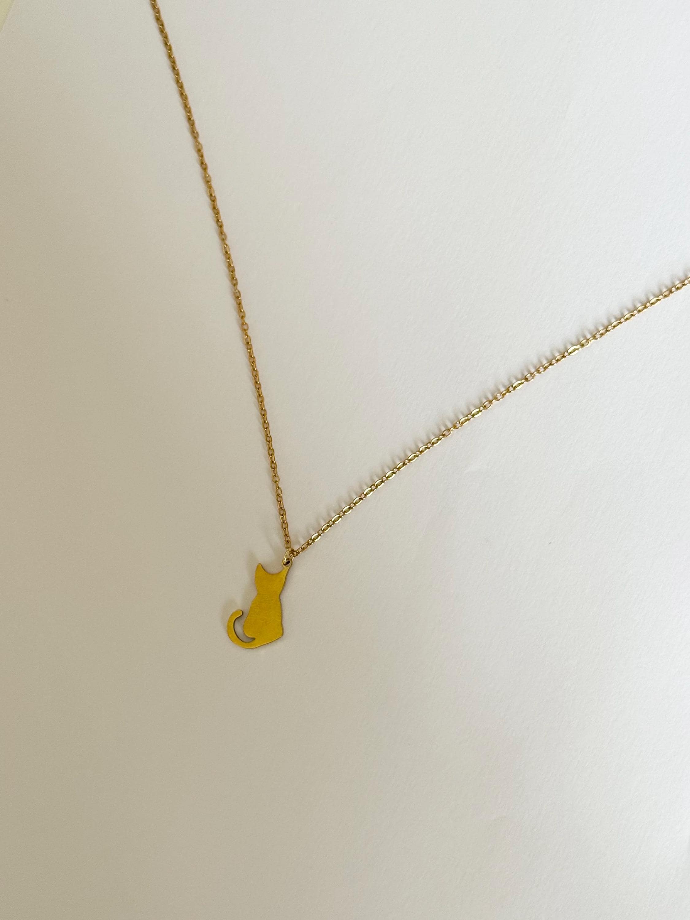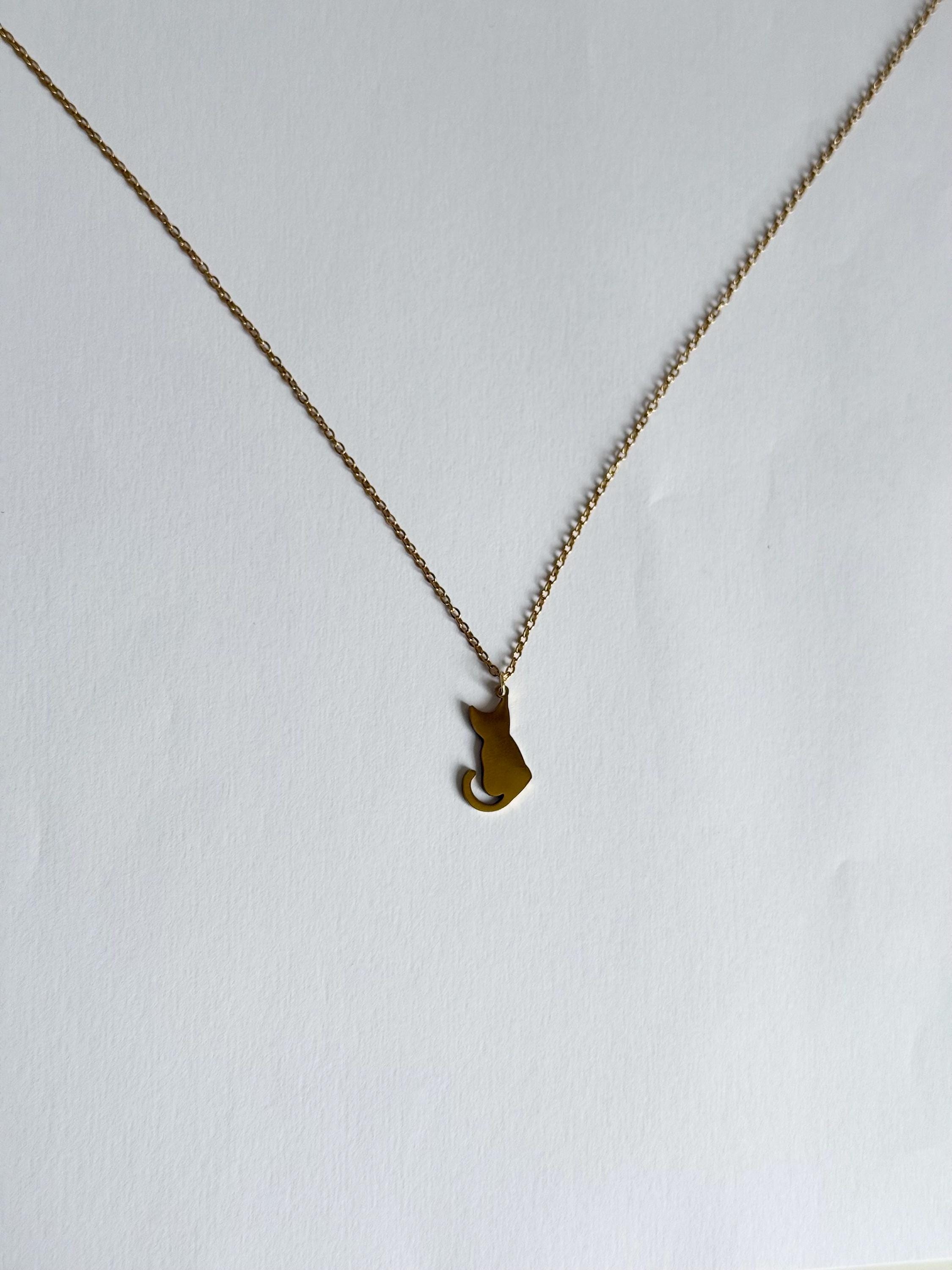 A cute and minimal cat silhouette necklace crafted from stainless steel in a gold finish.