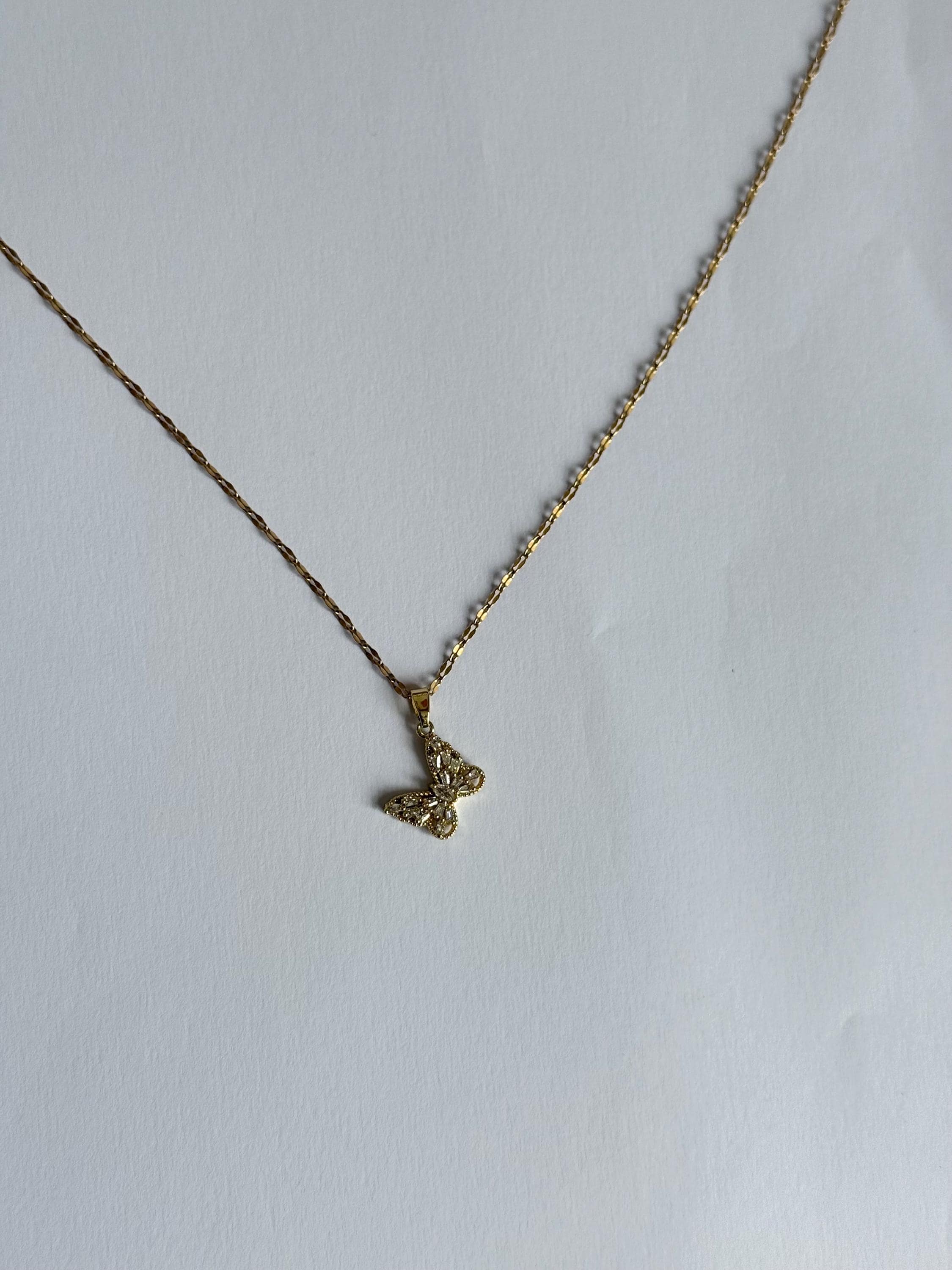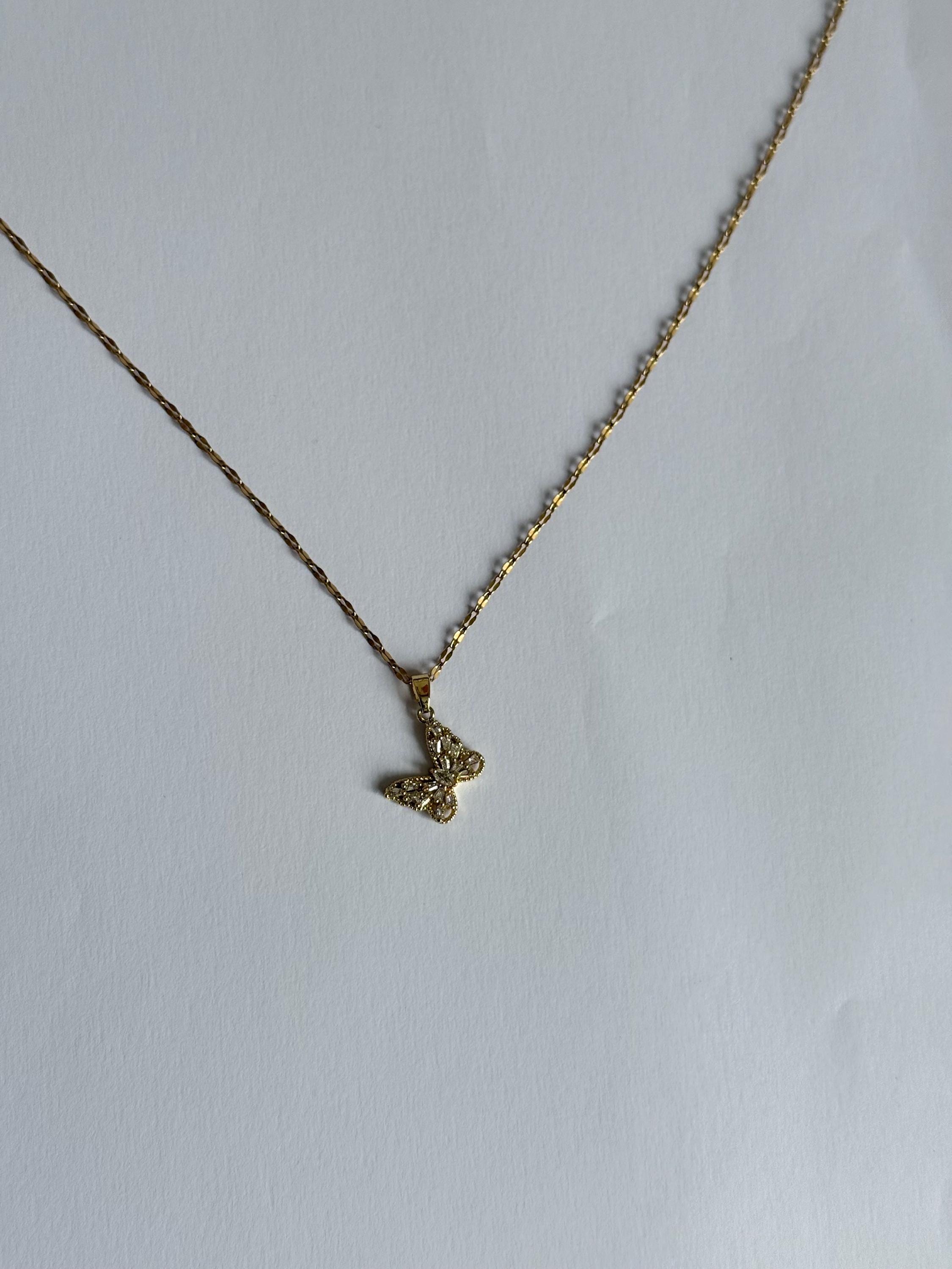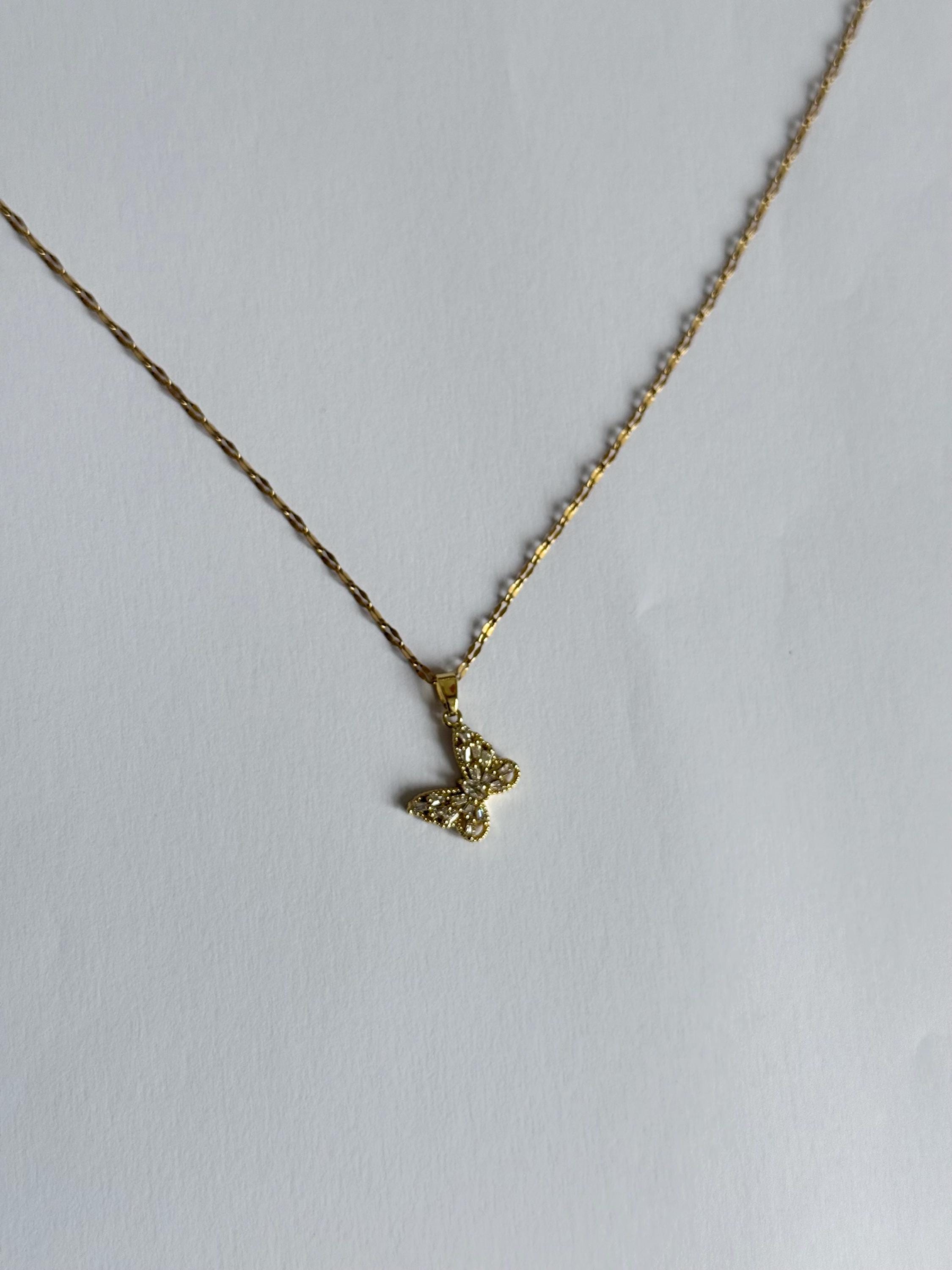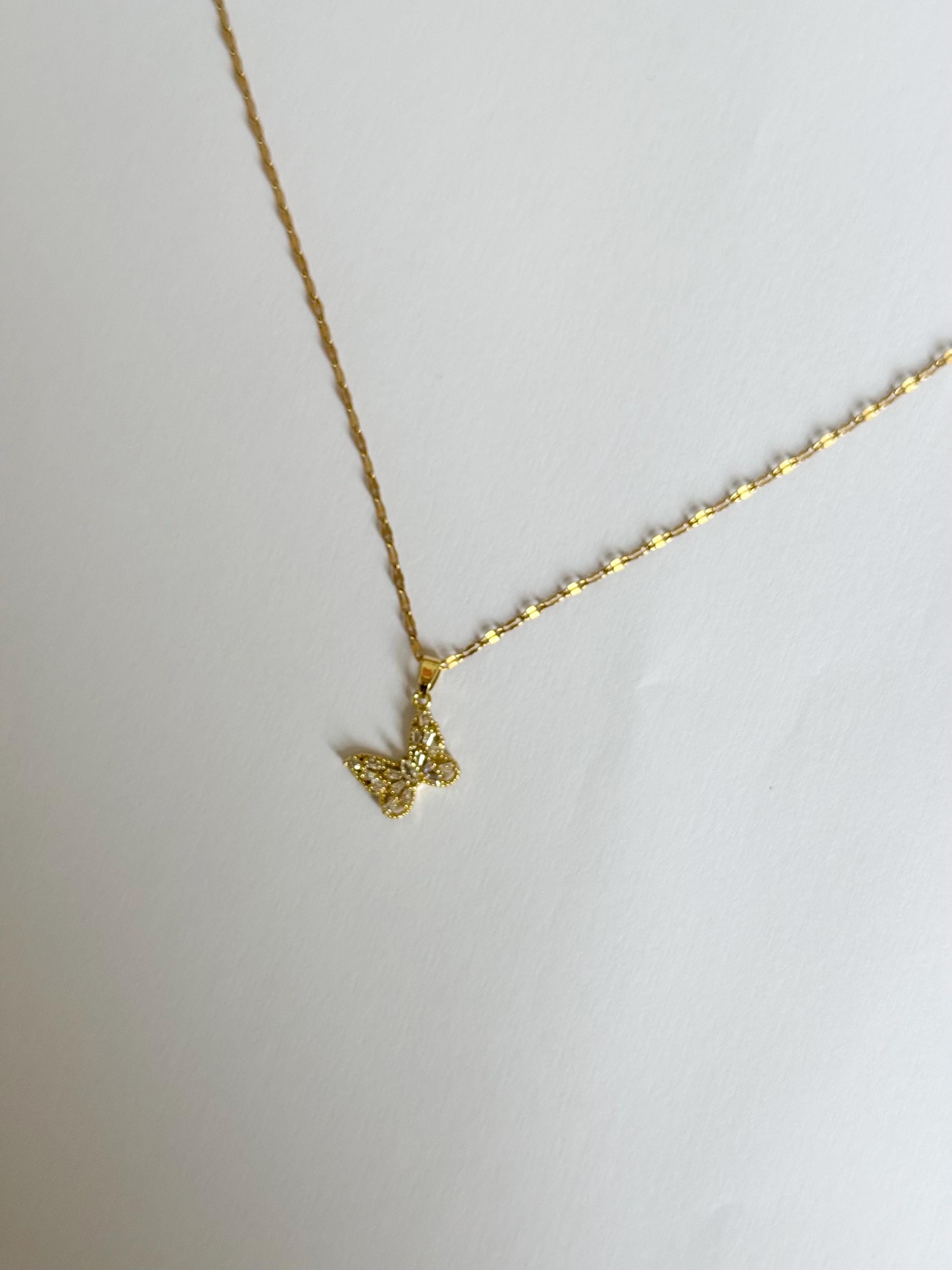 A delicate gold butterfly necklace featuring a sparkling zircon-style design that catches the light beautifully.