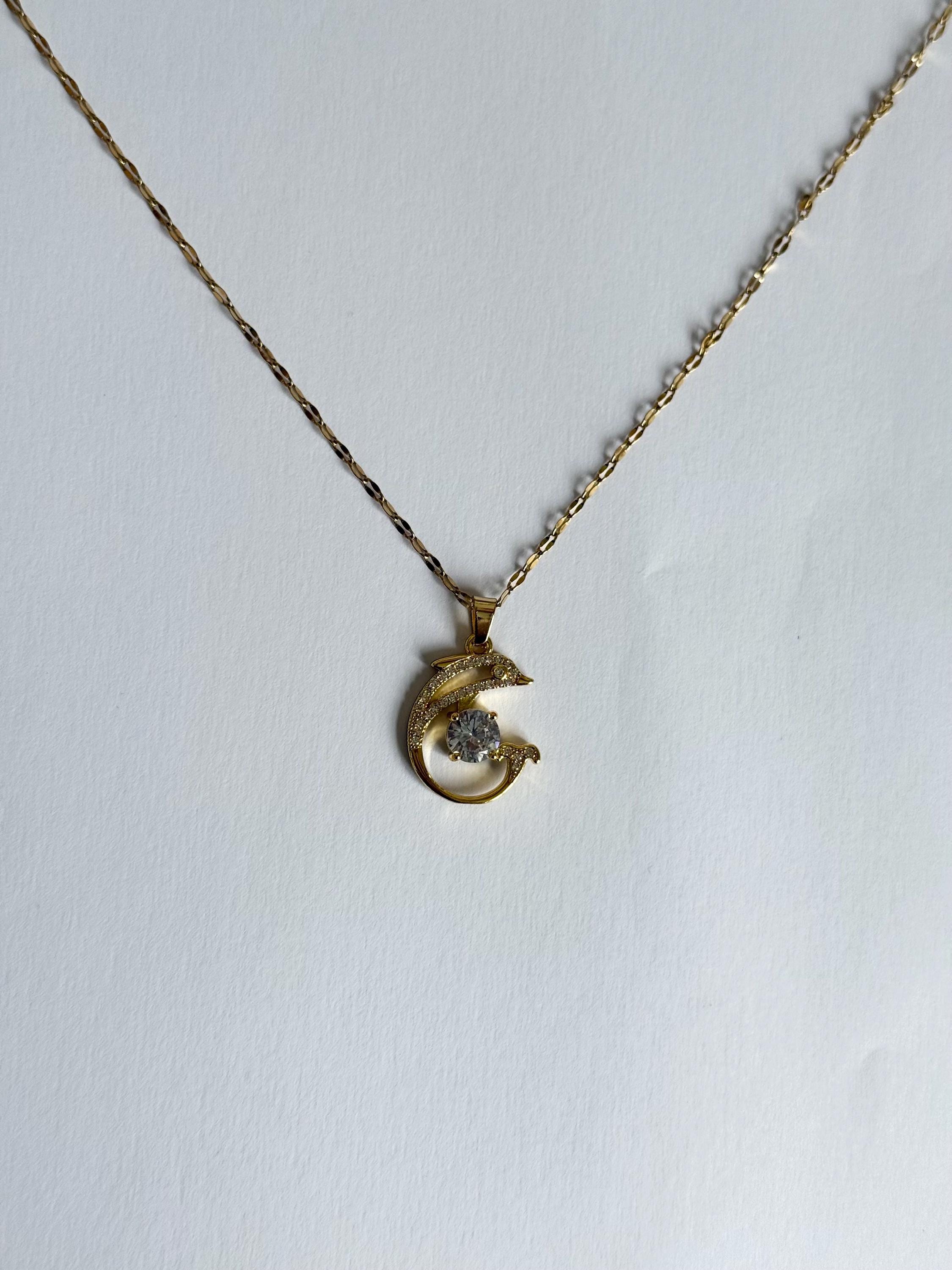A beautiful gold dolphin necklace featuring a sparkling round zircon stone embraced by an elegant dolphin design.
